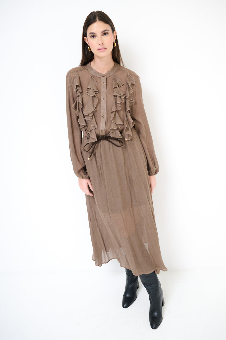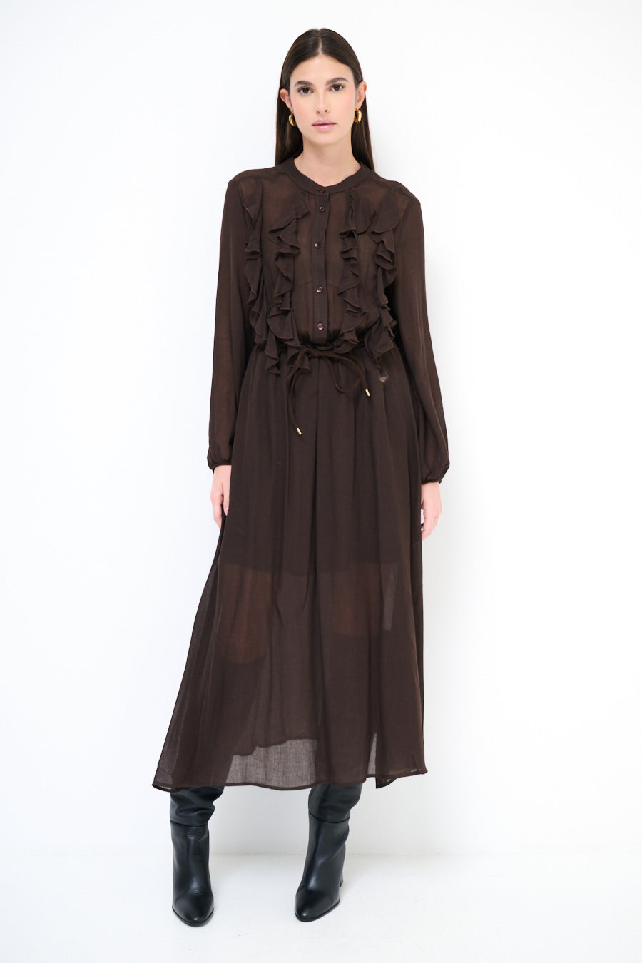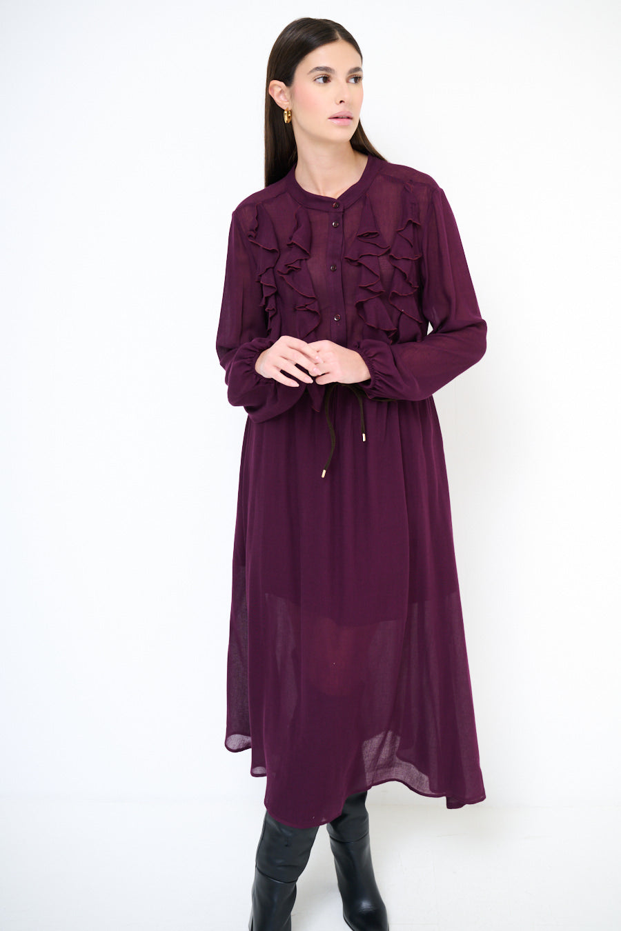 - Długie rękawy z marszczonymi mankietami podkreślają elegancki fason sukienki