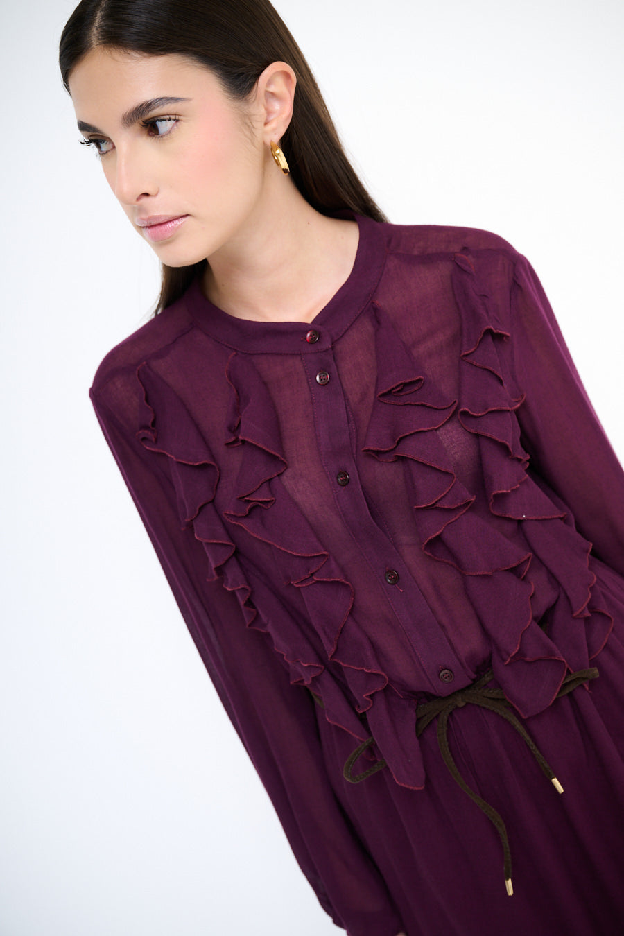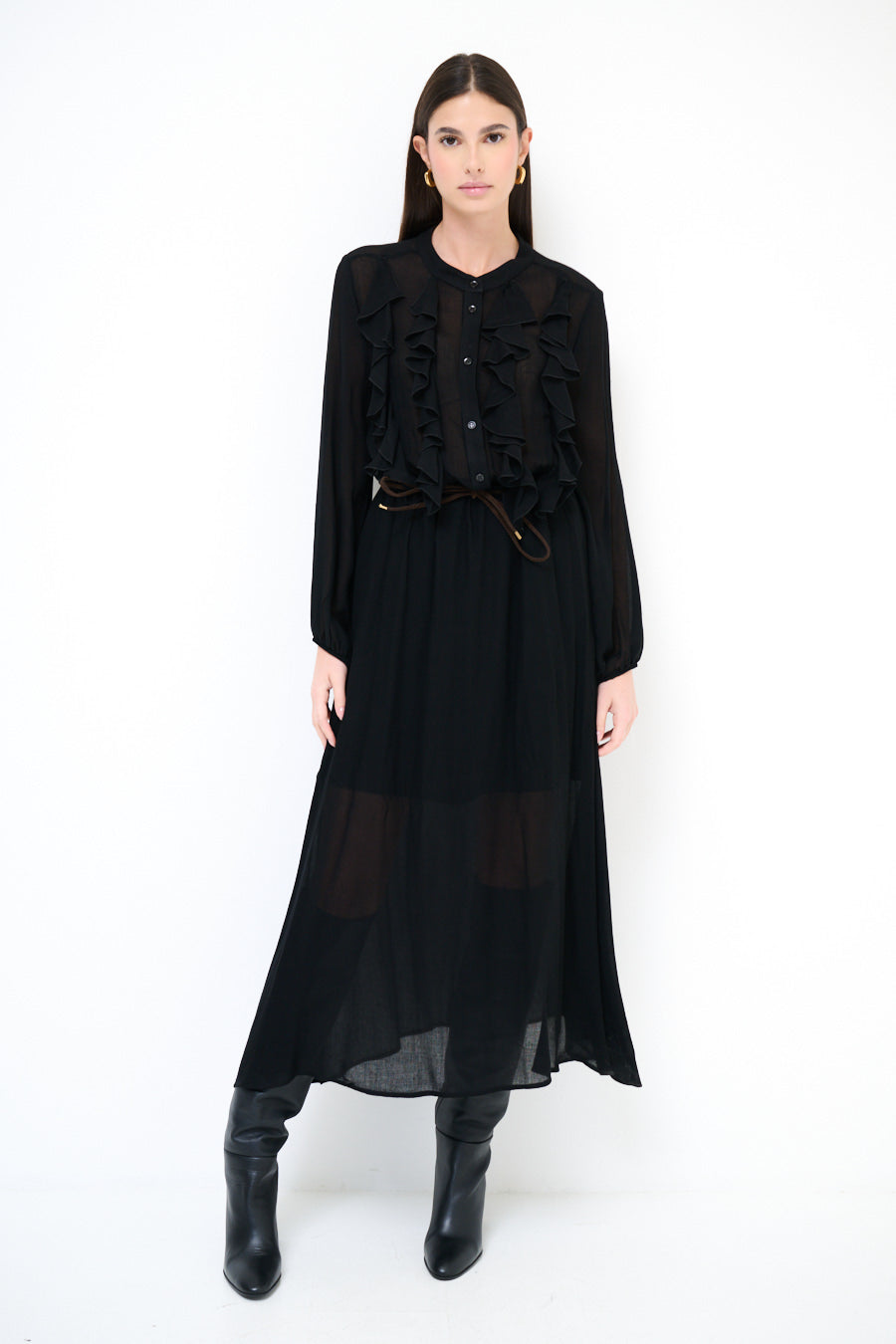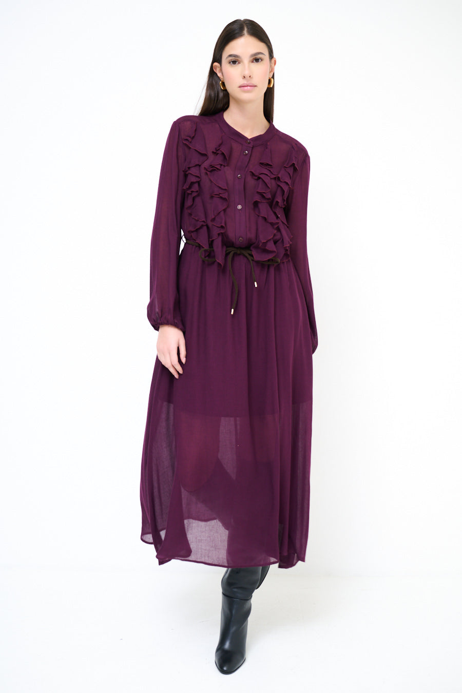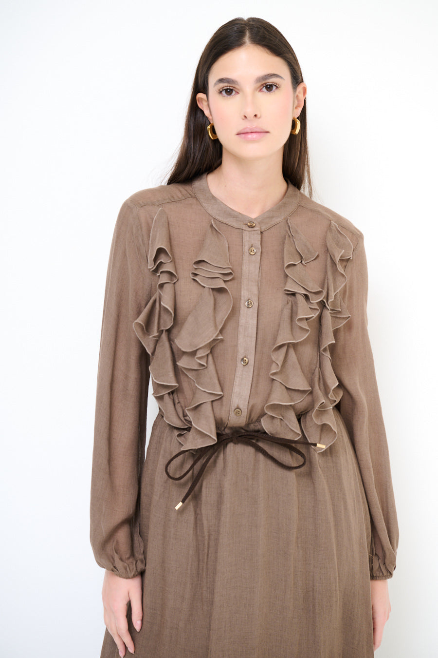 - Długie rękawy z marszczonymi mankietami podkreślają elegancki fason sukienki