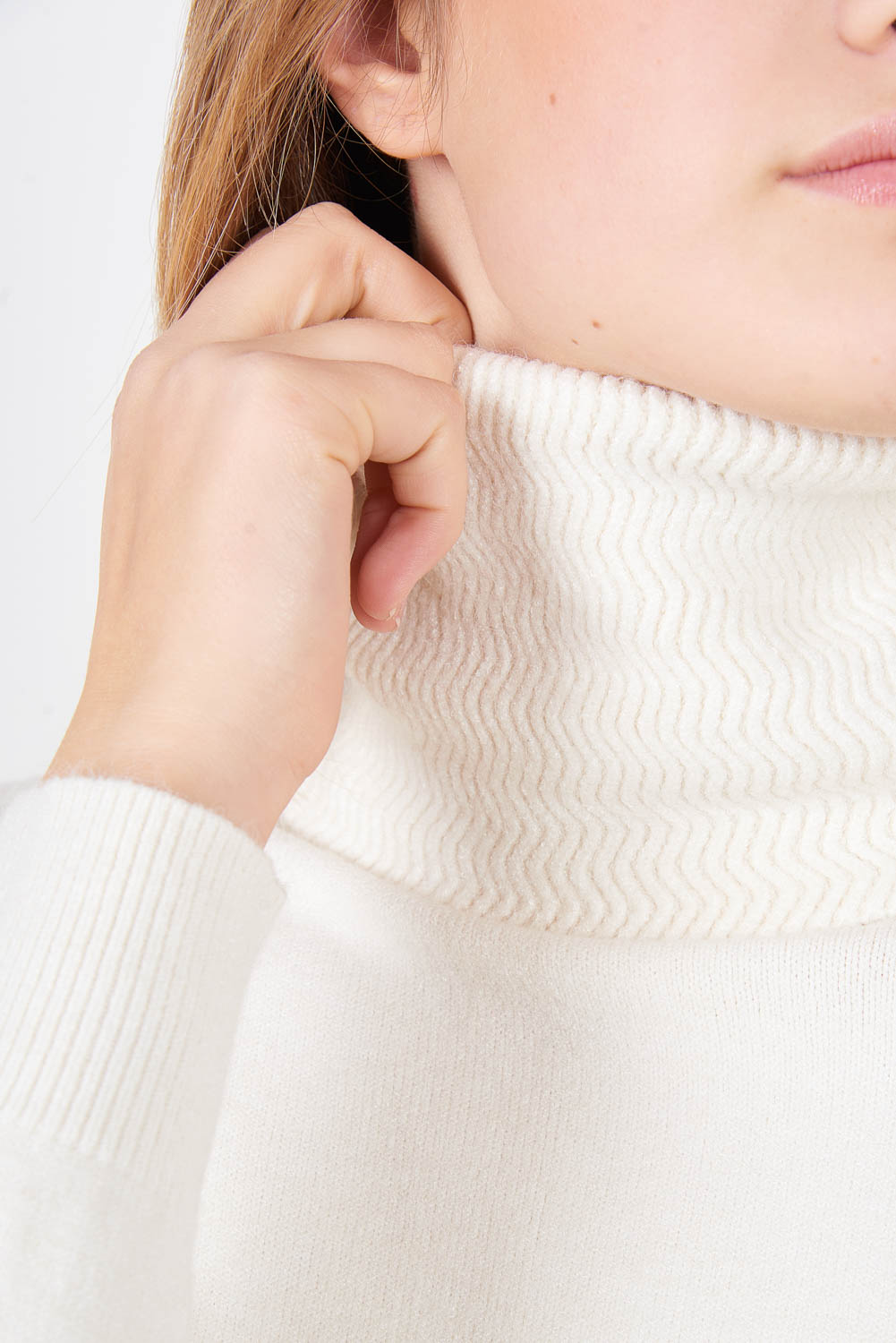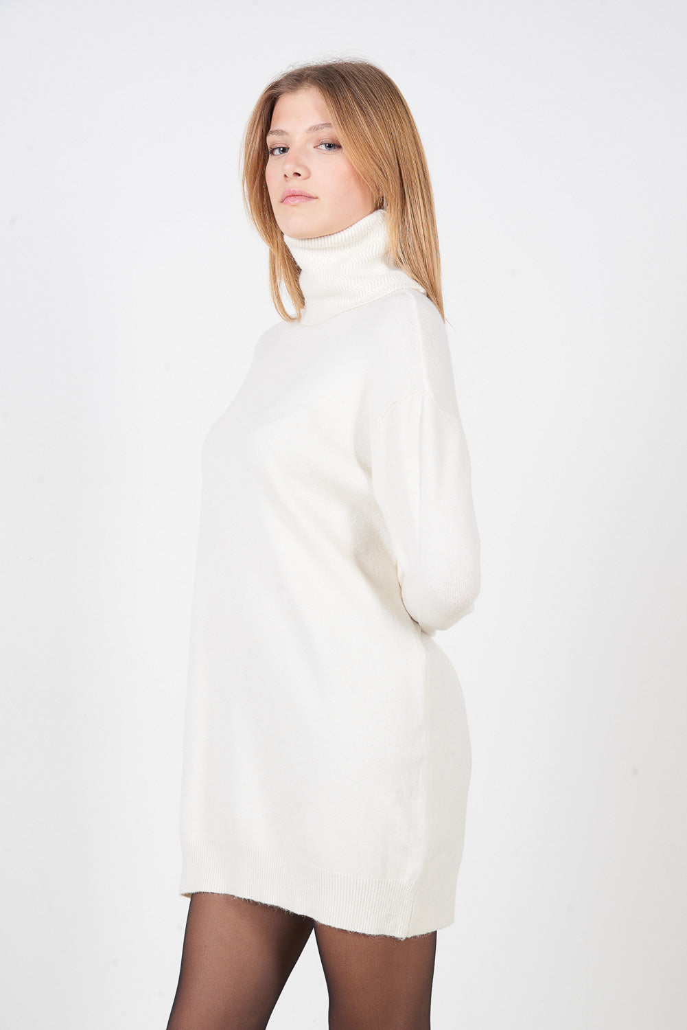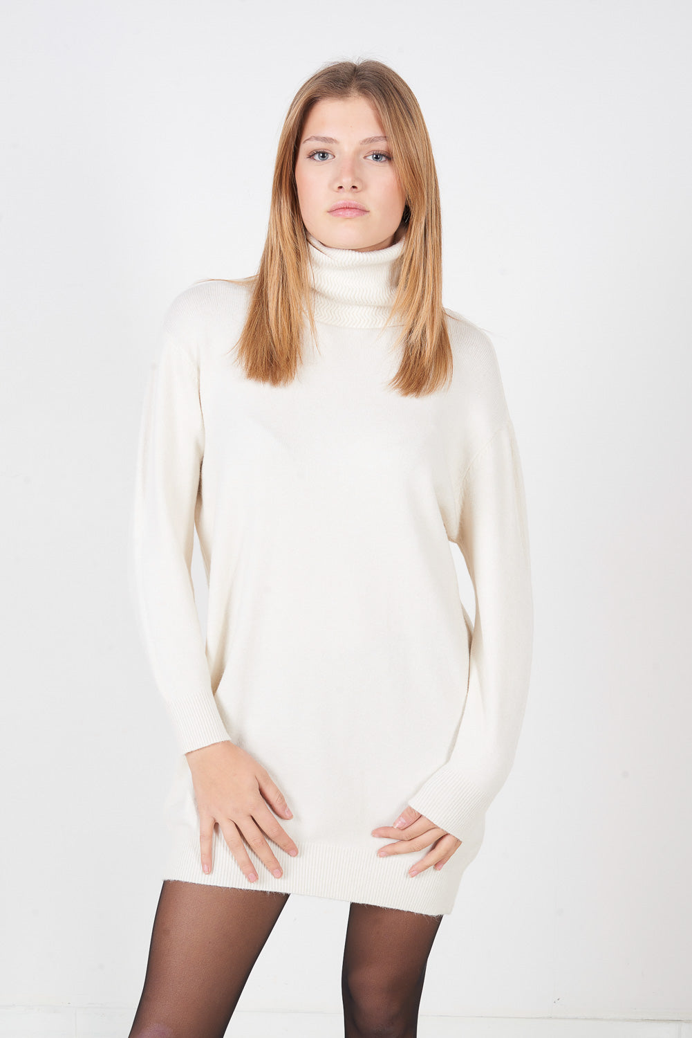 Sprzedam hurtową dopasowaną dzianinową mini sukienkę z wysokim dekoltem i długim rękawem