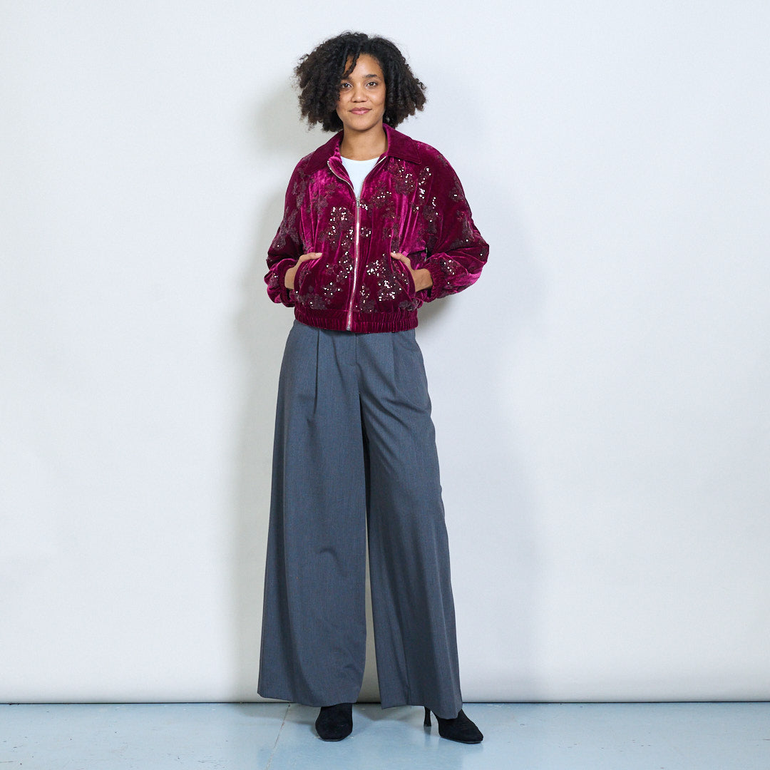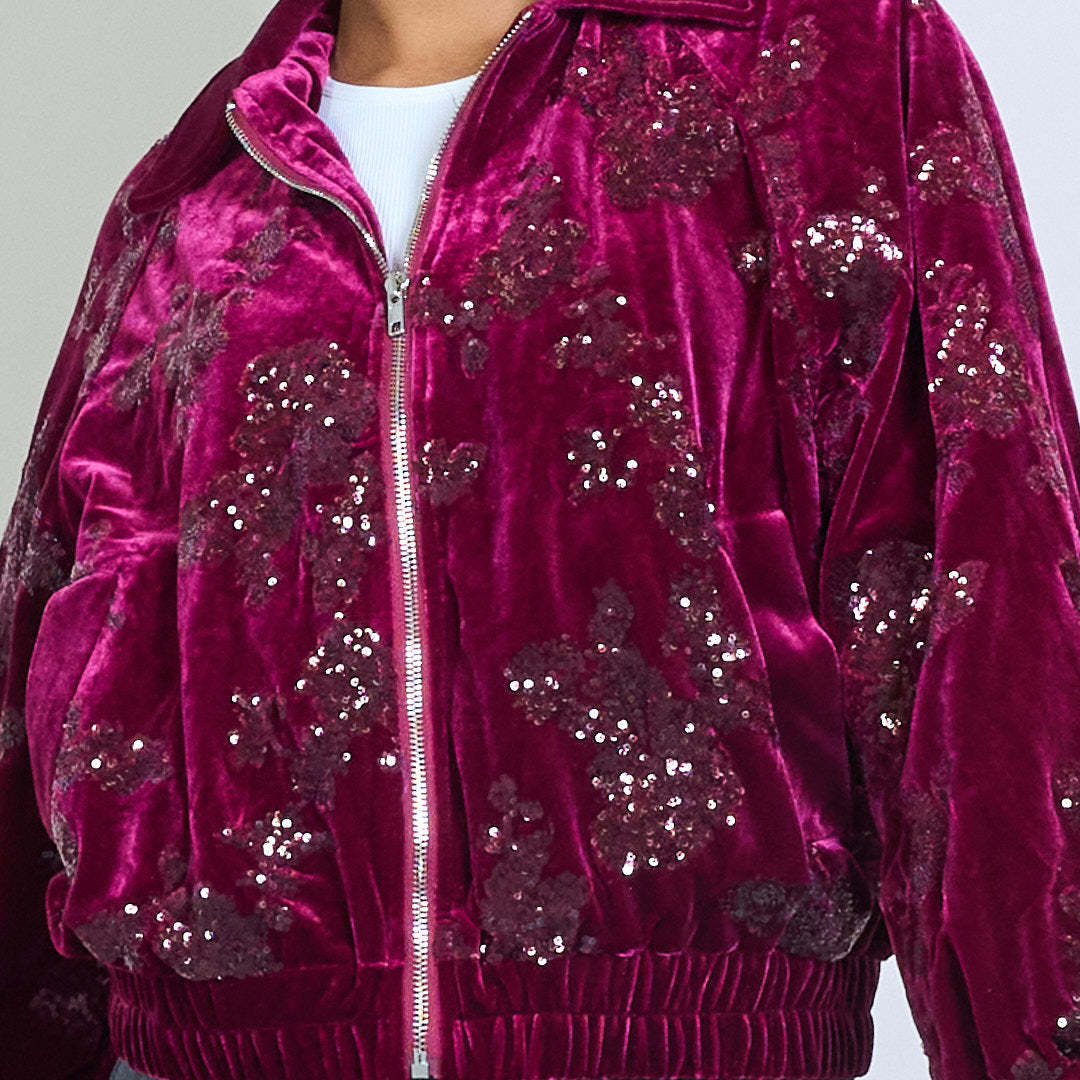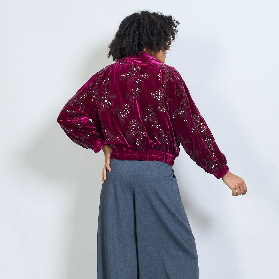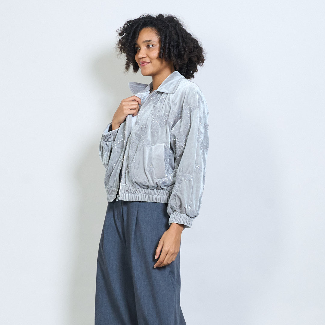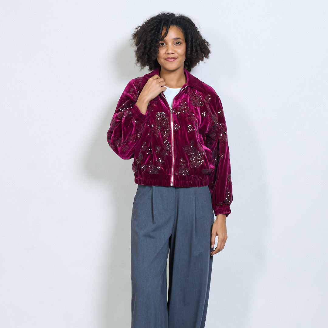 - Elegancka kurtka w stylu bombowca z miękkim aksamitnym wykończeniem
