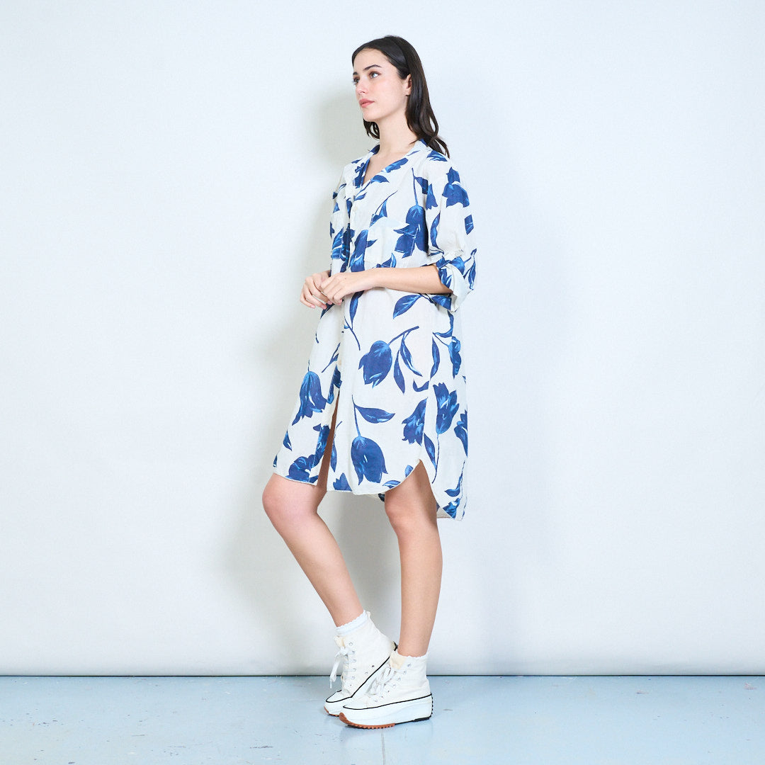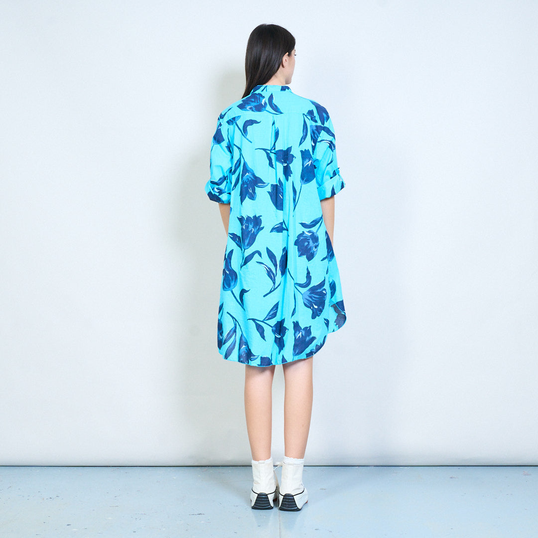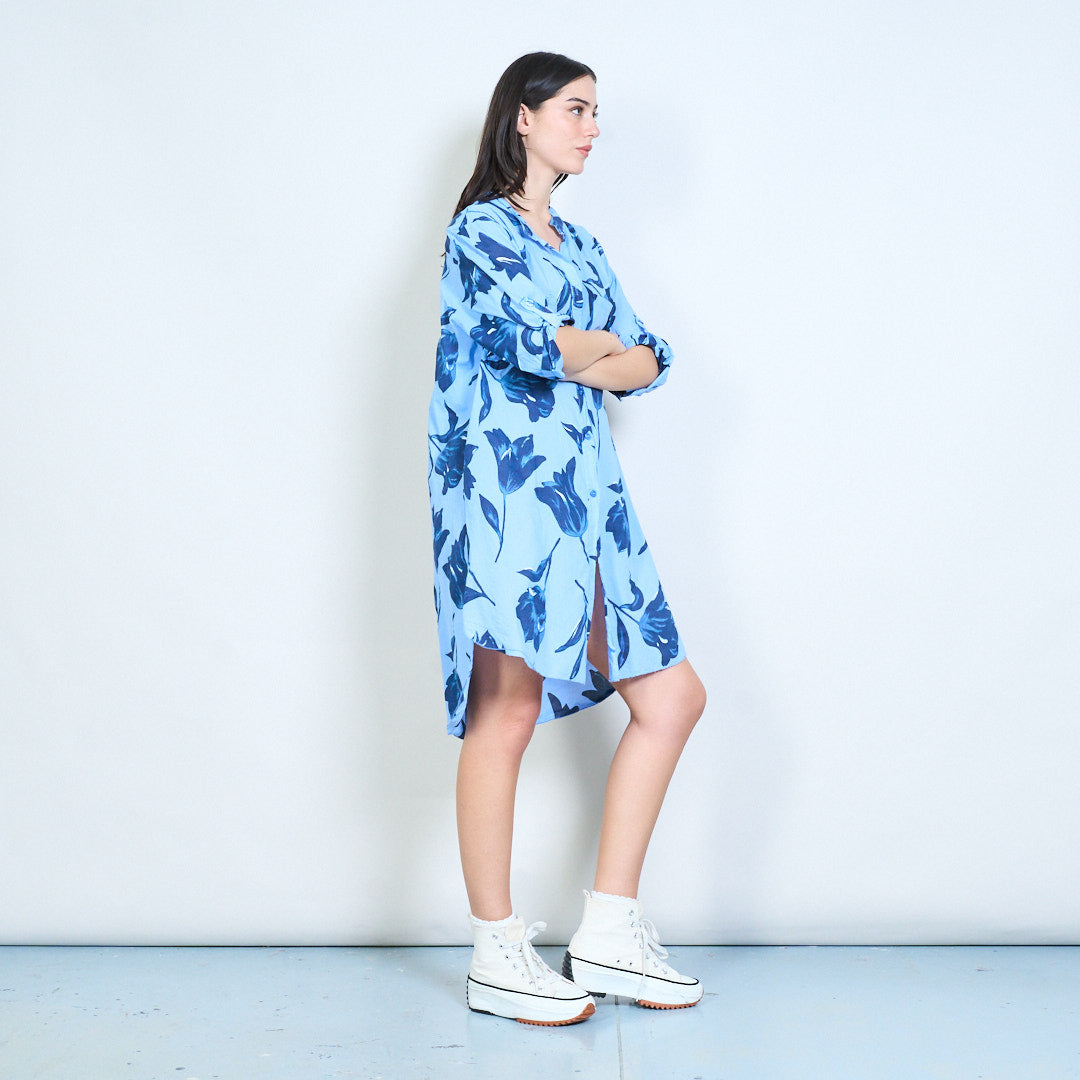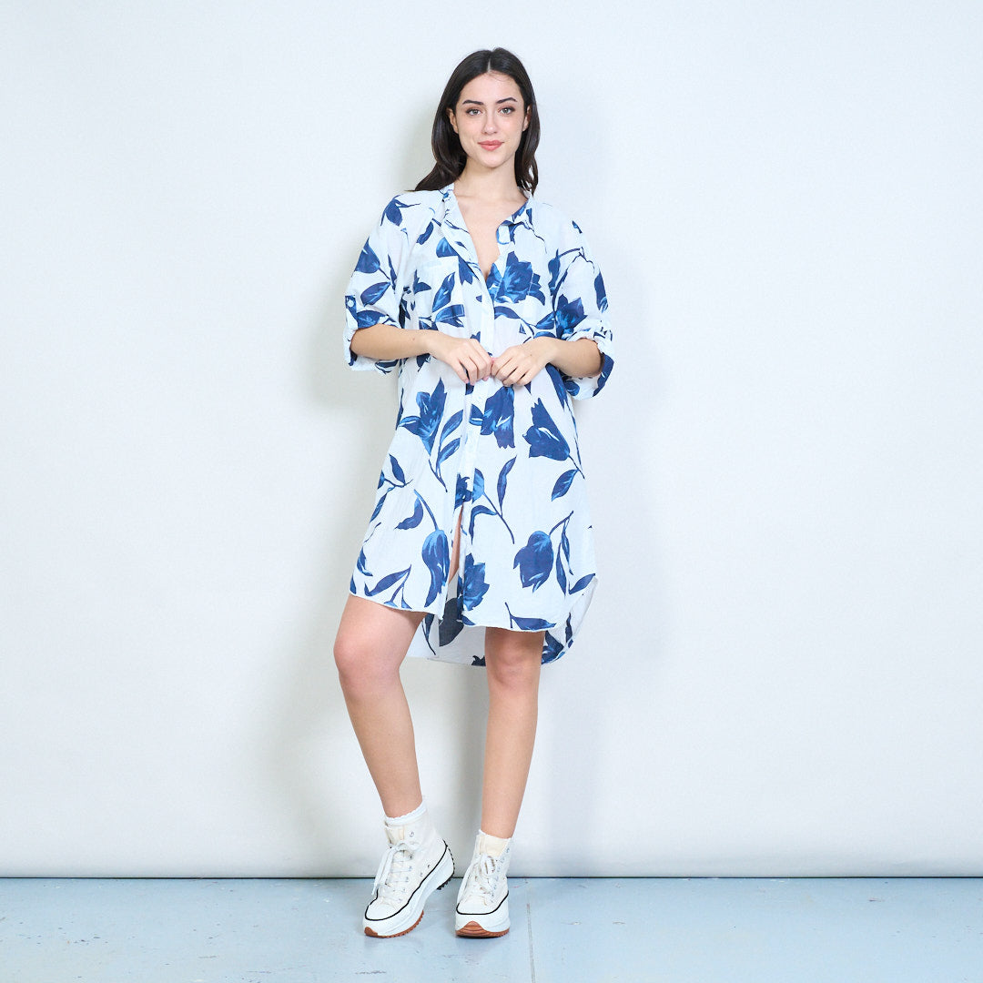 Sprzedam hurtową koszulę o długim kroju z kwiatowym nadrukiem i zapinaną na guziki