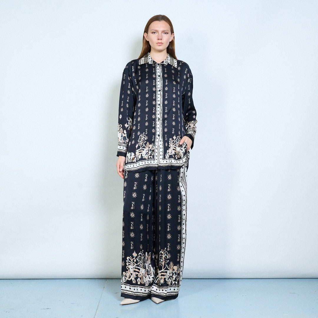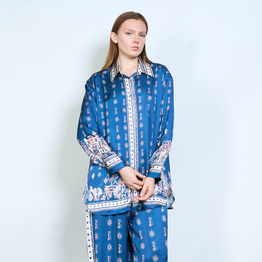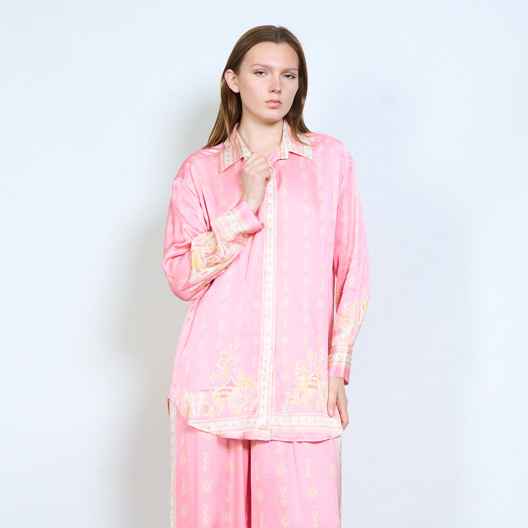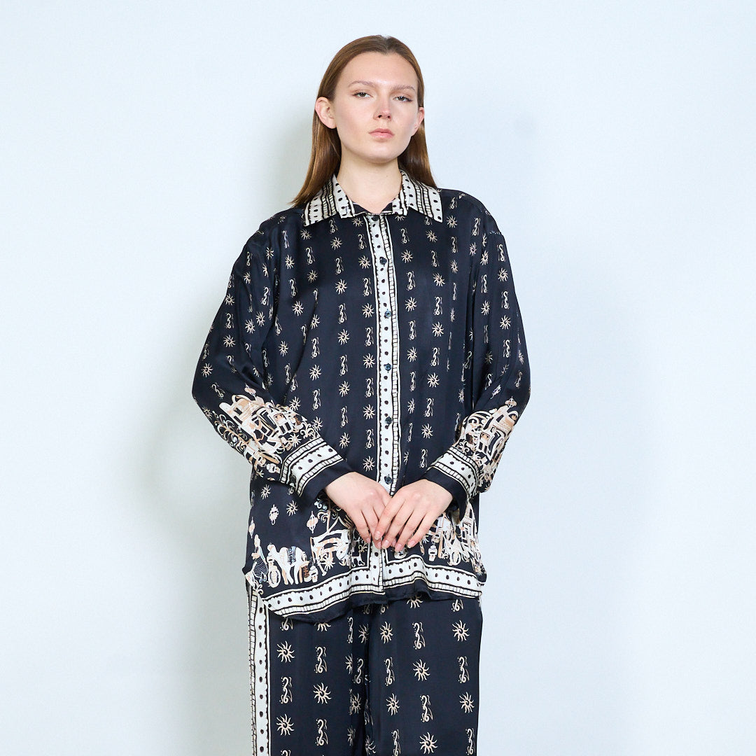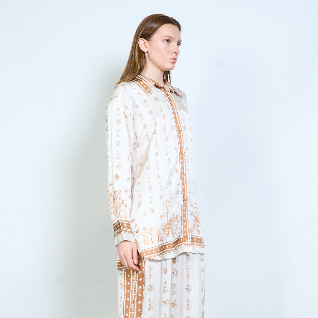 Sprzedam hurtową luźną koszulę z ozdobnymi motywami słońca i paisley, zapinaną z przodu na guziki
