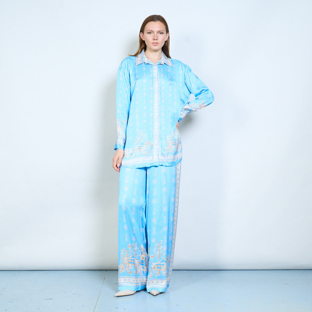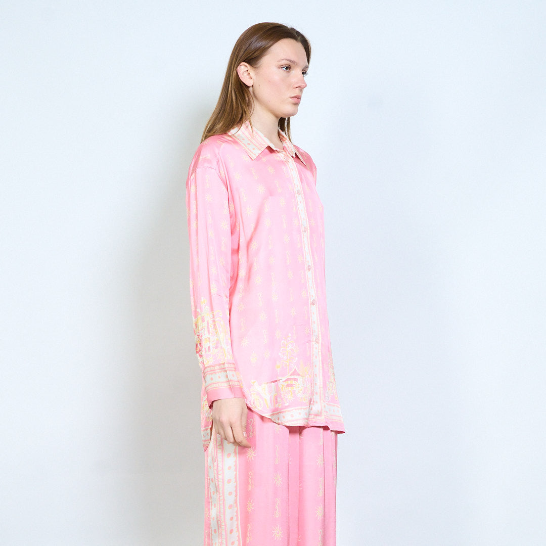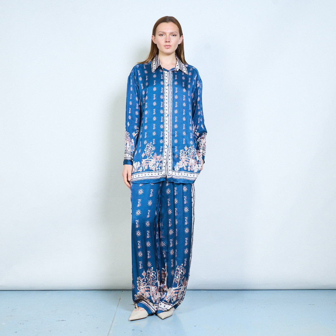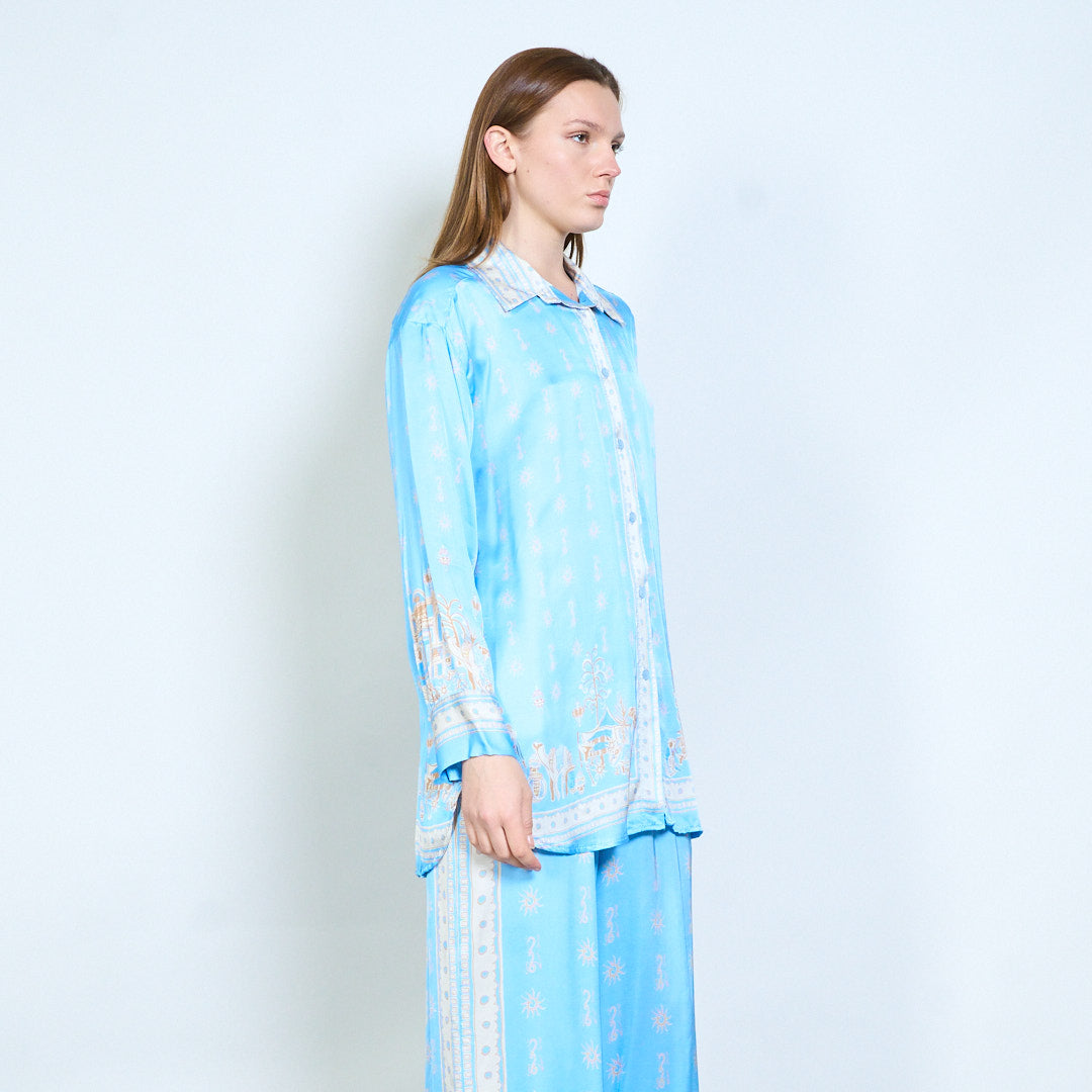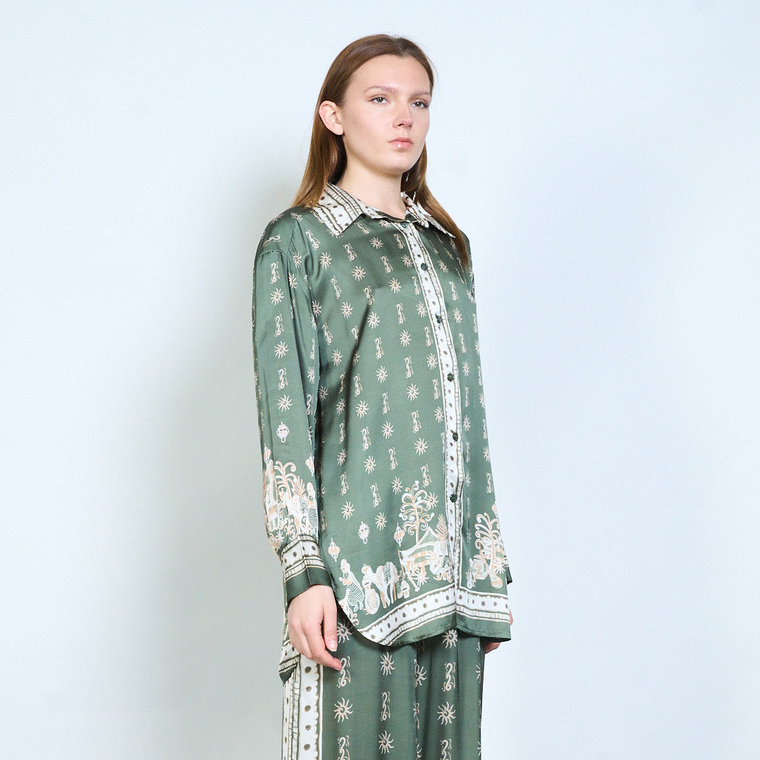 Sprzedam hurtową luźną koszulę z ozdobnymi motywami słońca i paisley, zapinaną z przodu na guziki