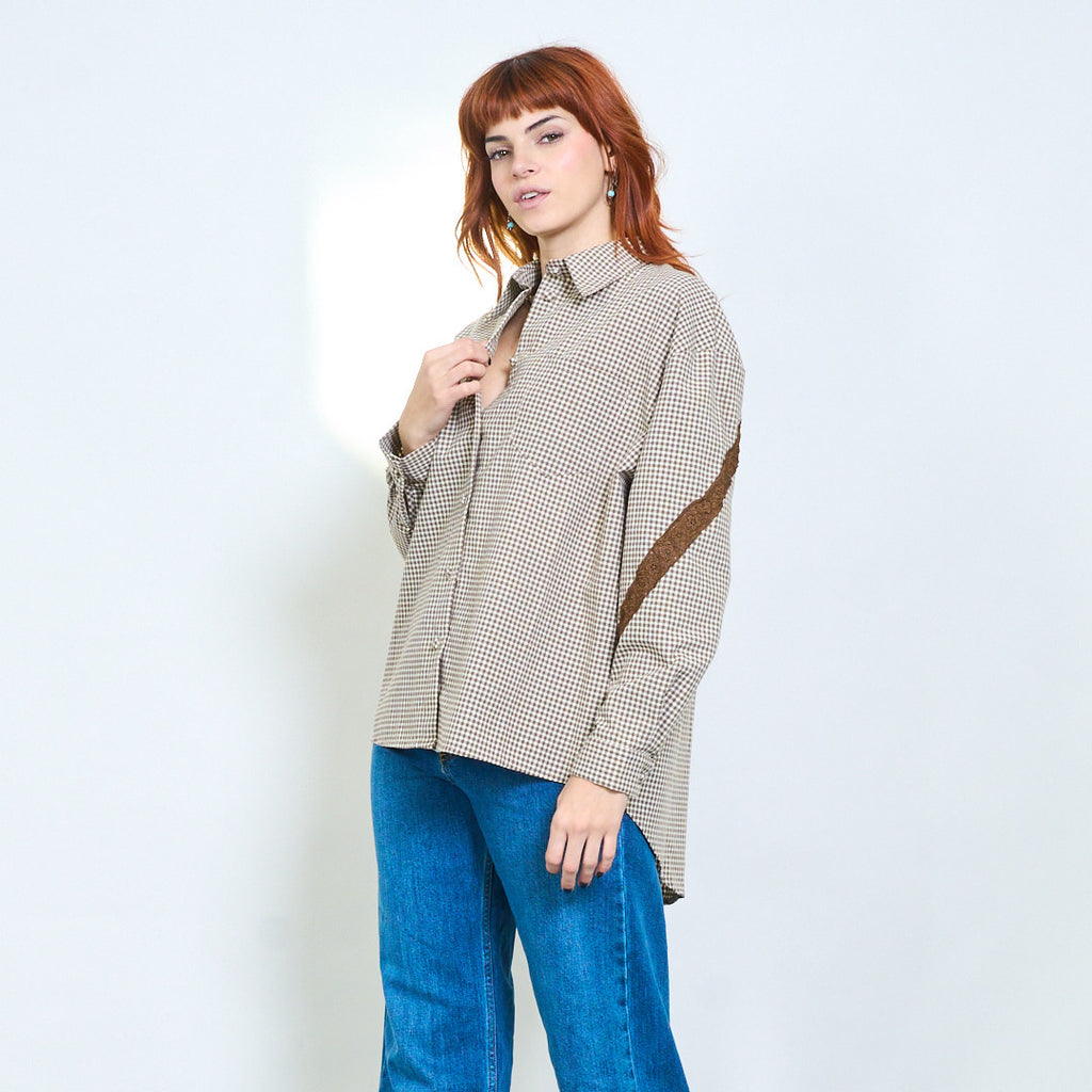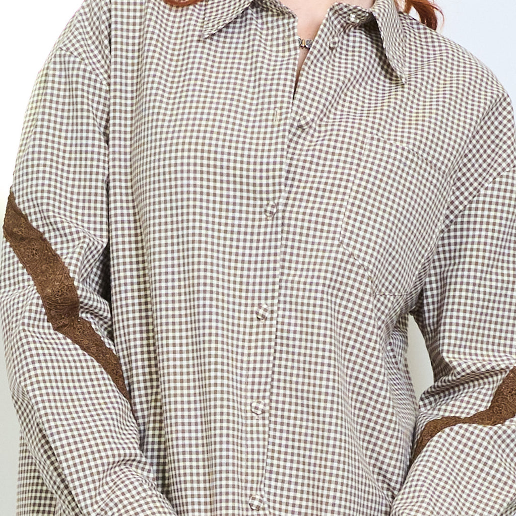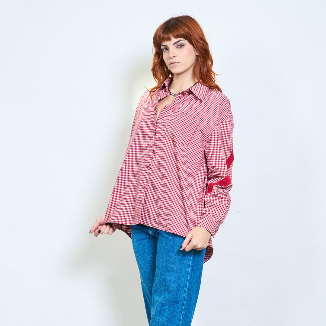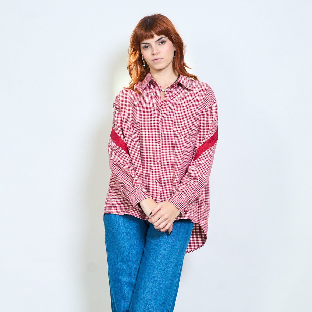 Sprzedam hurtową koszulę zapinaną na guziki z haftowanym wzorem w kratkę „Love”.
