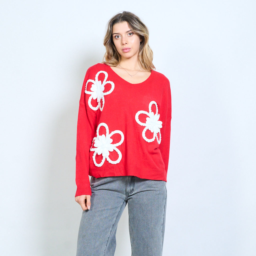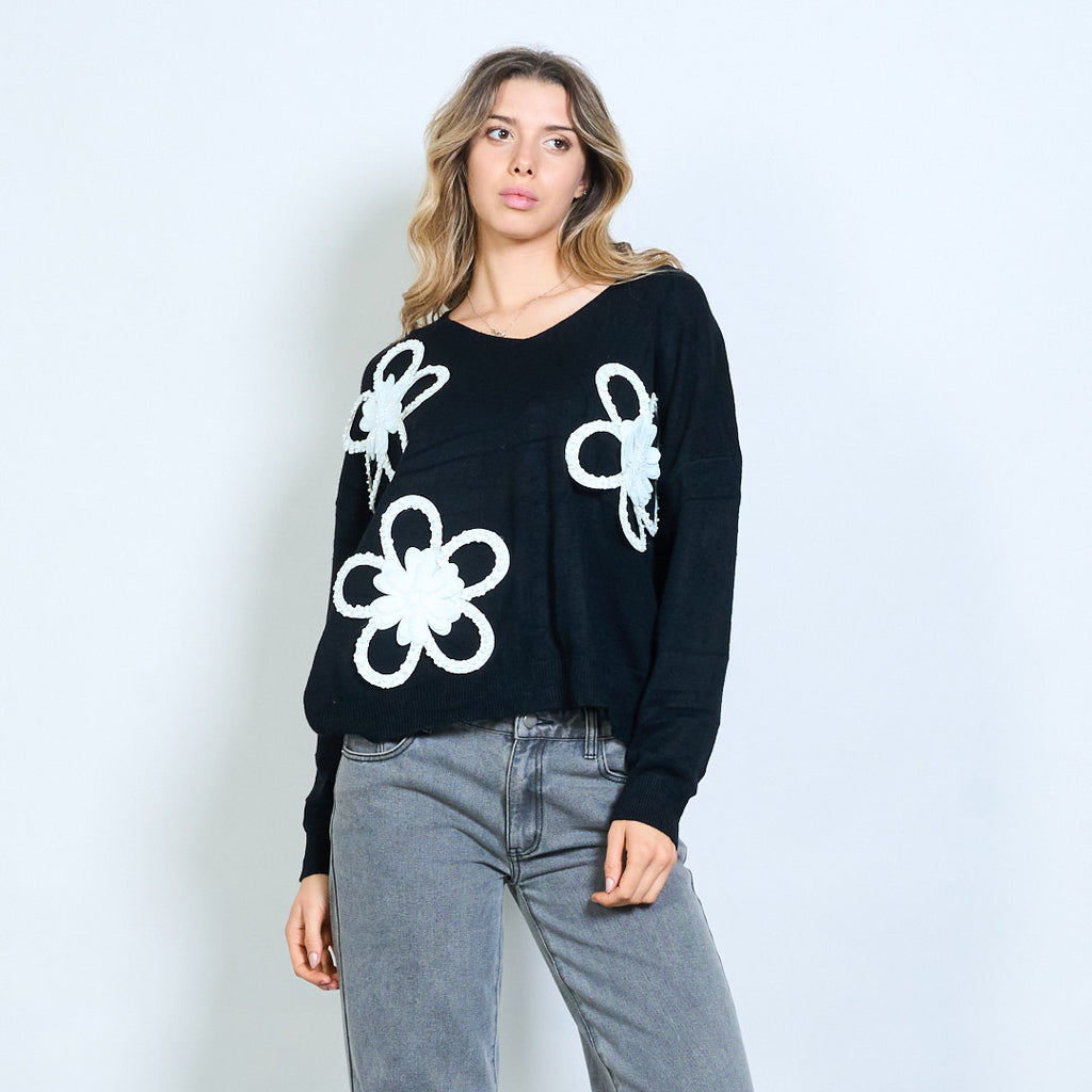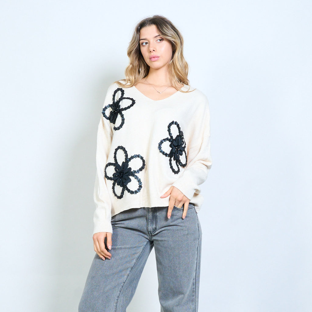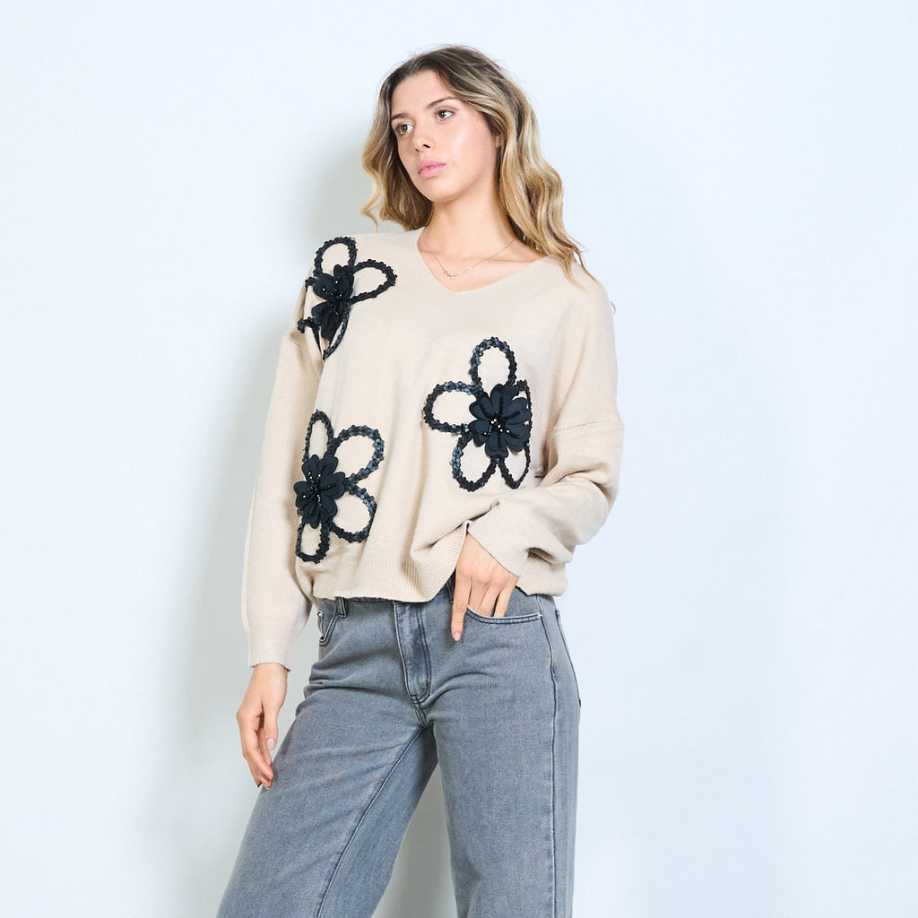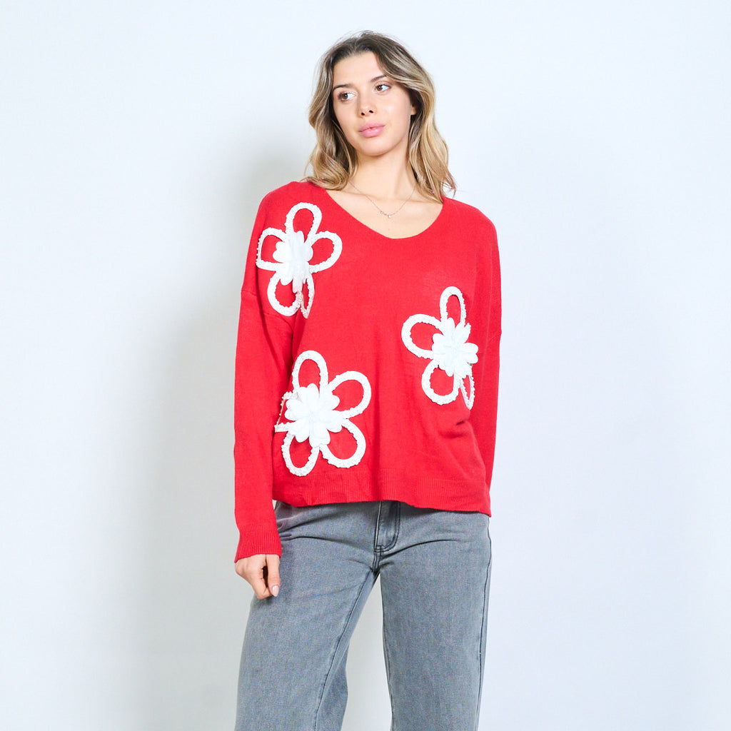 Hurtownia swetrów z dzianiny z kwiatową aplikacją 3D i dekoltem w kształcie litery V