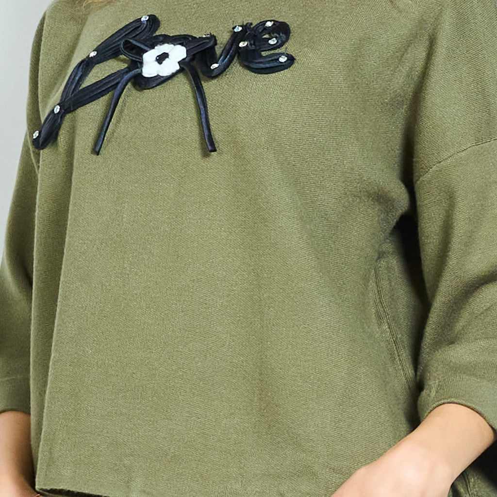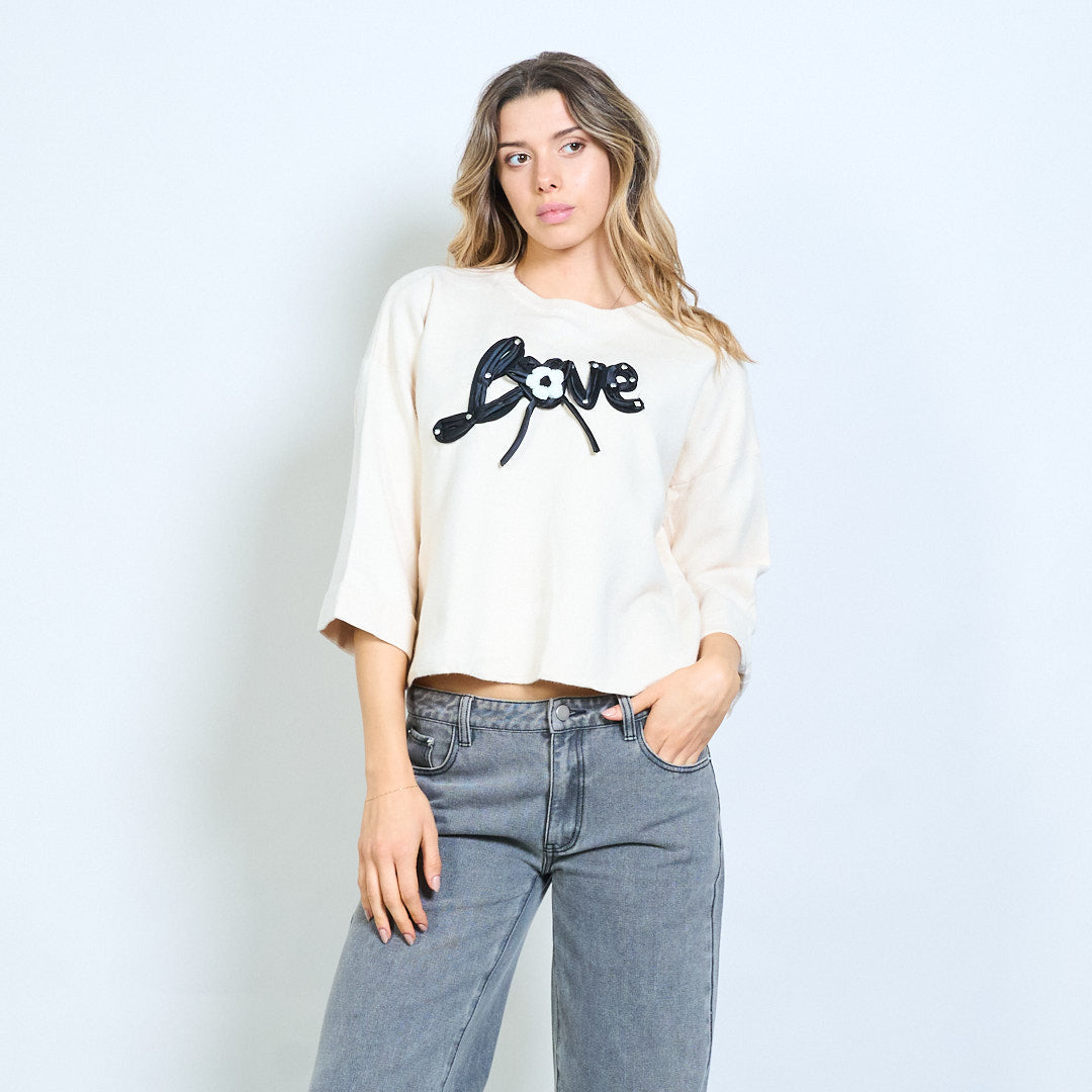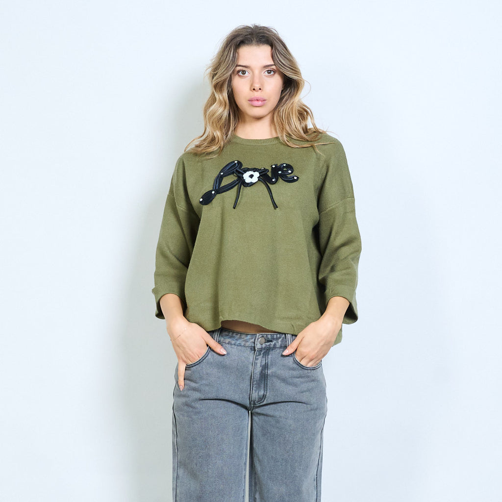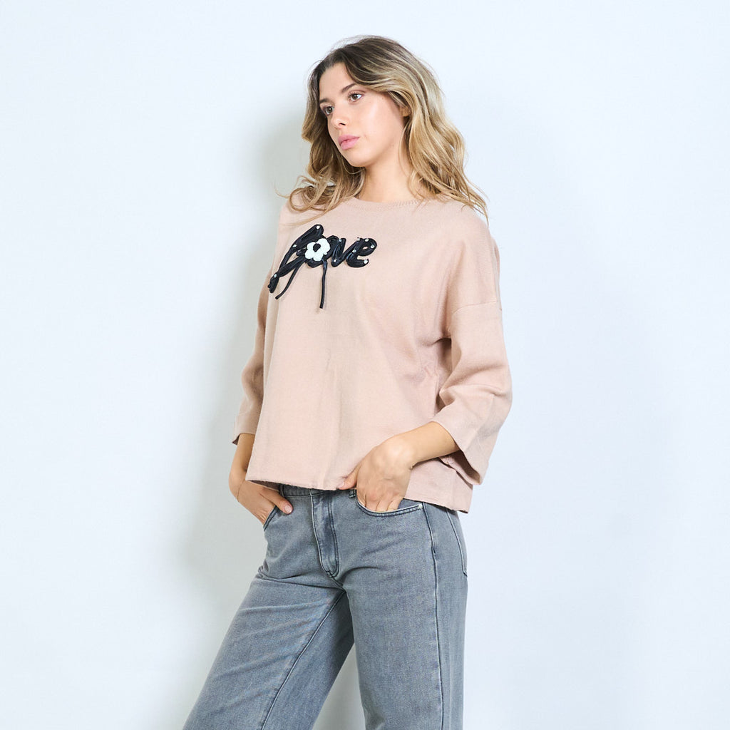 • Sweter z okrągłym dekoltem i odważnym, trójwymiarowym napisem „Love”.