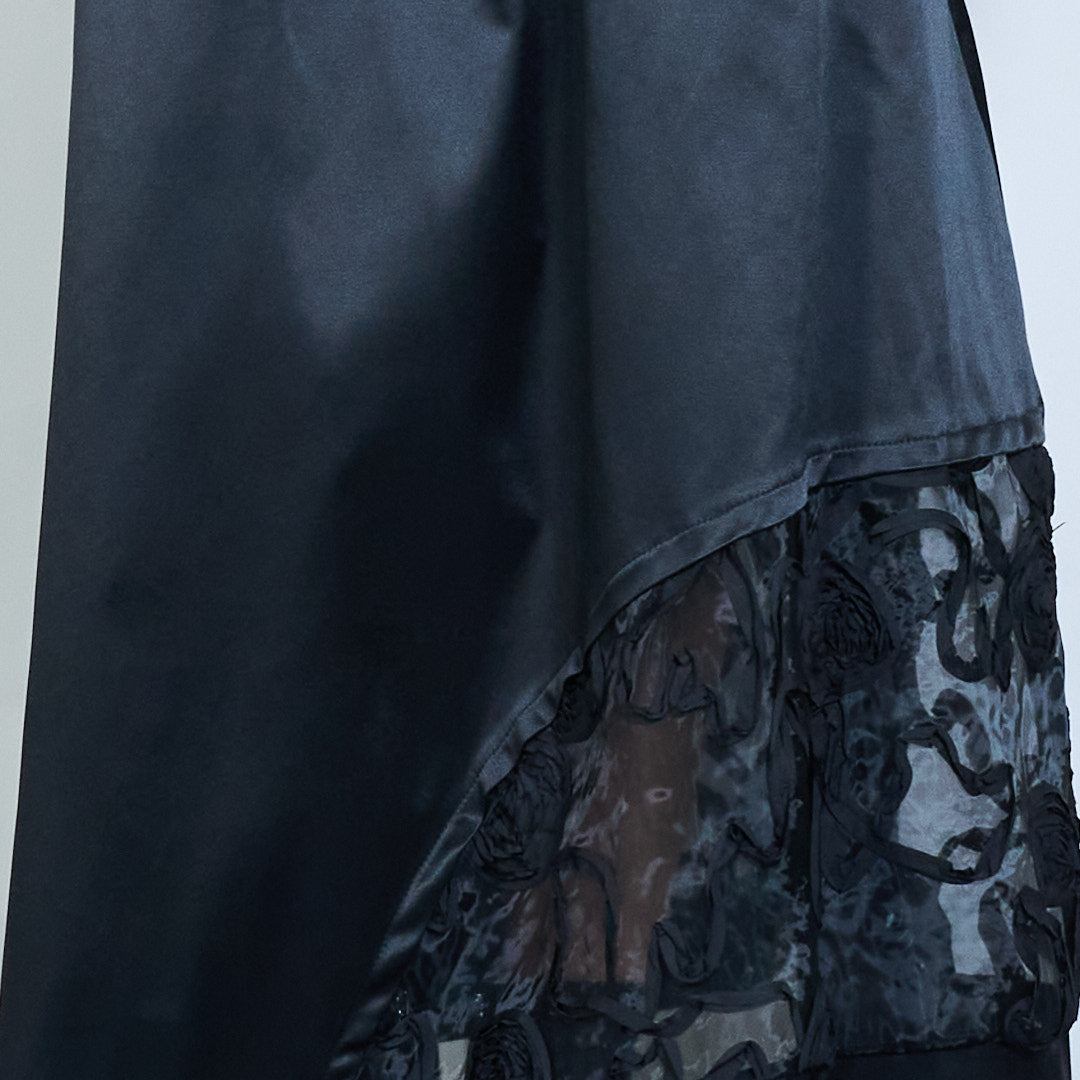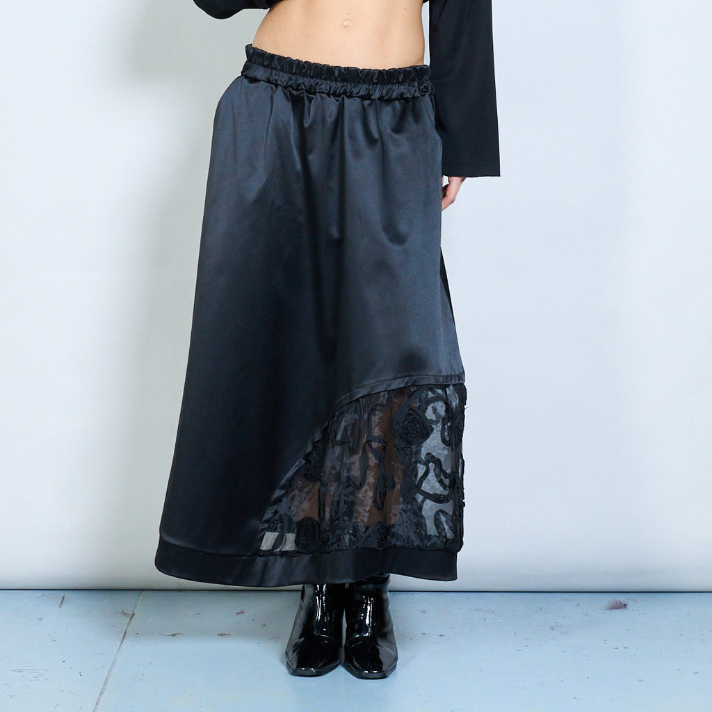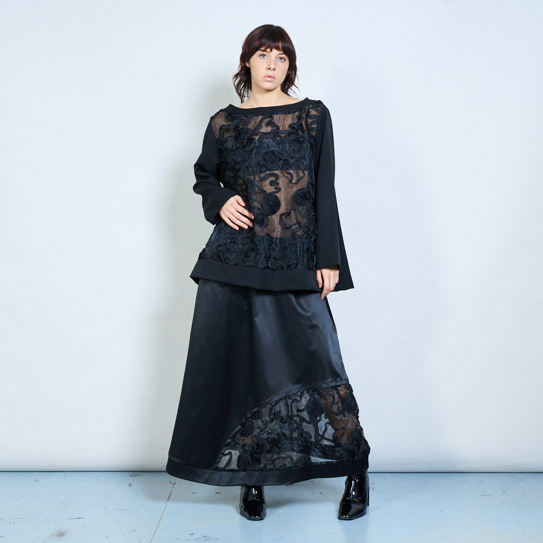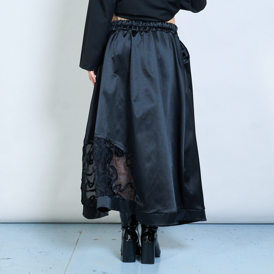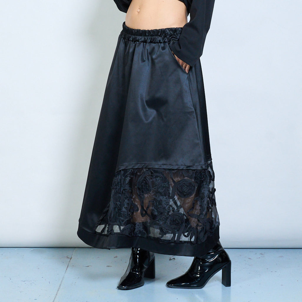 Hurtownia asymetrycznej spódnicy maxi z przezroczystymi aplikacjami w kwiaty i efektem satyny