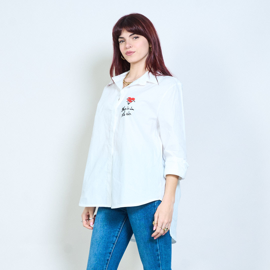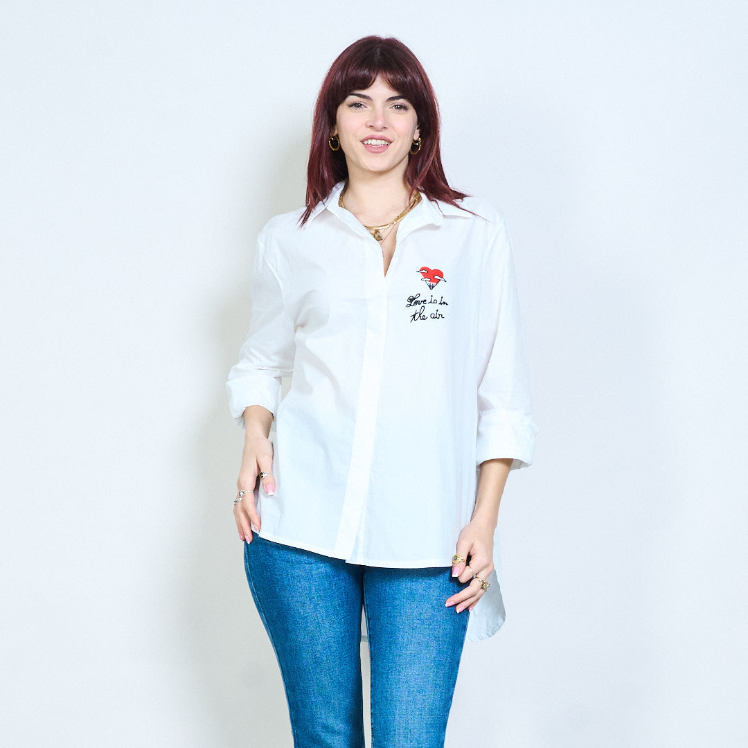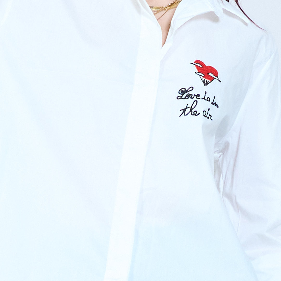 Sprzedam hurtową koszulkę o swobodnym kroju, haftowanym graficznym sercem i hasłem „Love is in the air”.