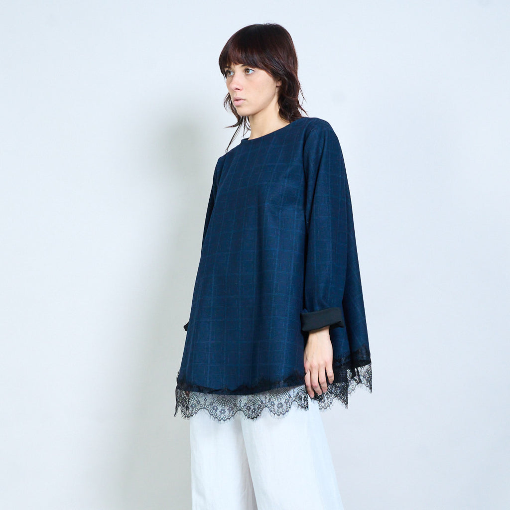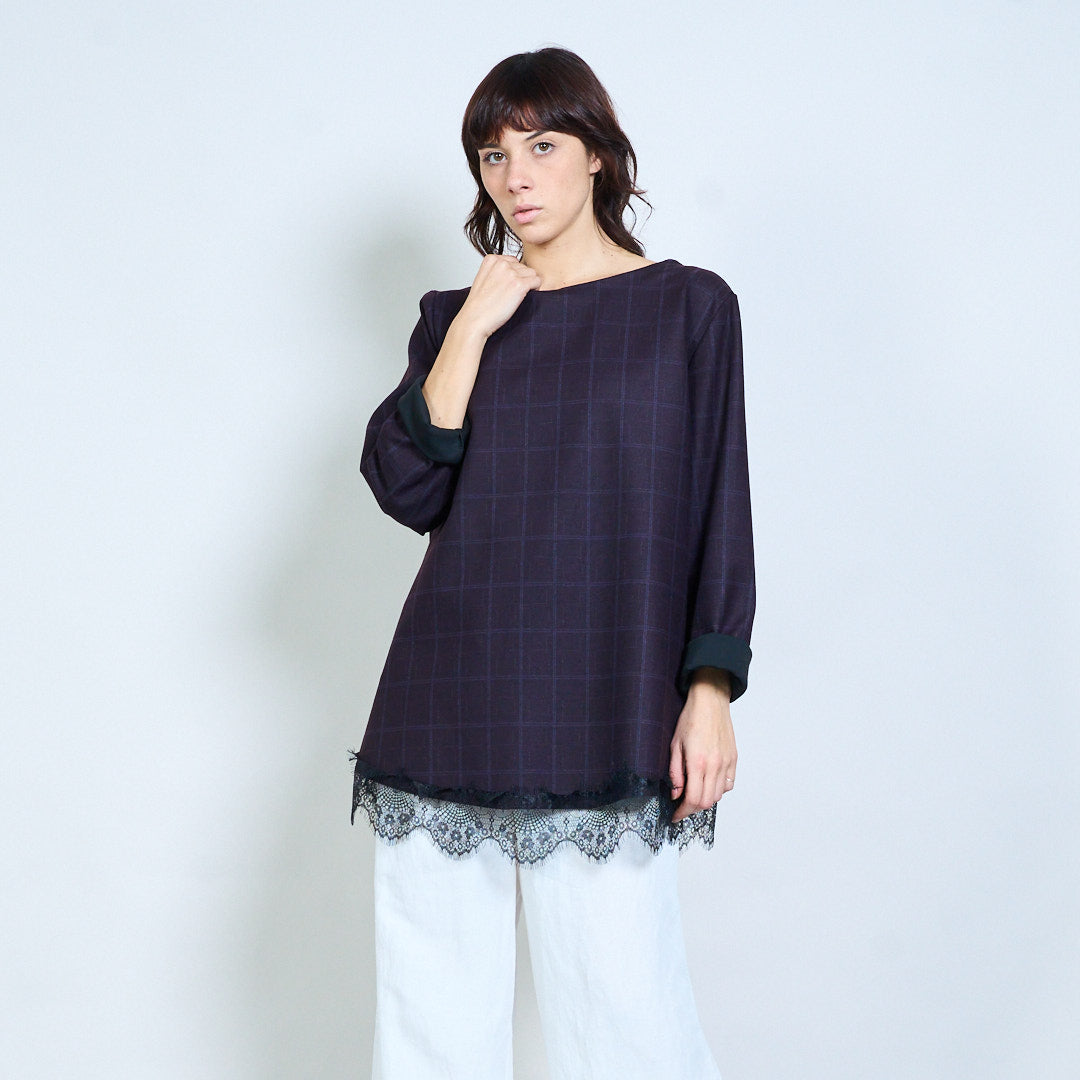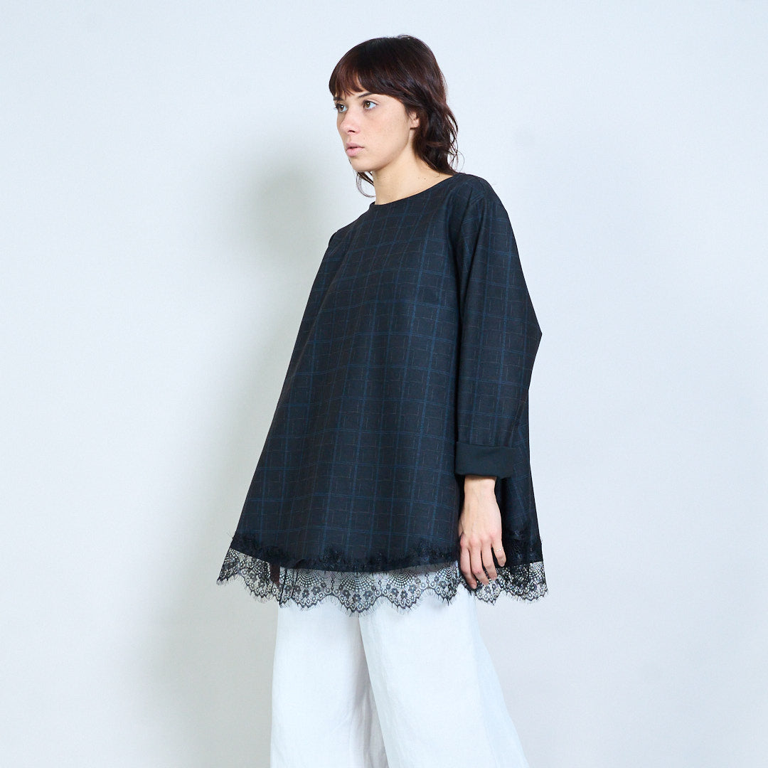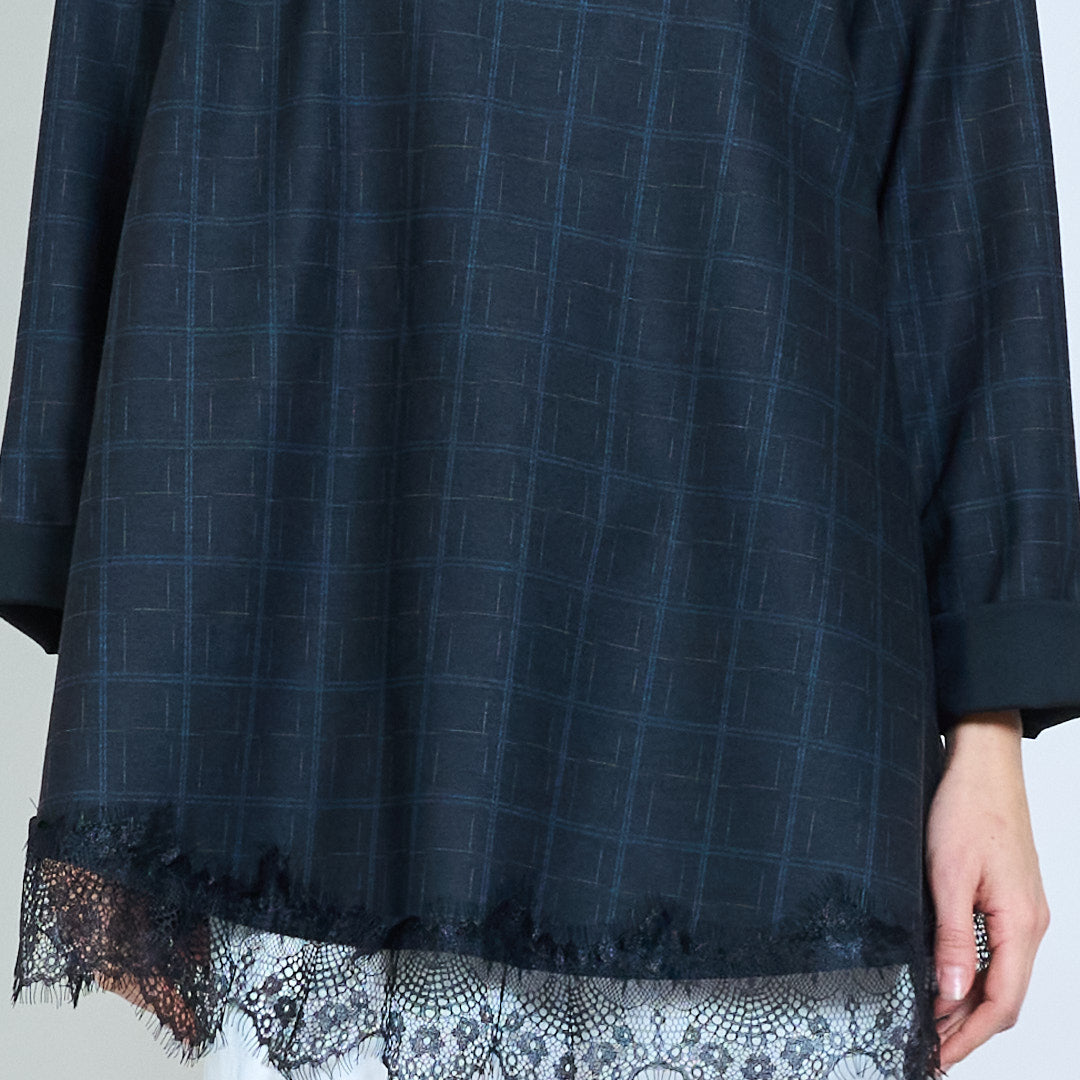 Sprzedam hurtową luźną tunikę z długim rękawem w kratkę, wykończoną koronką
