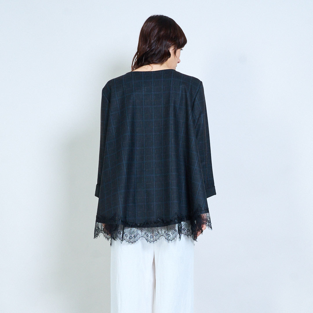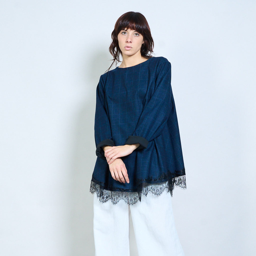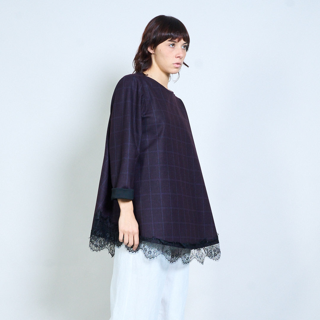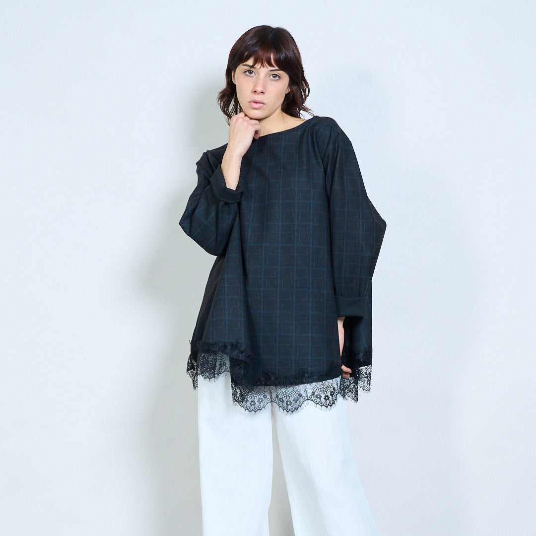 Sprzedam hurtową luźną tunikę z długim rękawem w kratkę, wykończoną koronką