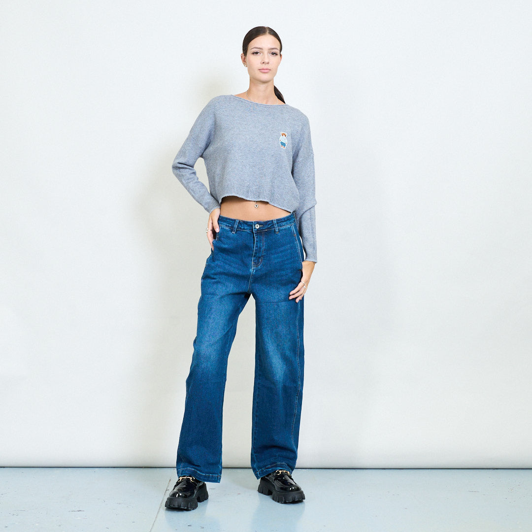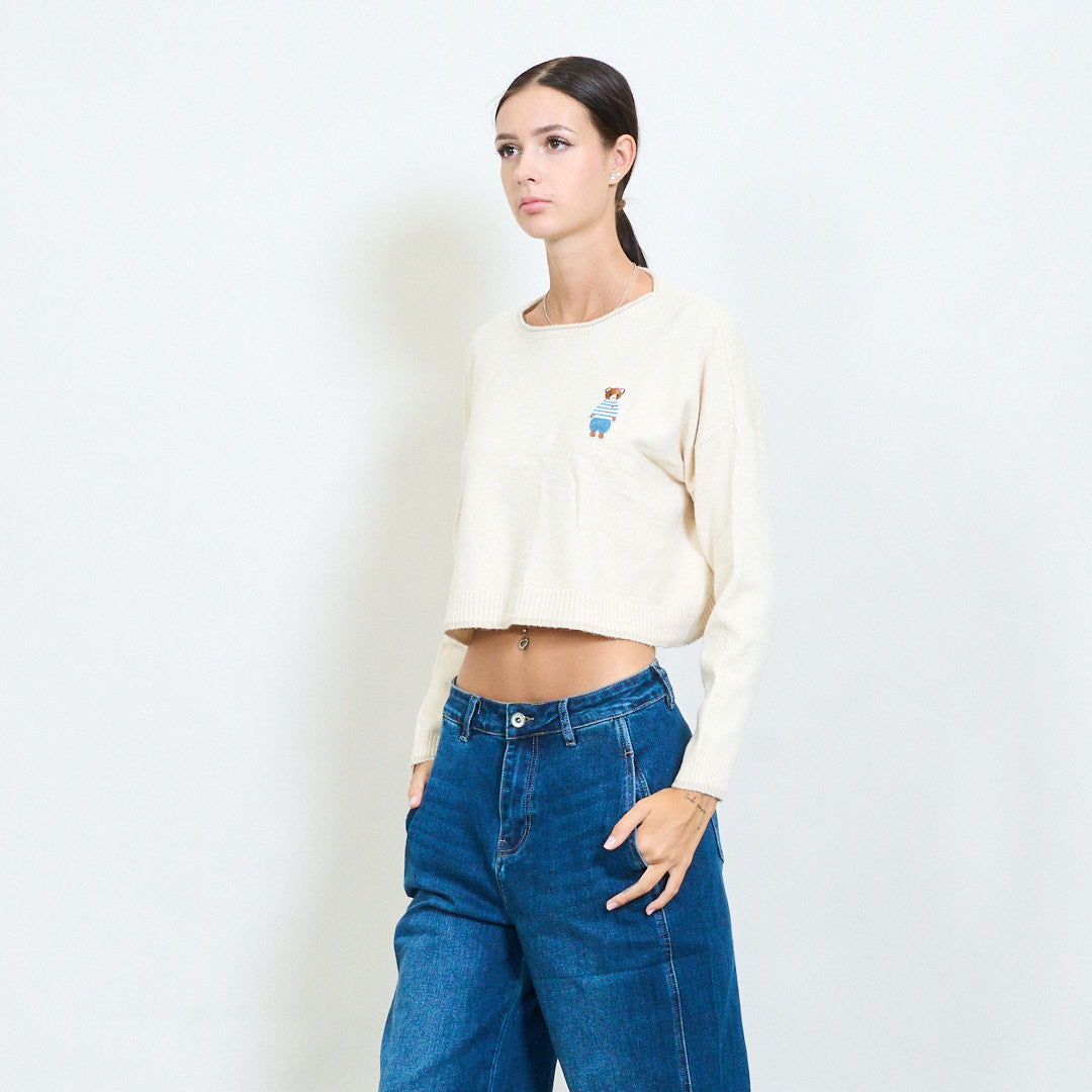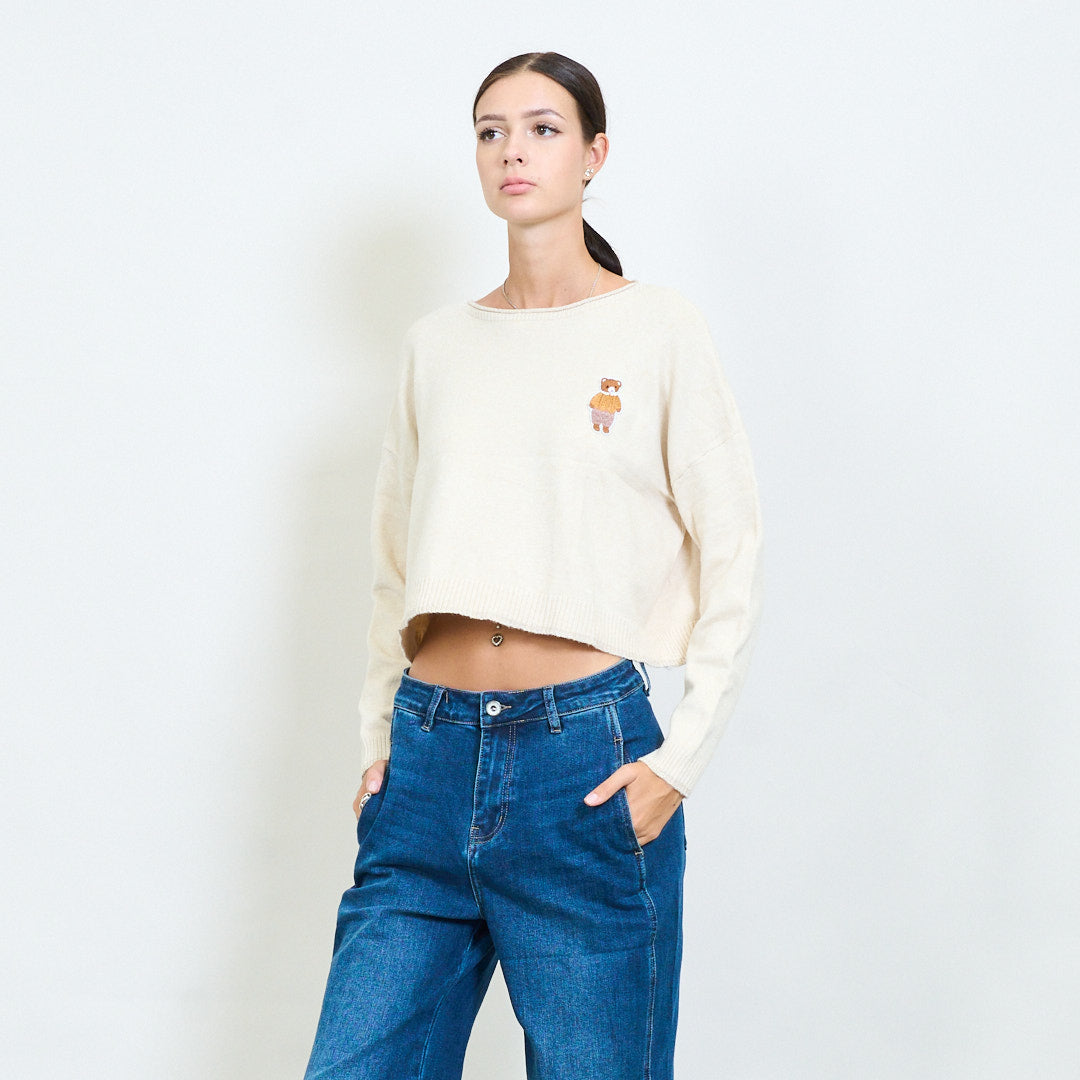 Przycięty misy haftowany sweter z dzianin