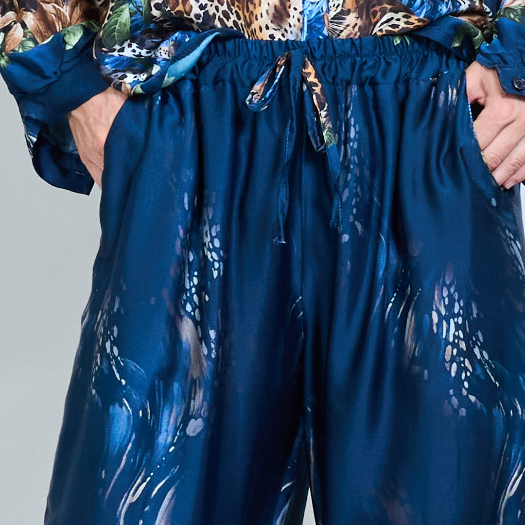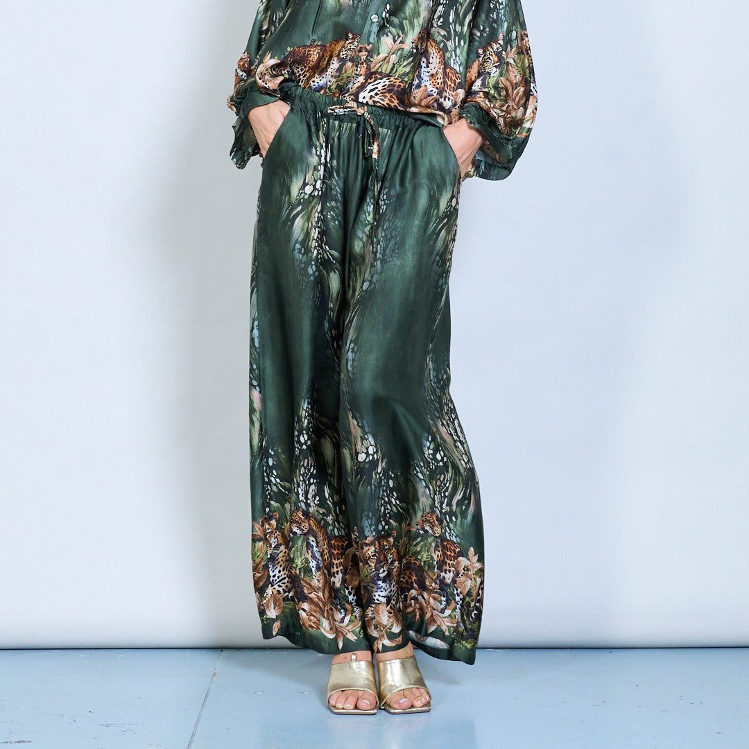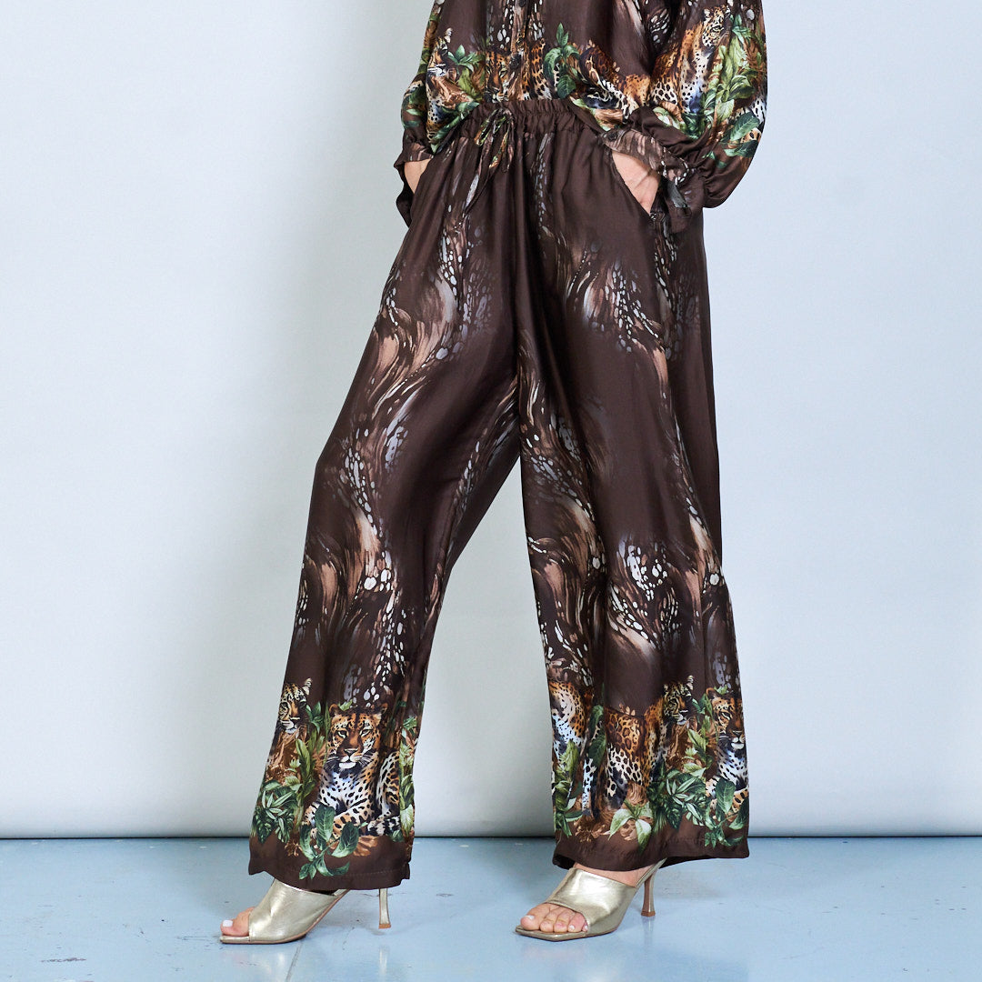 Satynowe spodnie z szerokiej nogi z dżungli lampart hurtową