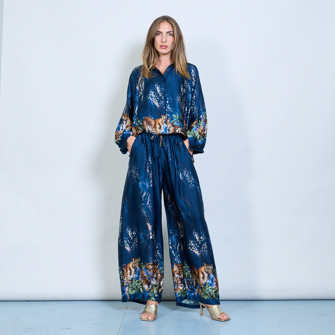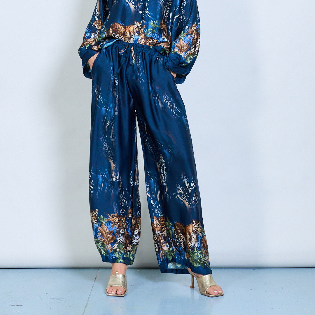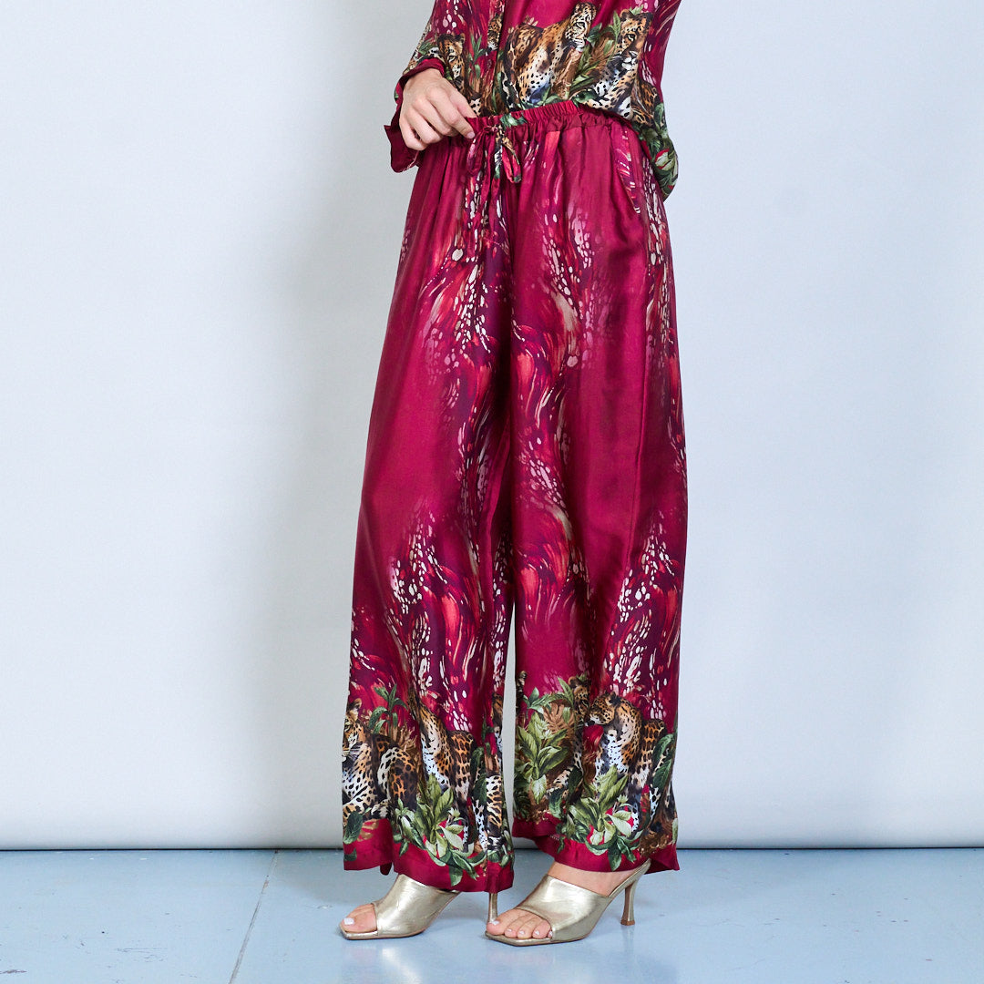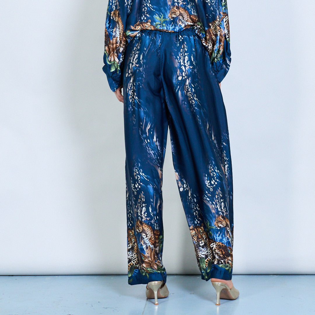 Satynowe spodnie z szerokiej nogi z dżungli lampart hurtową