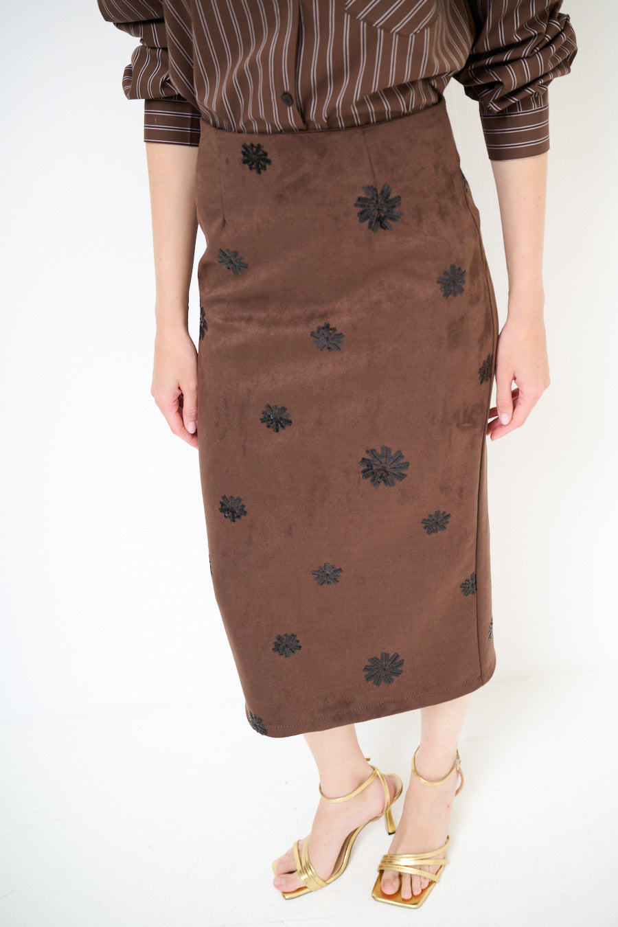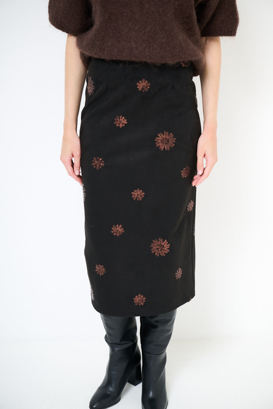 Faux zamszowa spódnica midi z cekinowym kwiatowym detal hurtowym