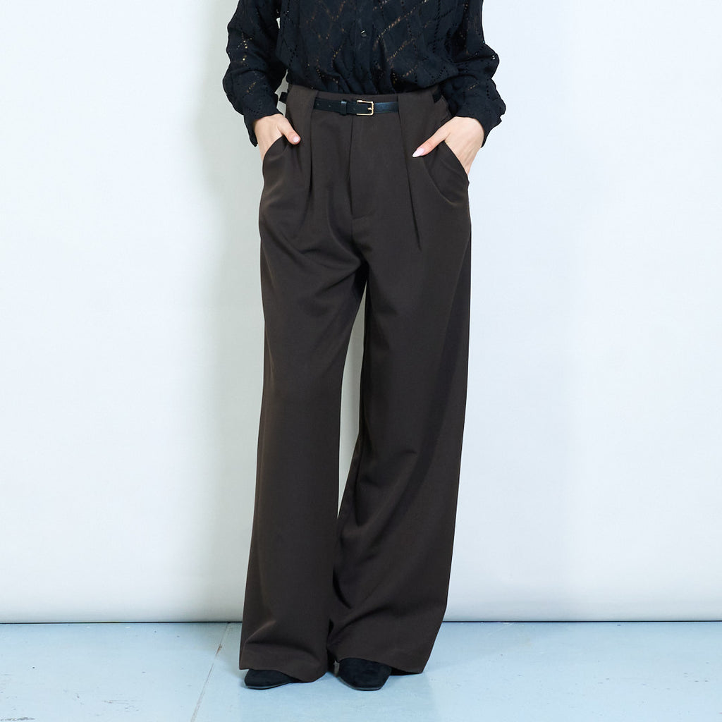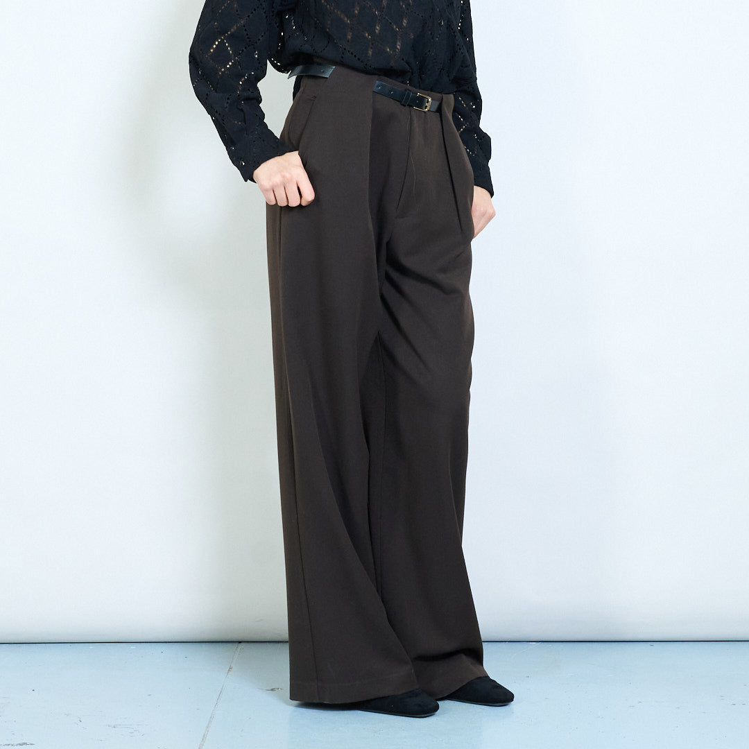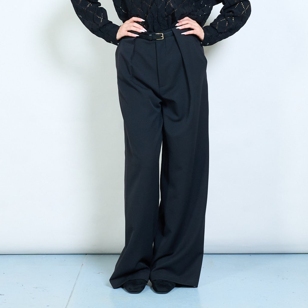 Sprzedam hurtowo plisowane, dopasowane, minimalistyczne spodnie z wysokim stanem i akcentami paska