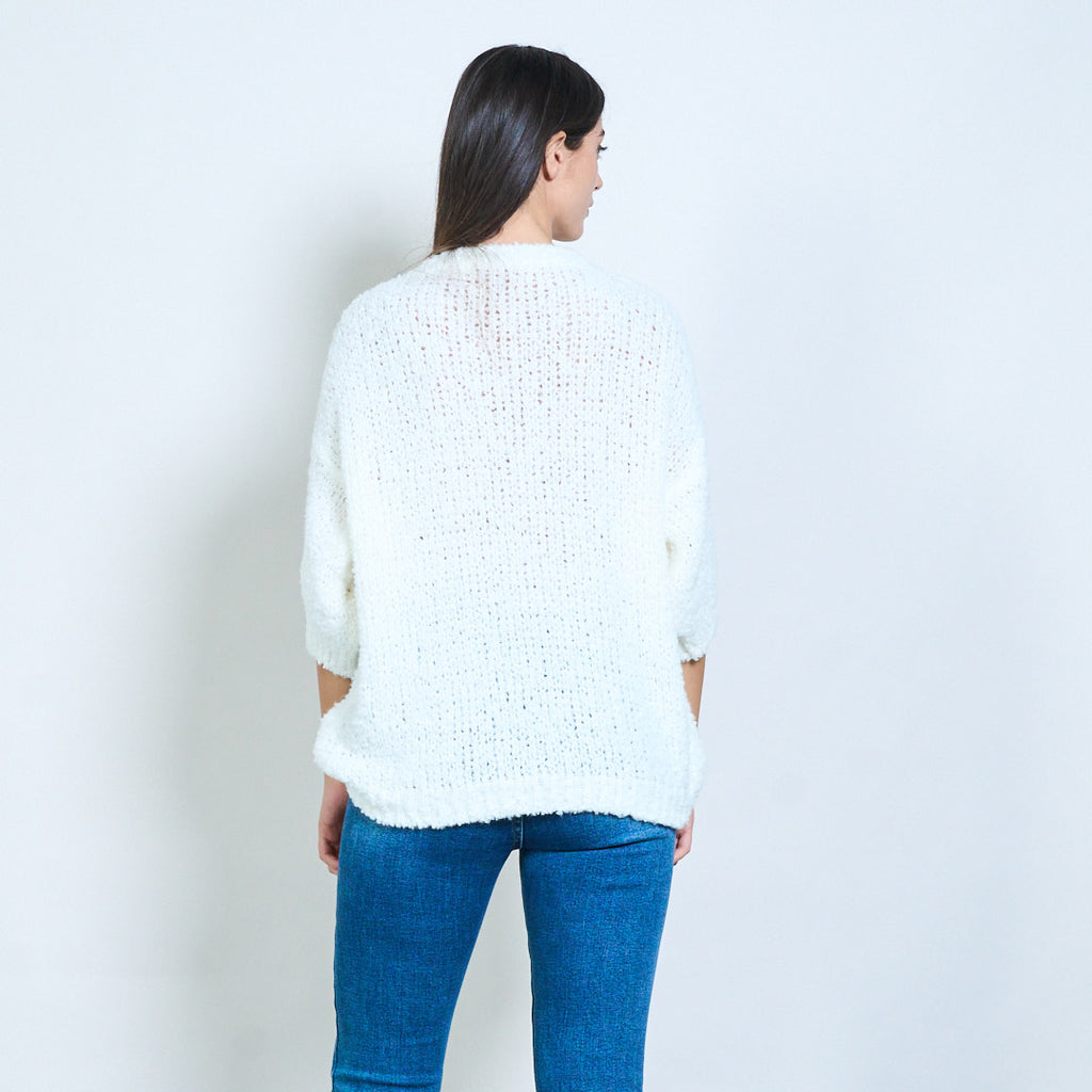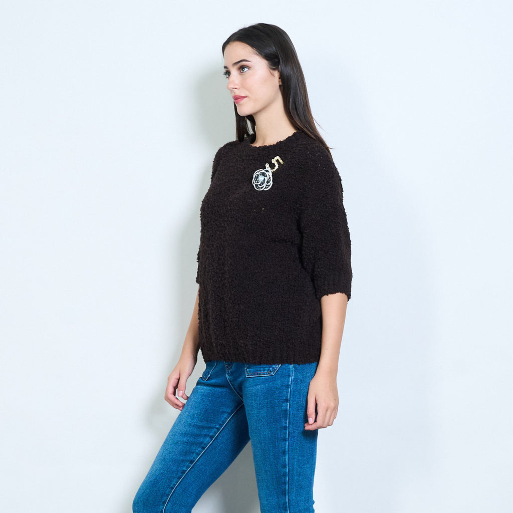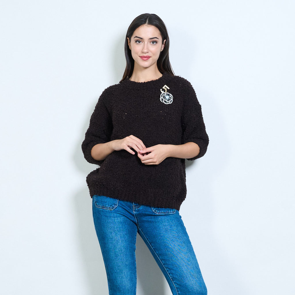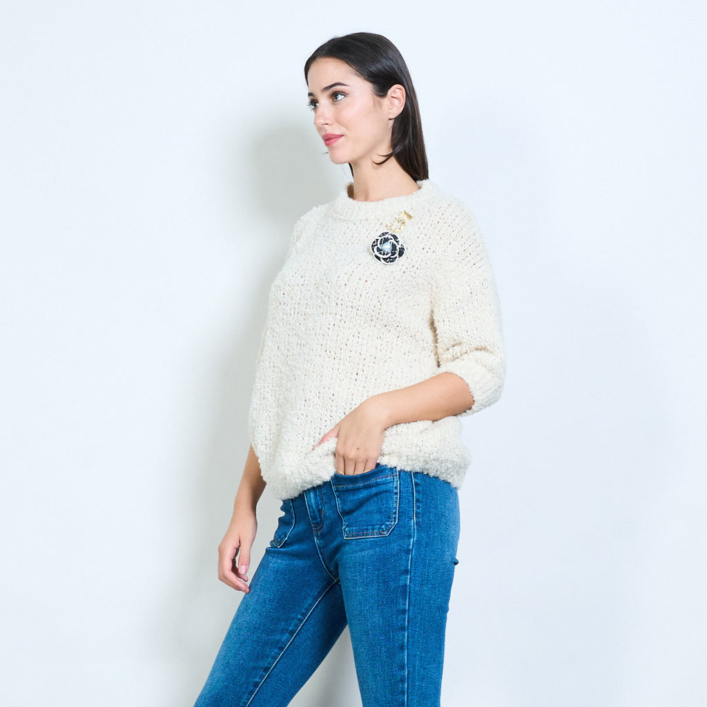 Hurtownia puszystego, teksturowanego swetra z kwiatowymi broszkami