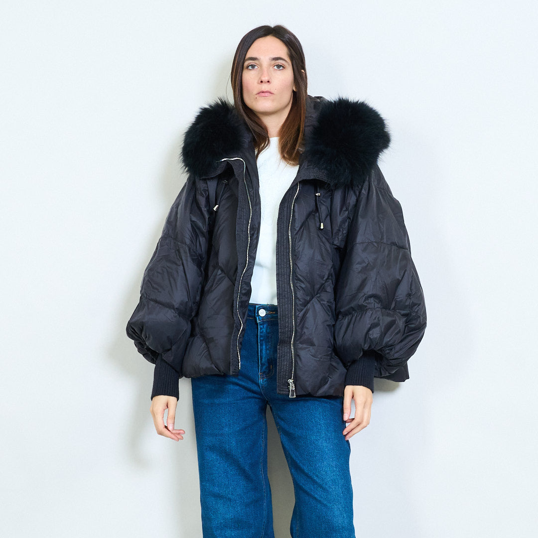- Krój z kapturem i efektownym futrzanym wykończeniem dodaje luksusowego uroku