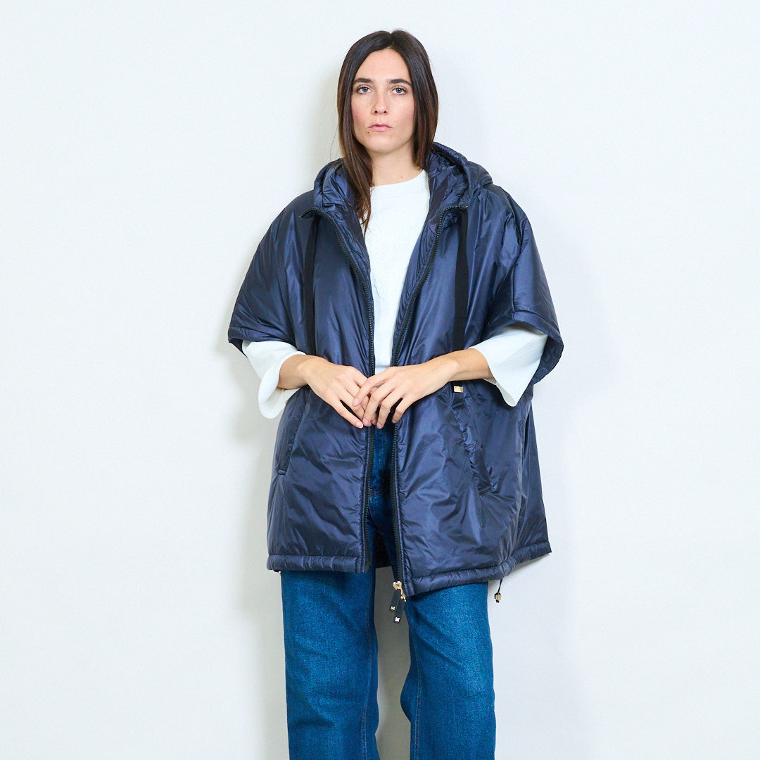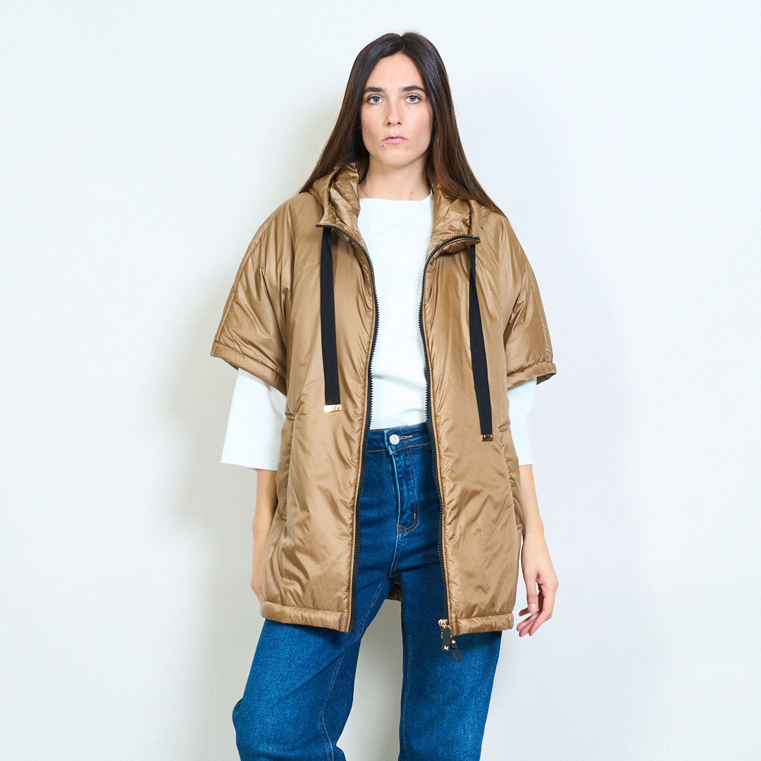 - Krój z kapturem i długimi sznurkami dodaje stylowych detali
