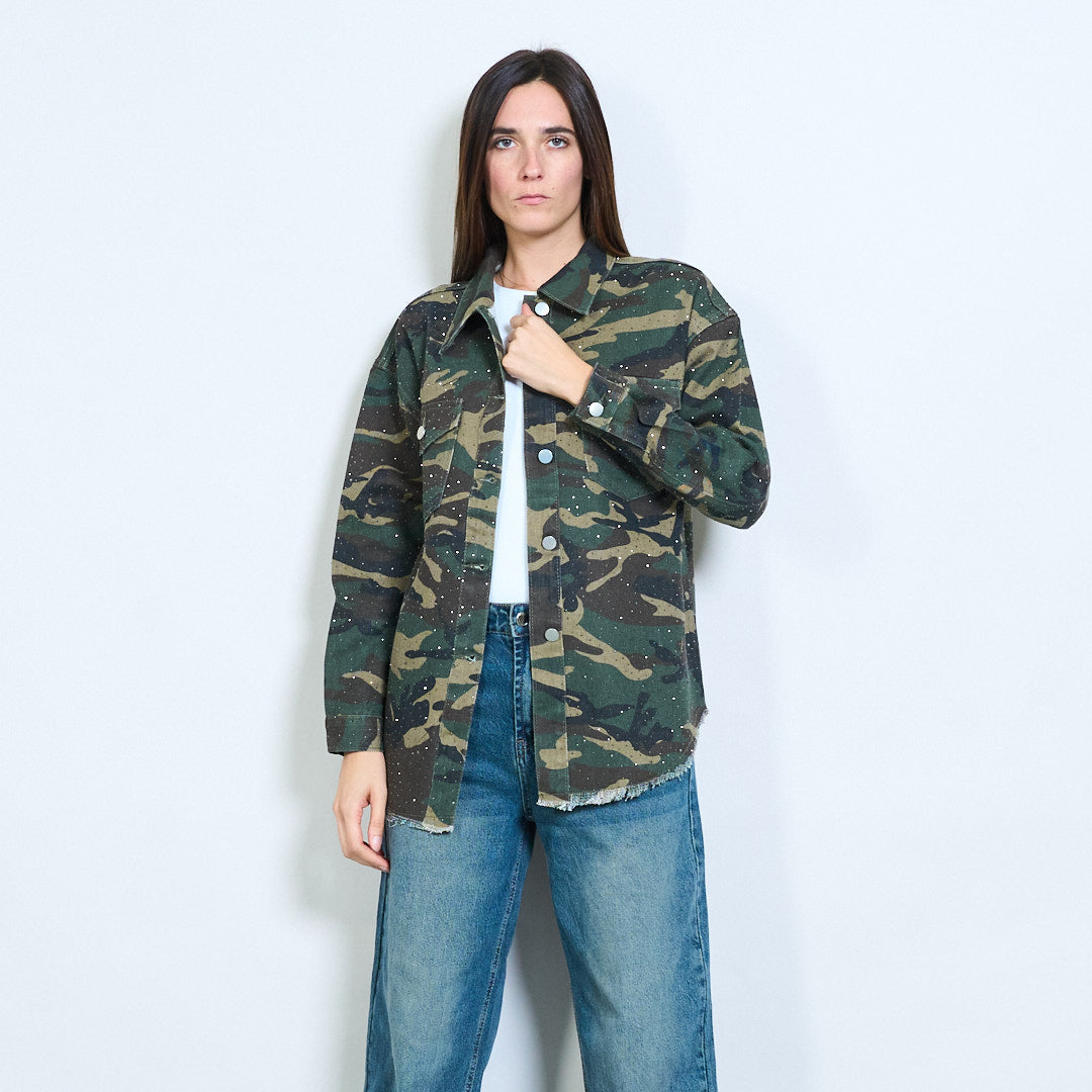 Sprzedam hurtową kurtkę oversize z nadrukiem moro, ozdobioną kryształkami