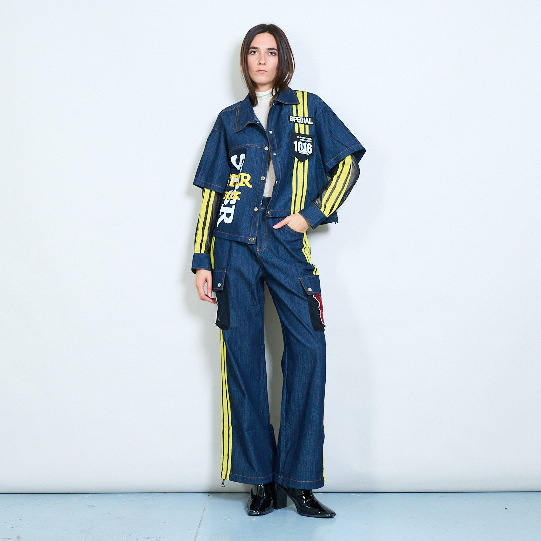 - Dwuczęściowy, skoordynowany zestaw składający się z odważnej kurtki dżinsowej z grafiką i spodni bojówek