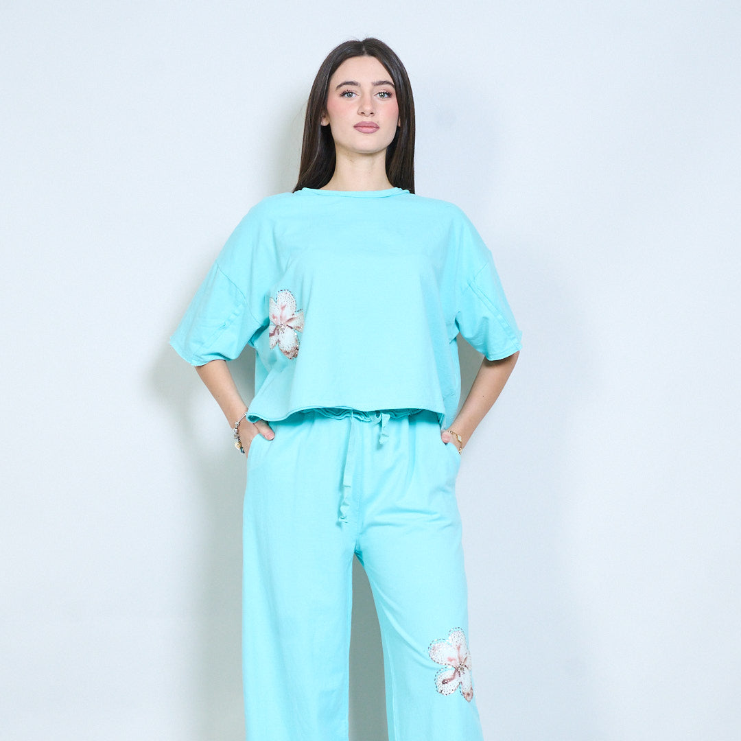 Luźna bluzka z krótkim rękawem i kwiatową aplikacją w sprzedaży hurtowej