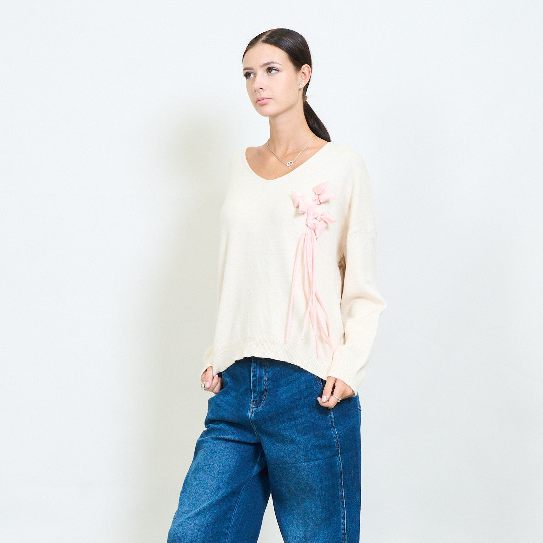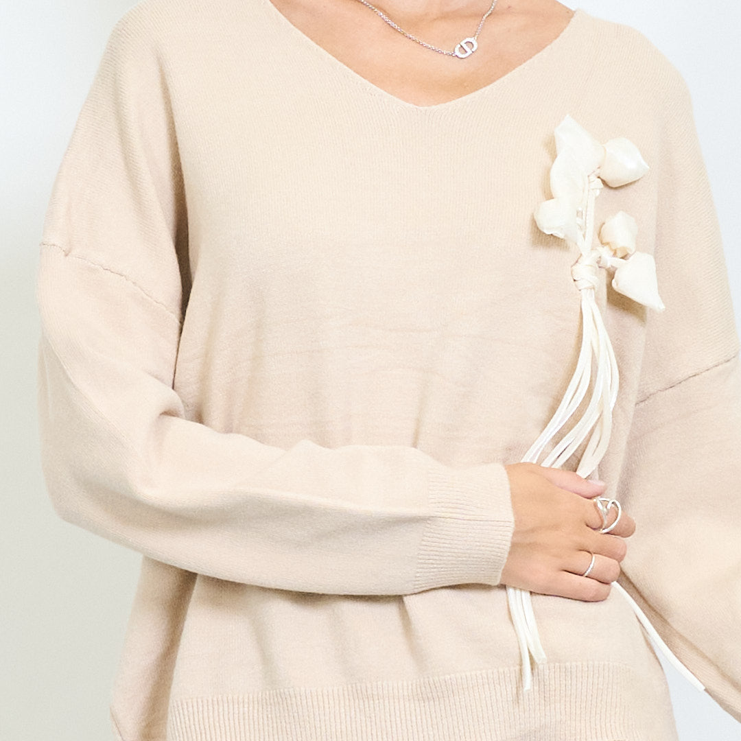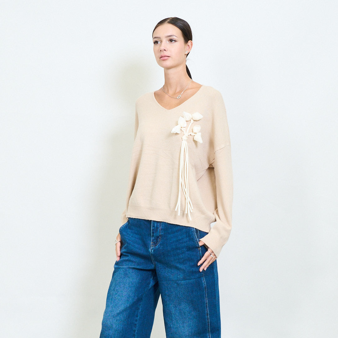 3D floral applique v-neck knit sweater wholesale