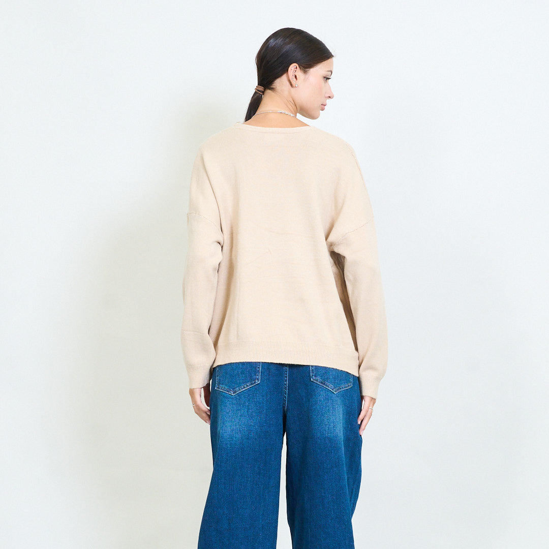 - Relaxed fit with a soft, feminine v-neckline