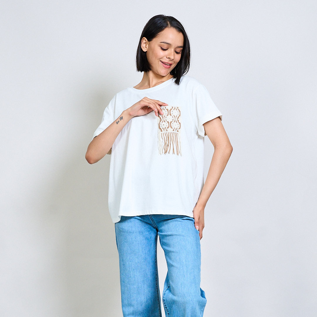 Embroidered pocket t-shirt with fringe beaded trim wholesale