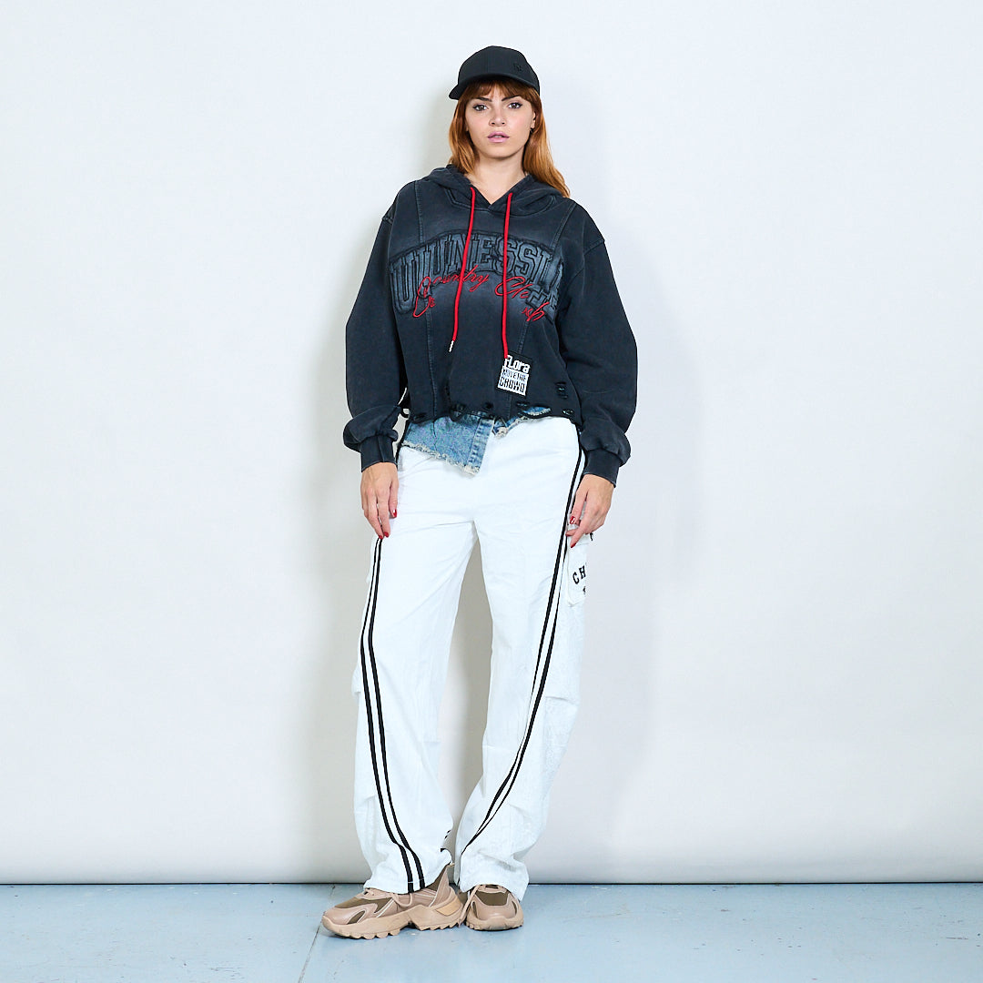 - Frayed raw edge denim effect for edgy look
