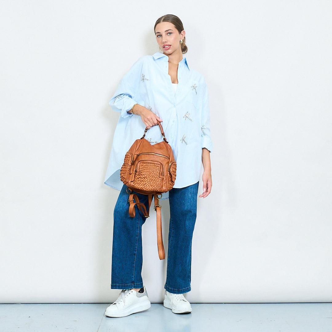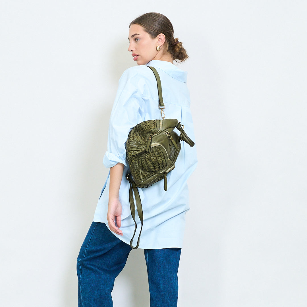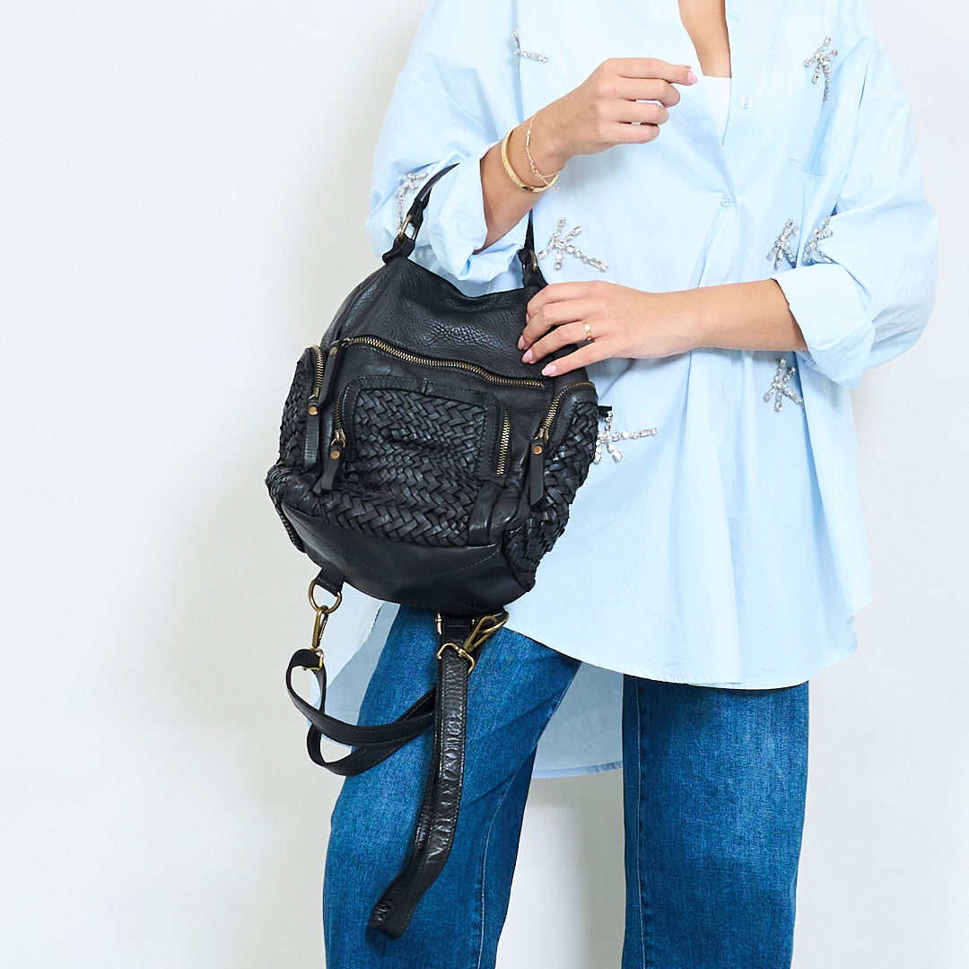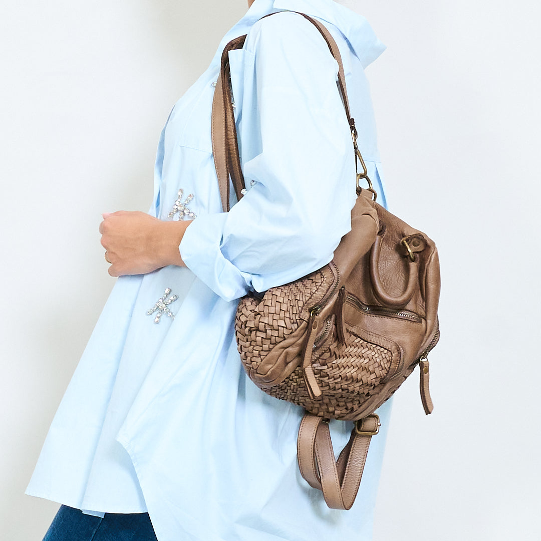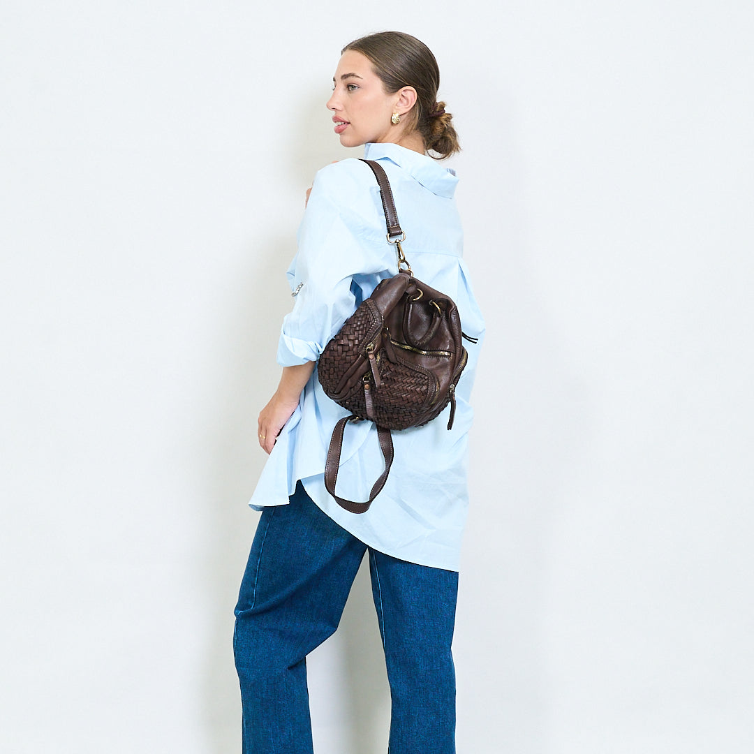 Mochila de couro de bolso dianteiro com zíper com detalhes no atacado