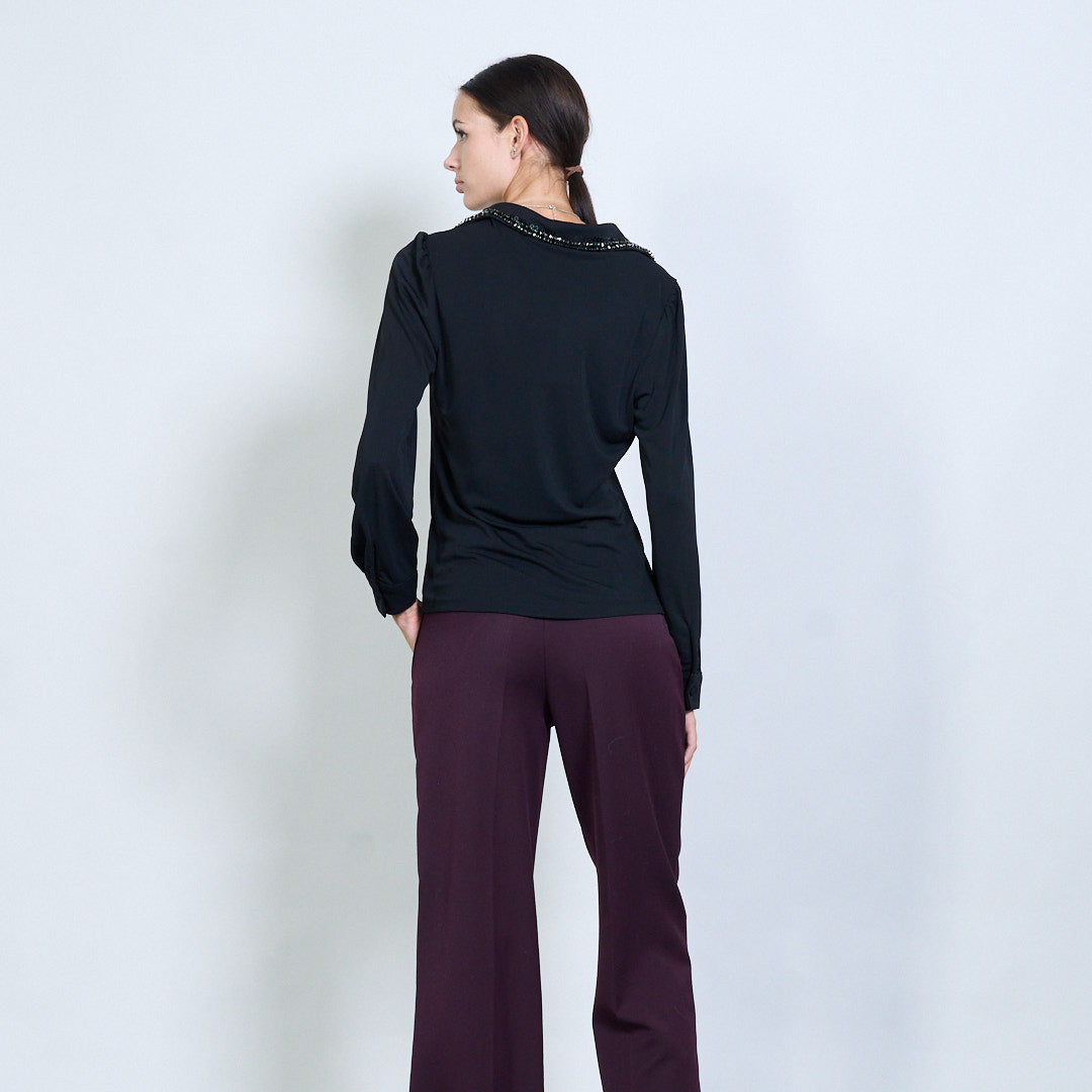 - Detalhes de colarinho embelezado acrescenta brilho sutil e elegância