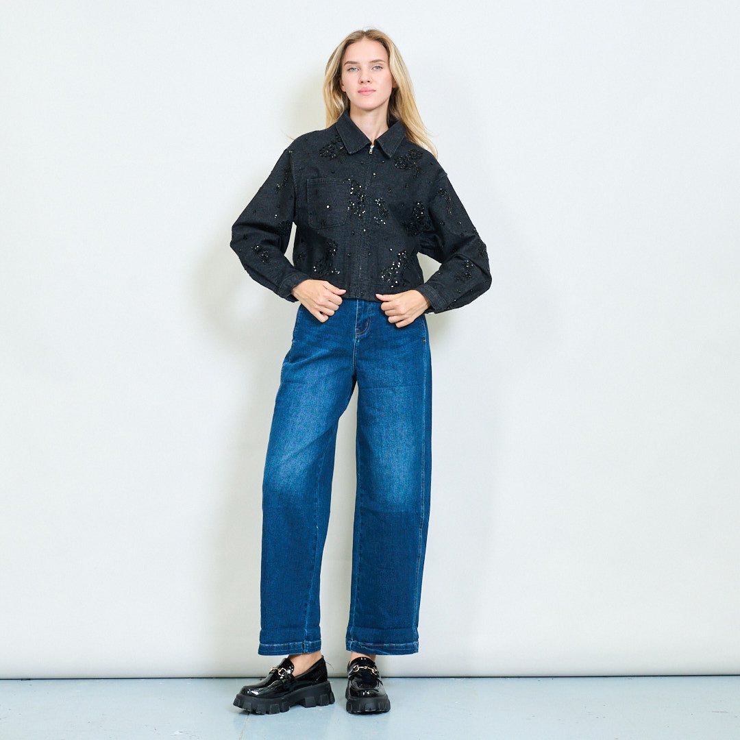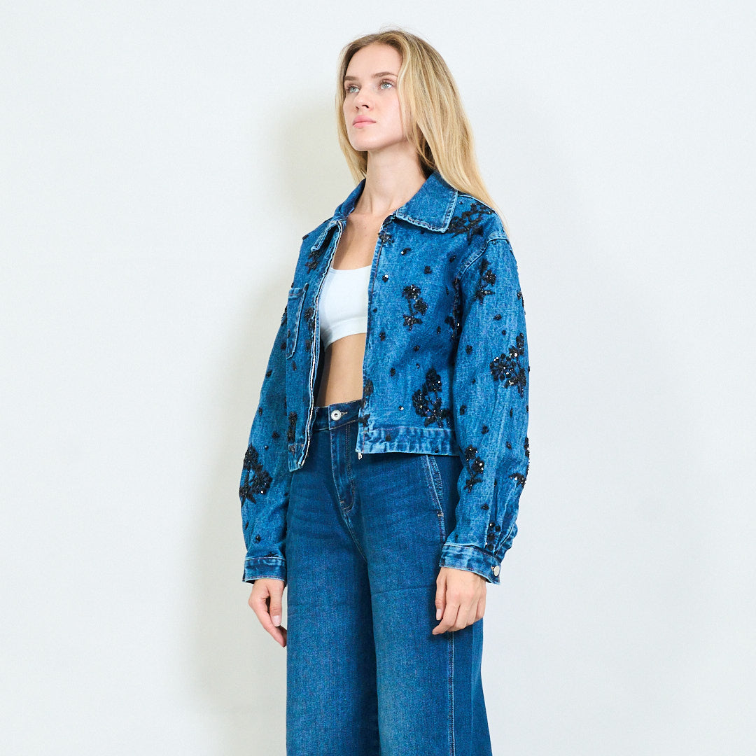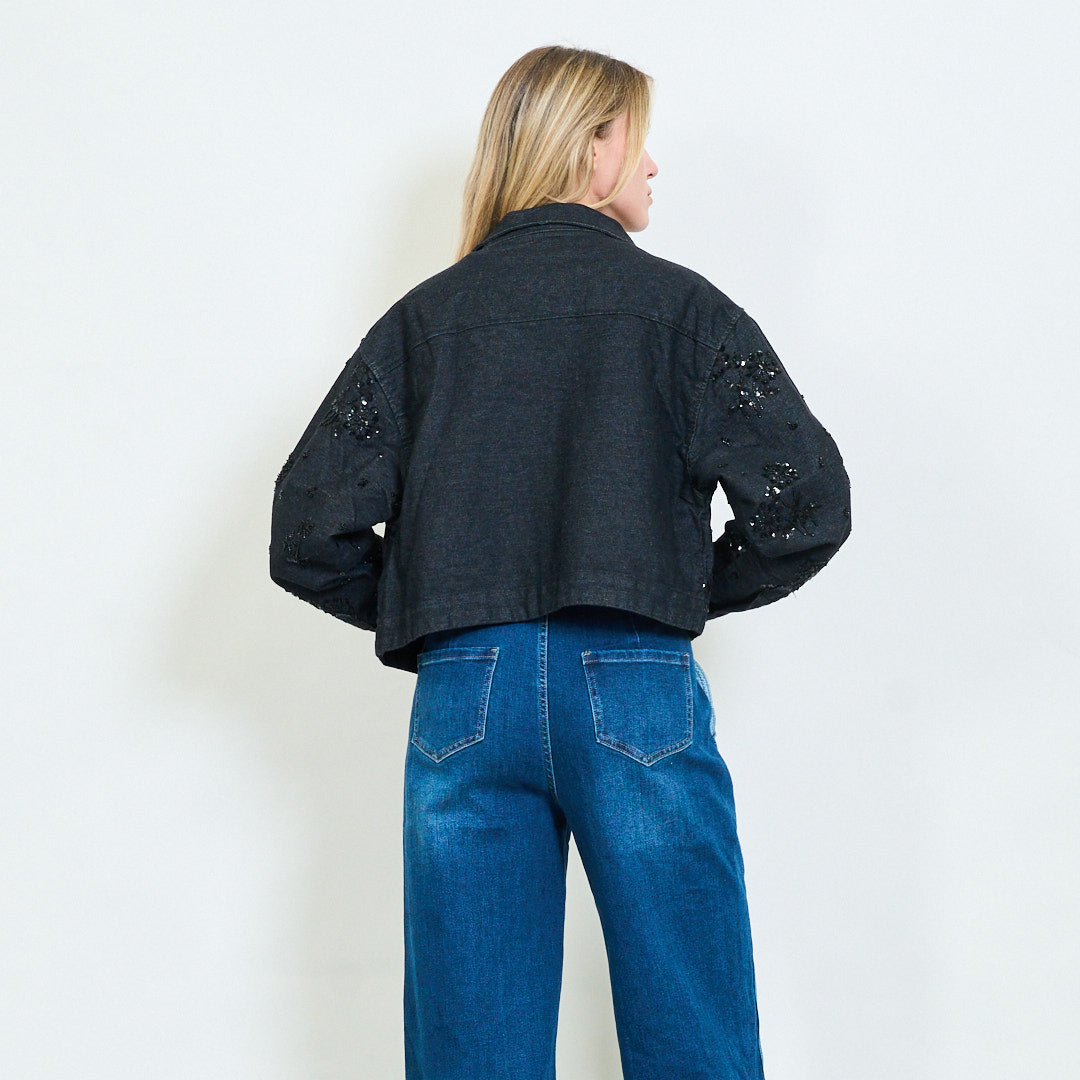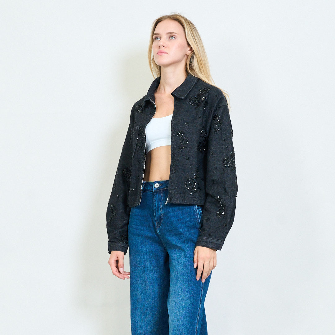 - Jaqueta de jeans pretos cortados com delicados enfeites de contas florais