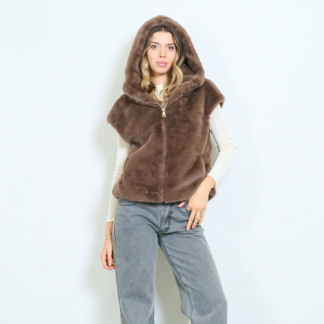 Colete de pelúcia com capuz e zíper sem mangas de pele sintética no atacado