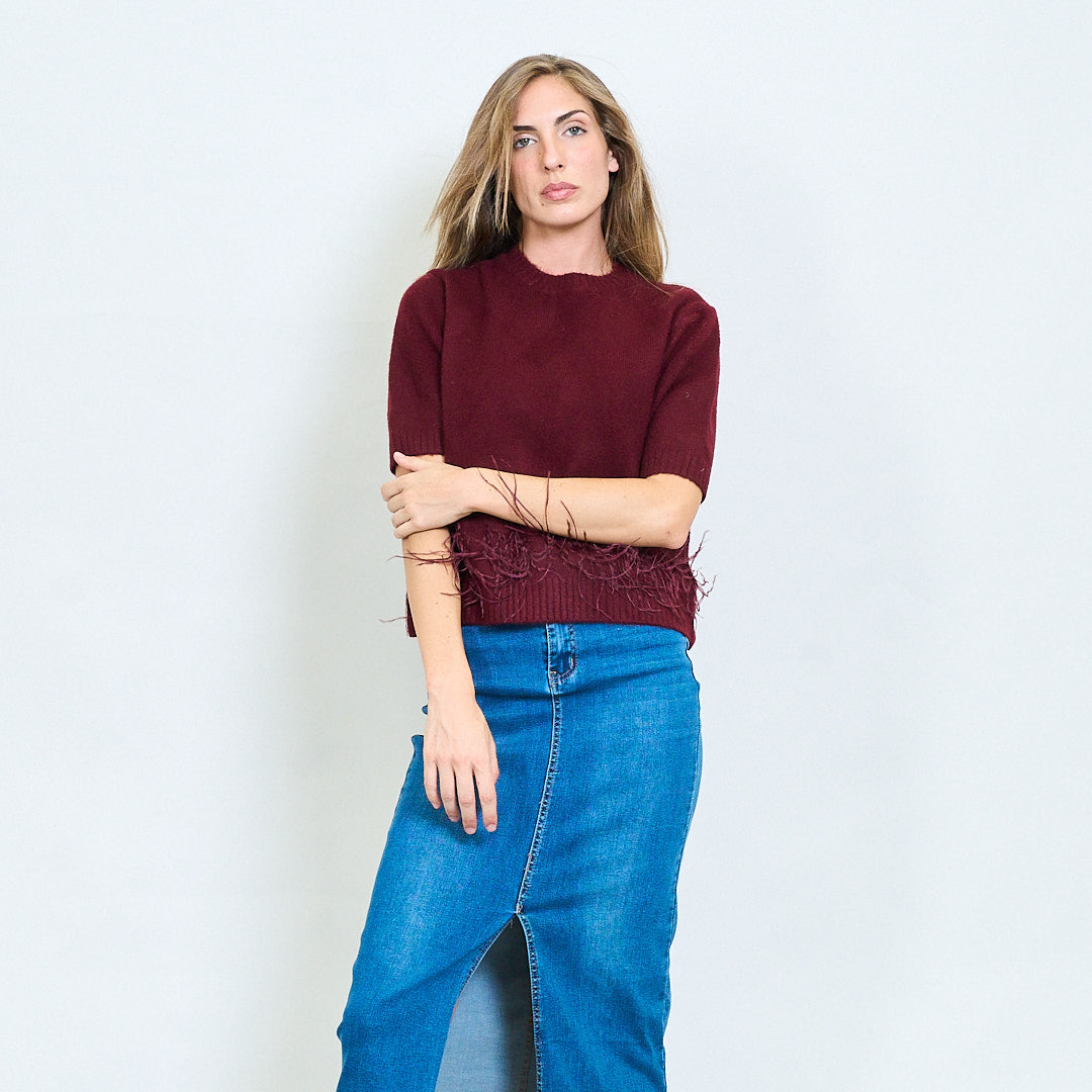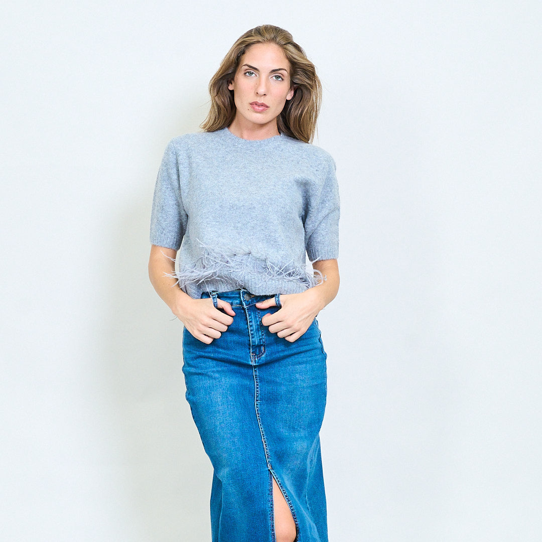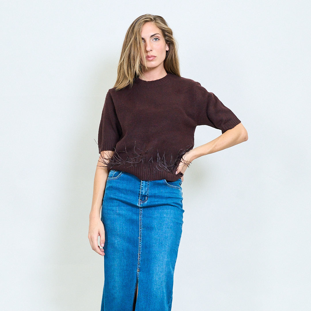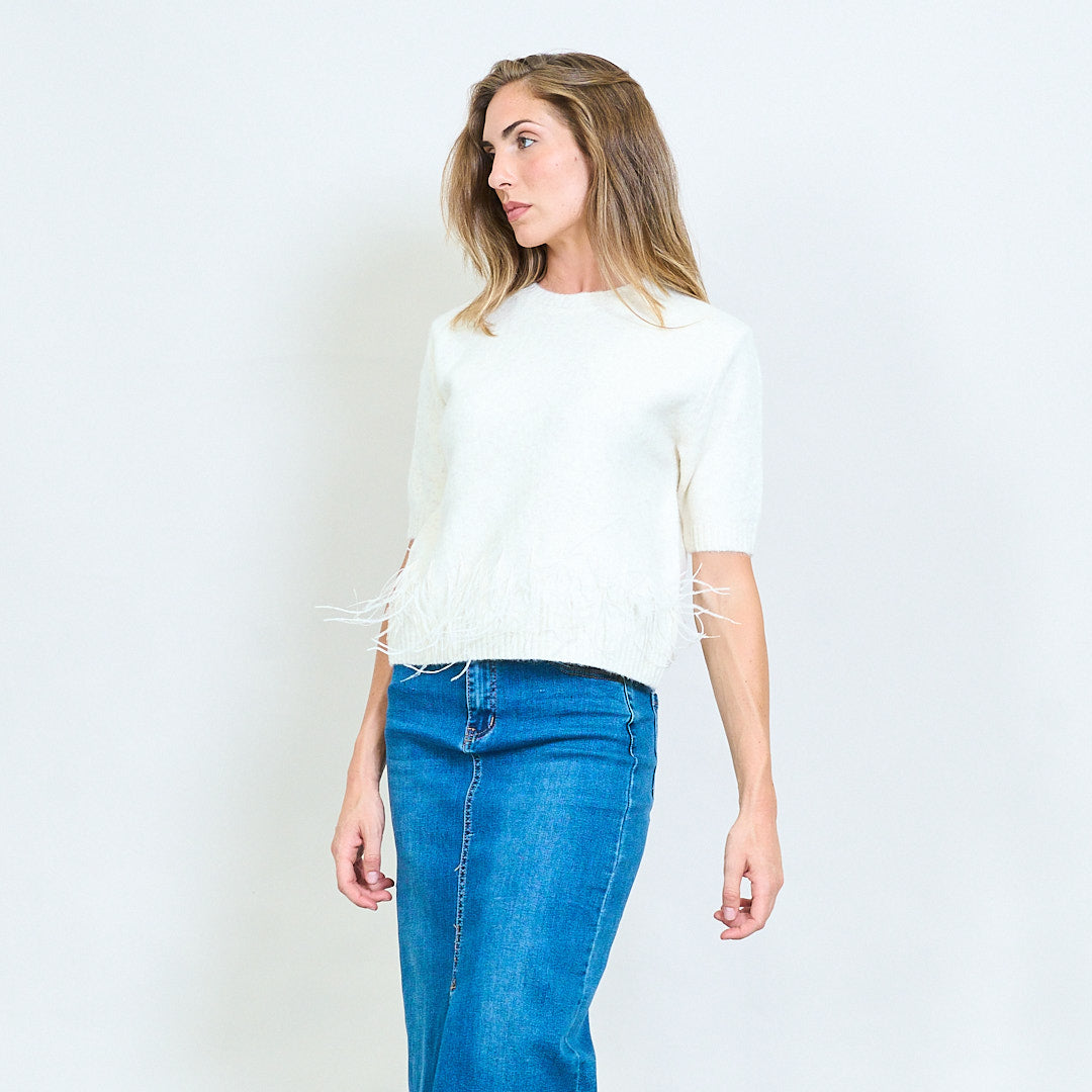Suéter difuso de manga curta com detalhes de bainha em penas cruas no atacado