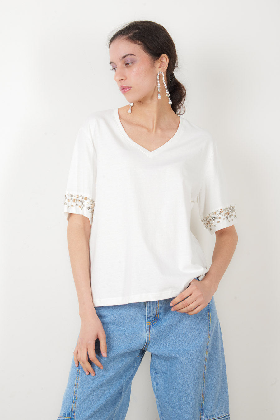 Camiseta de ajuste relaxado com manga enfeitada com cristal e decote em V no atacado