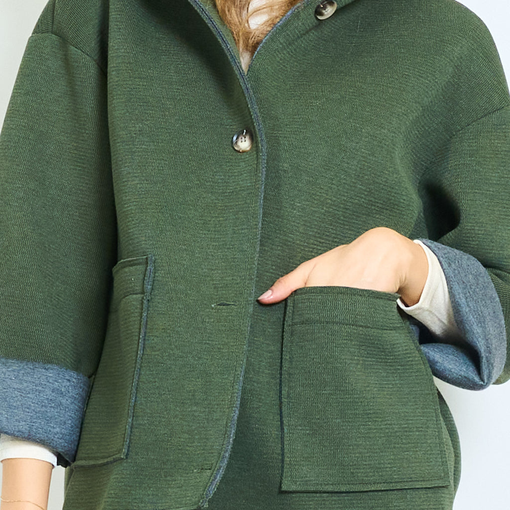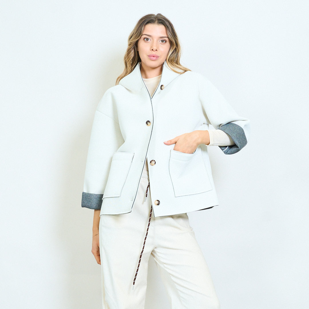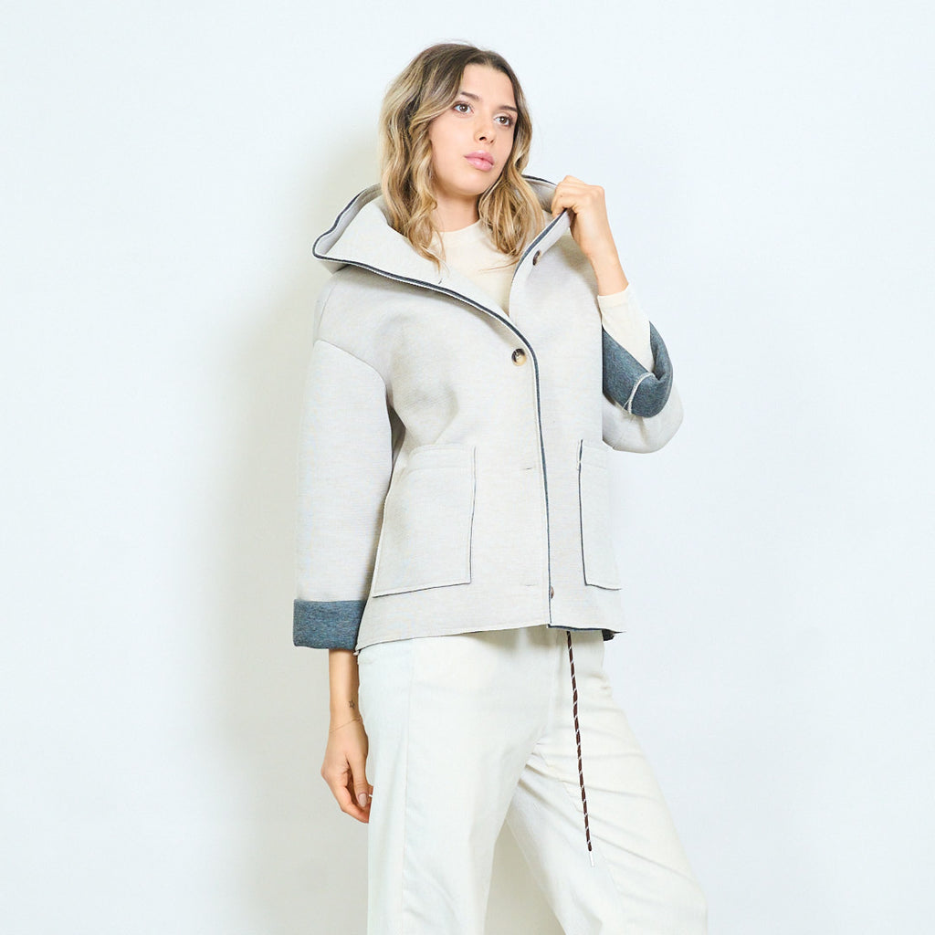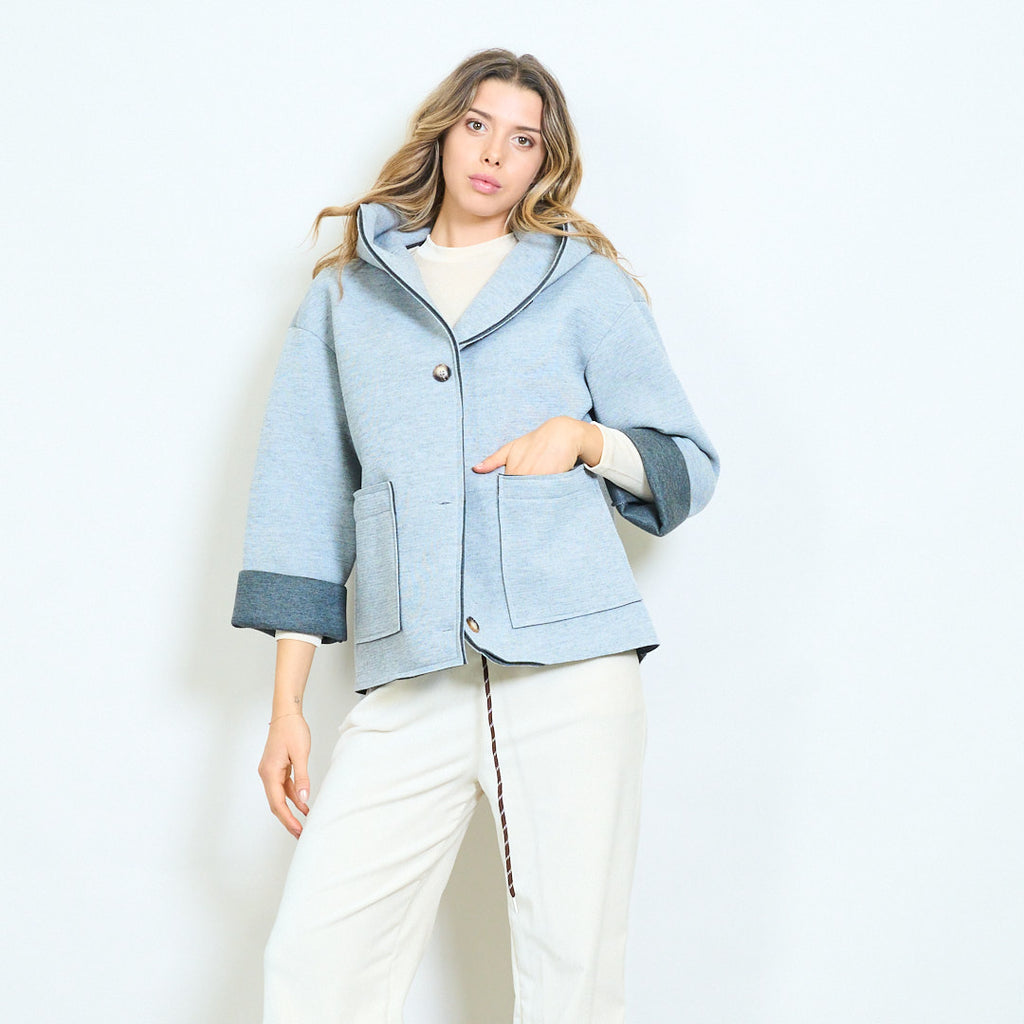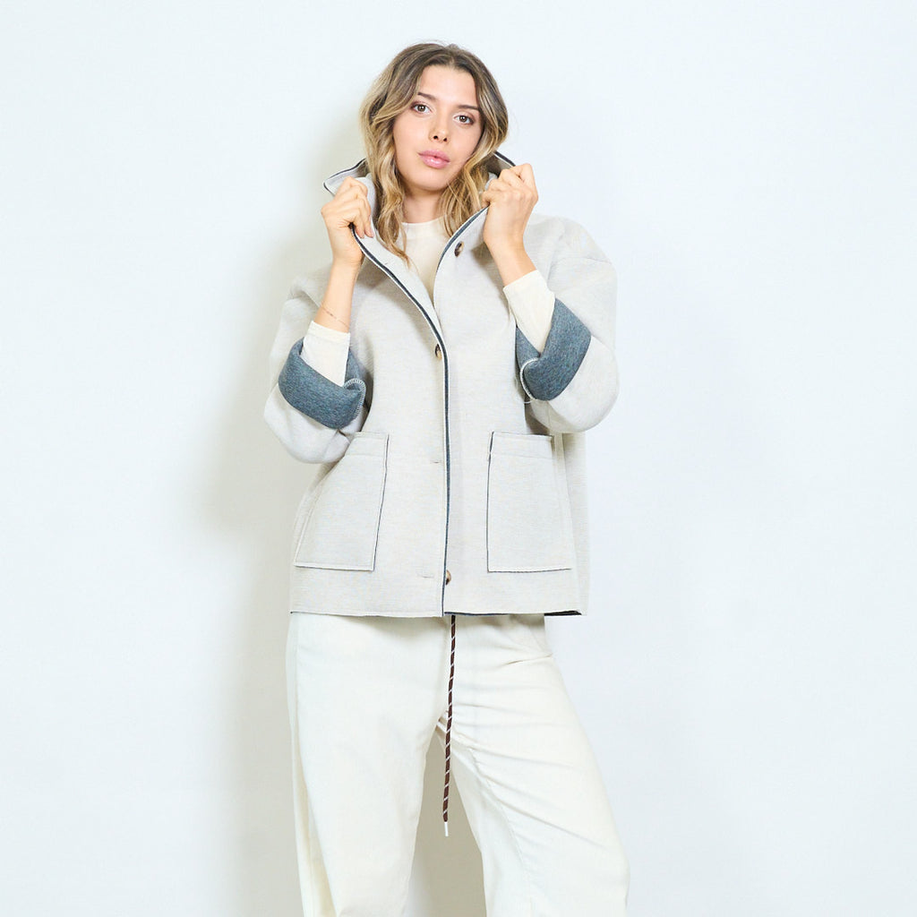 - Acabamento cinza contrastante e punhos dobrados para detalhes elegantes