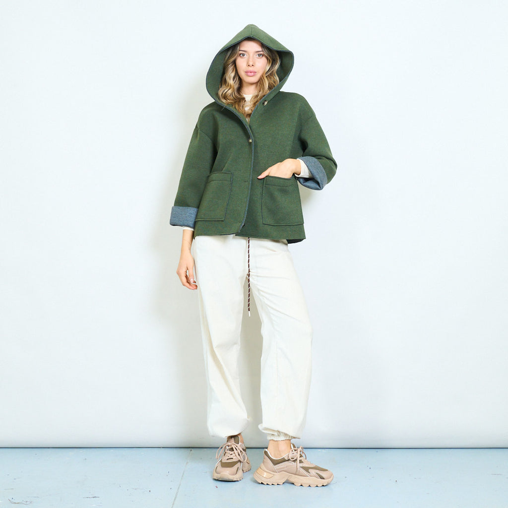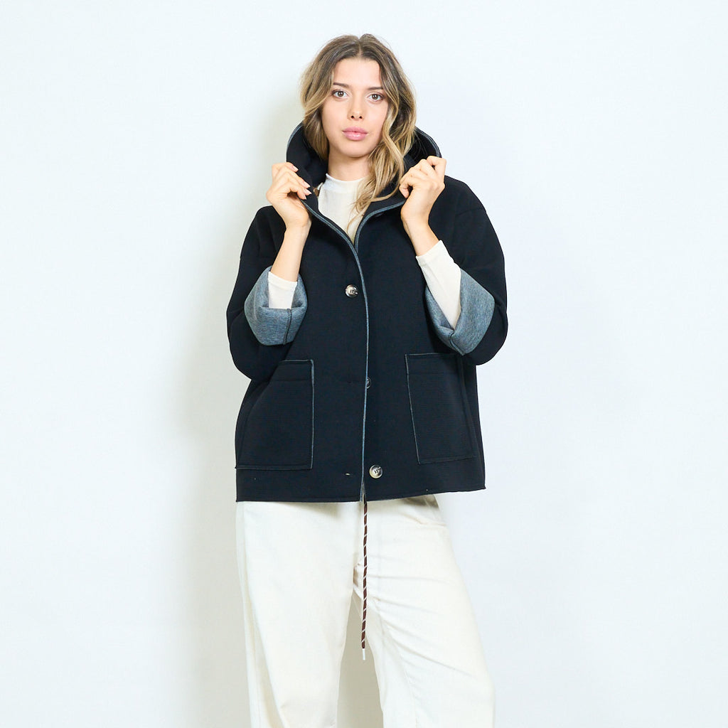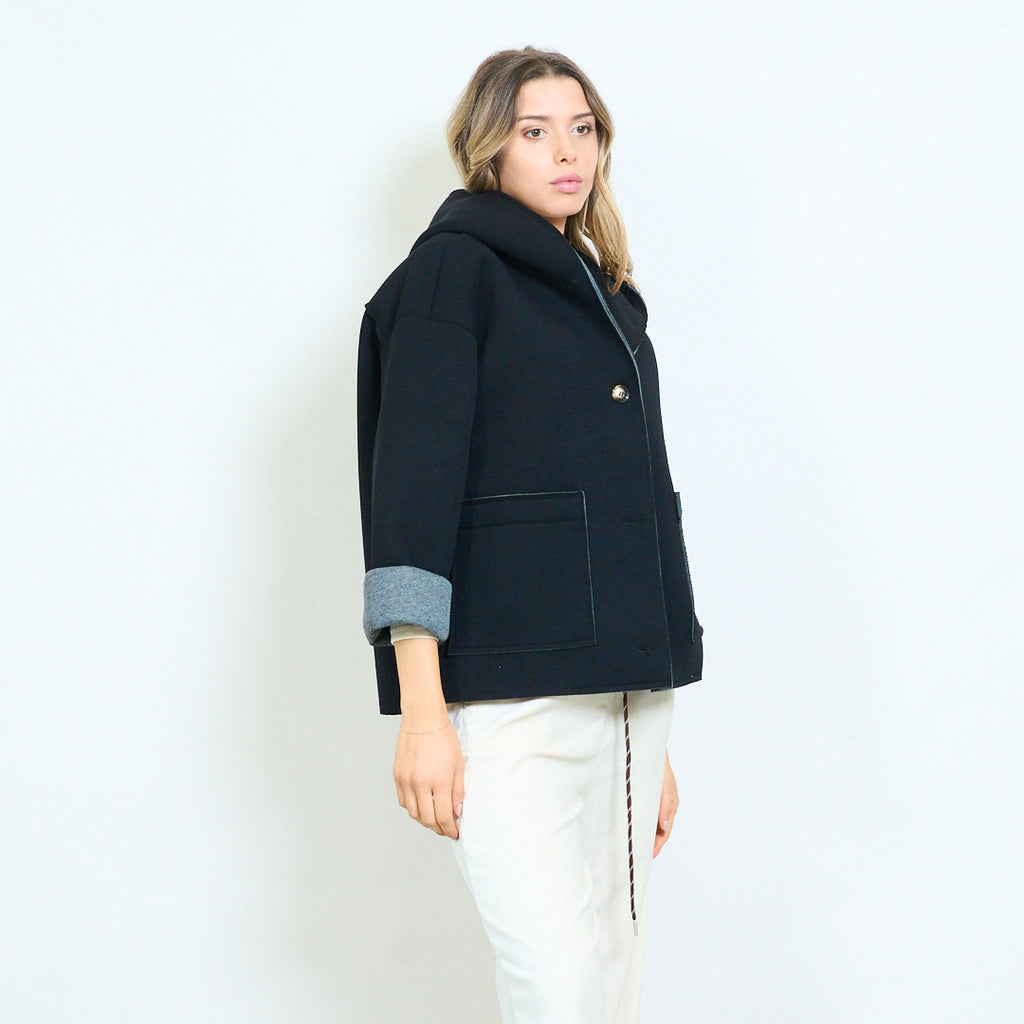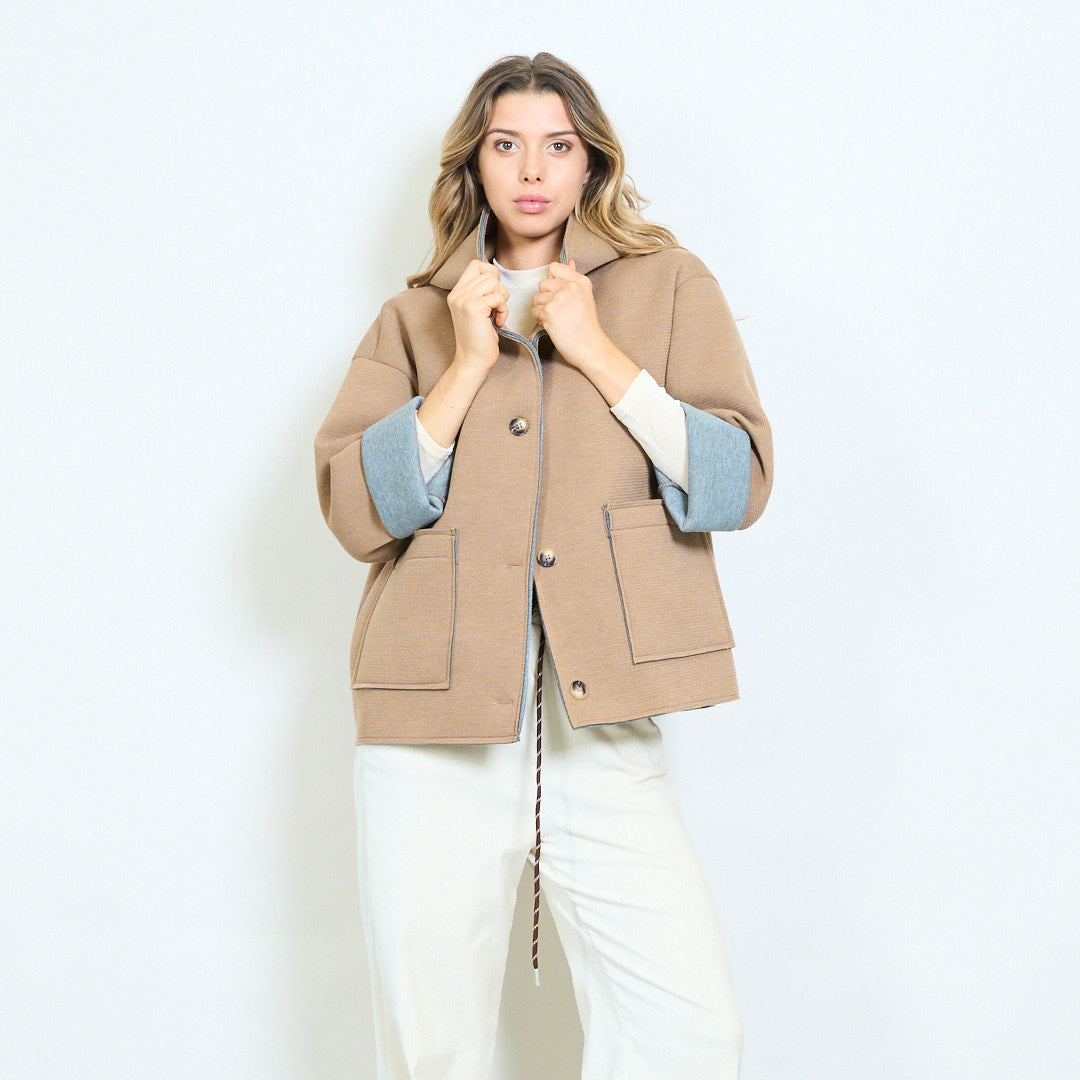 - Acabamento cinza contrastante e punhos dobrados para detalhes elegantes