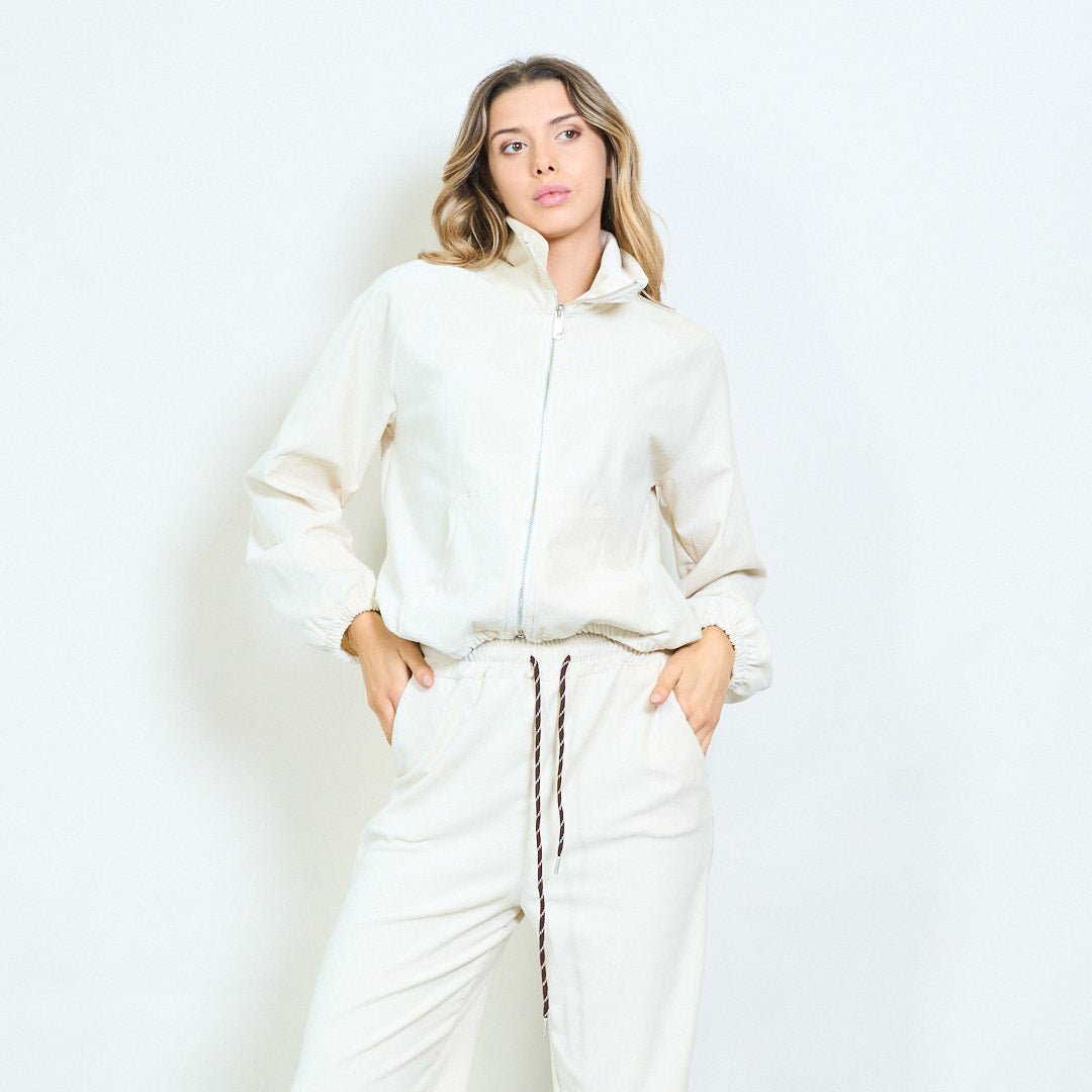 - Design de gola larga adicionando um toque único à clássica jaqueta com zíper