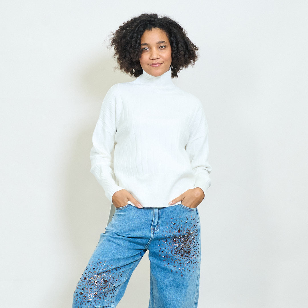 - Design de malha com nervuras aconchegantes com linhas verticais para alongamento