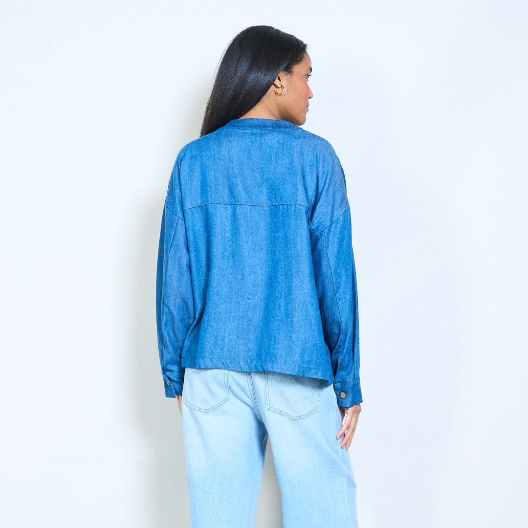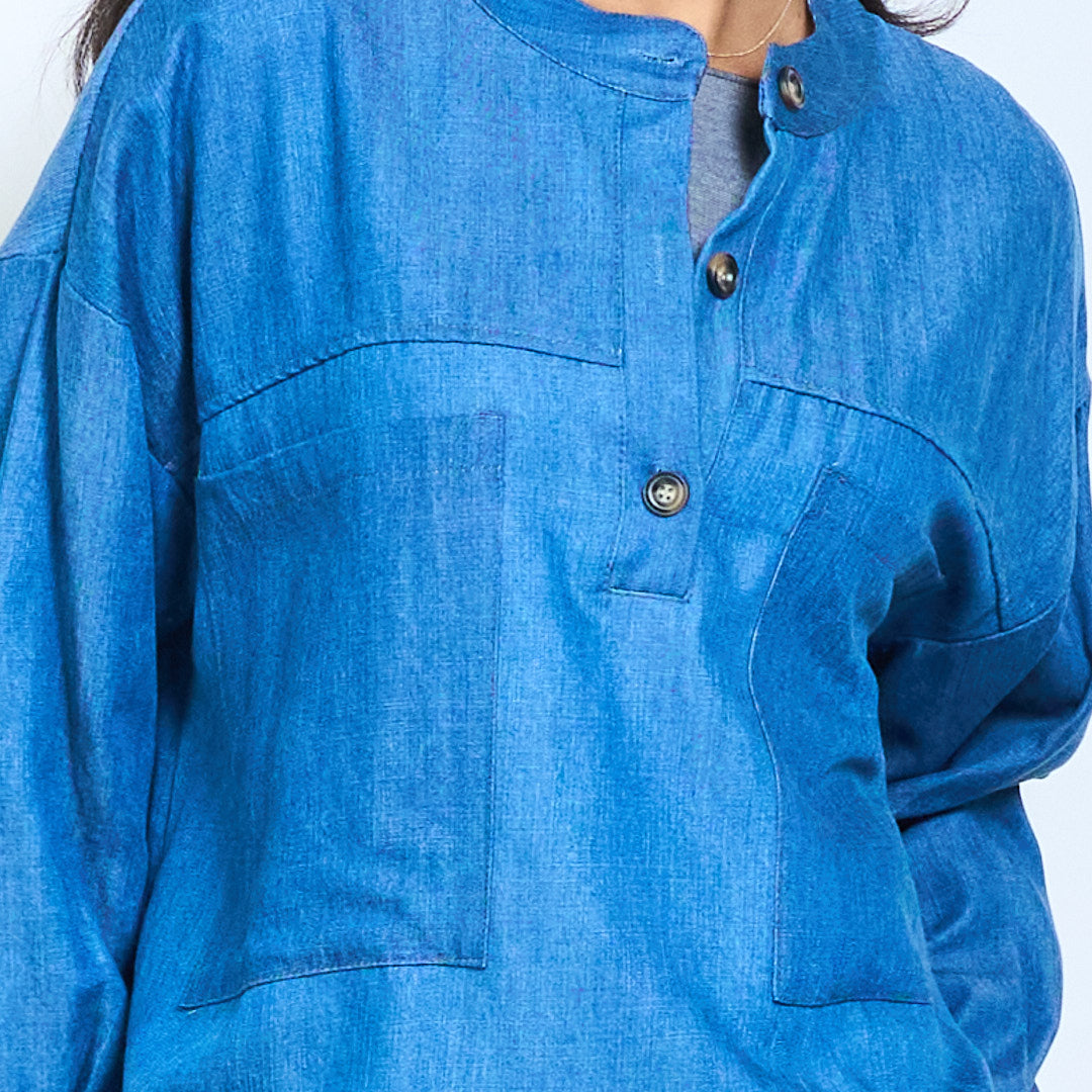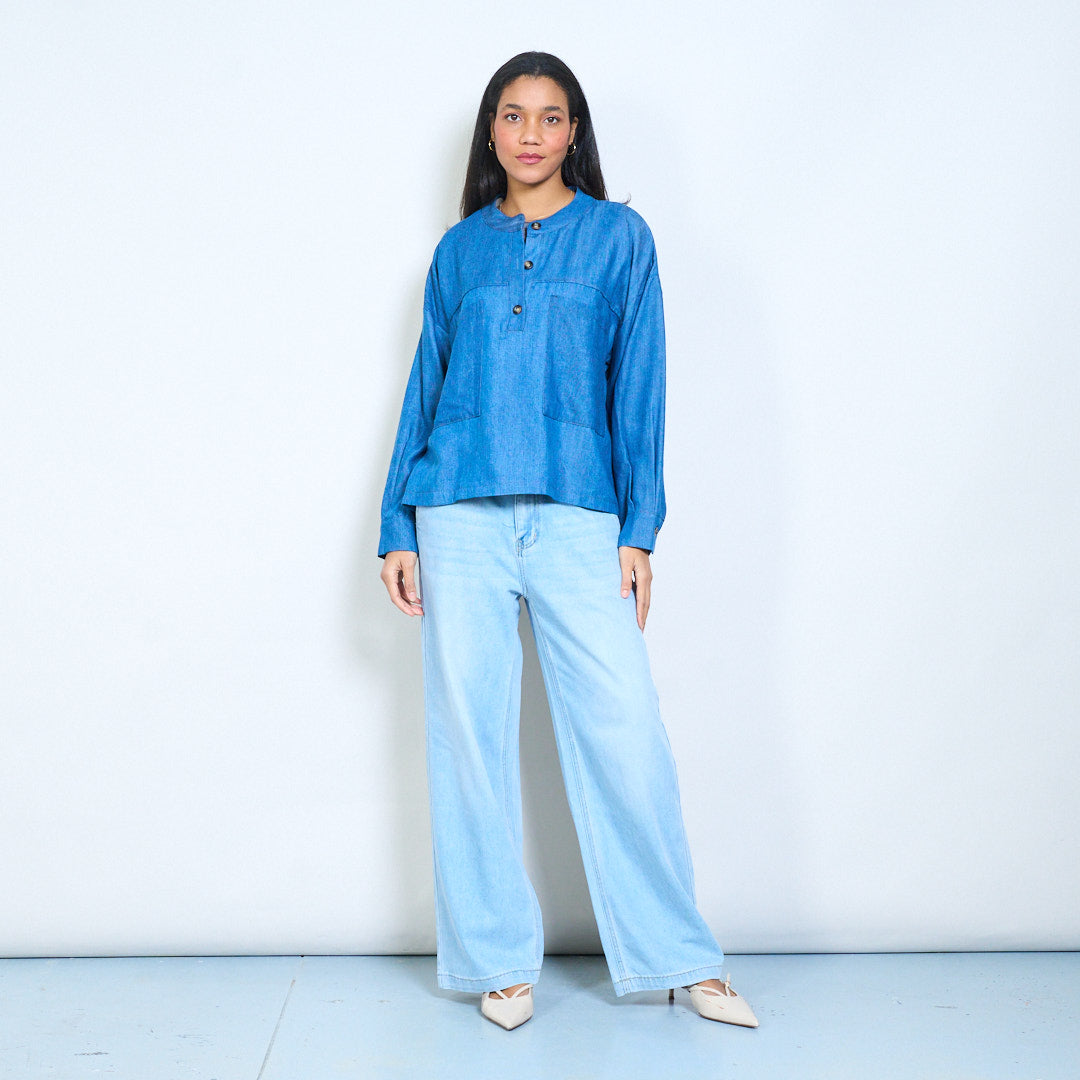 Blusa casual com botão frontal e ajuste relaxado, decote redondo e bolsos no peito no atacado