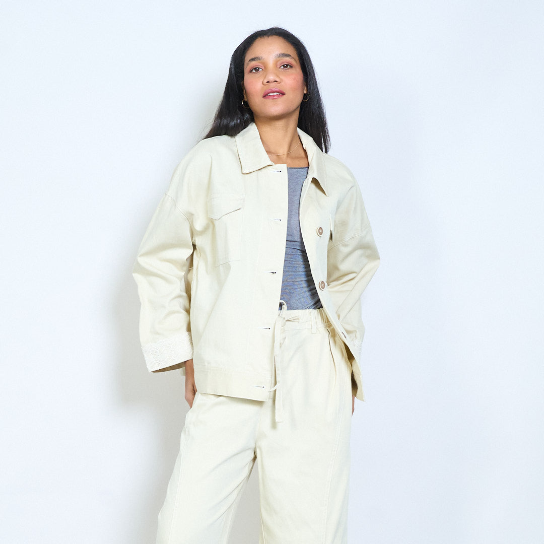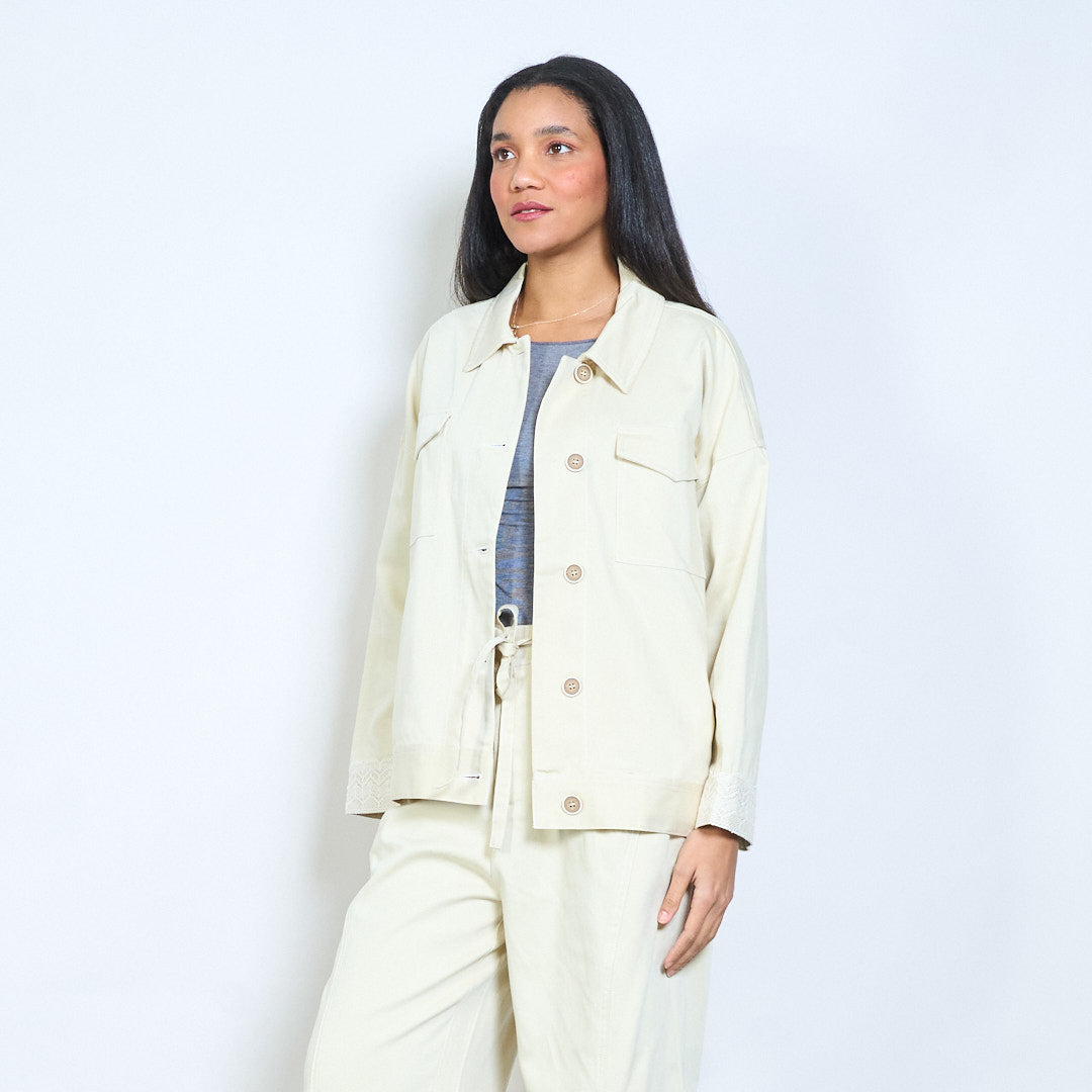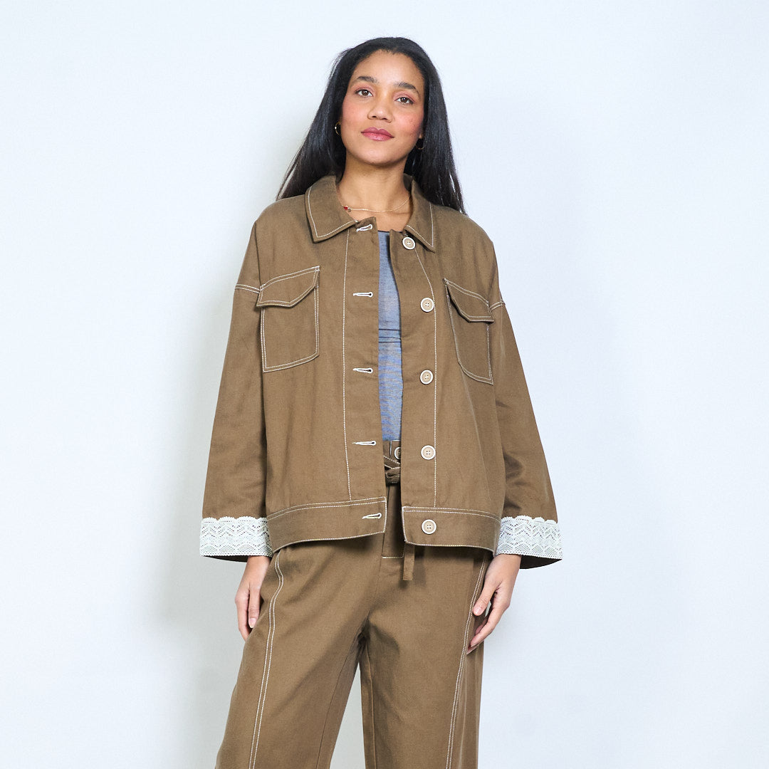 - Bolsos no peito com aba adicionando estrutura e detalhes funcionais