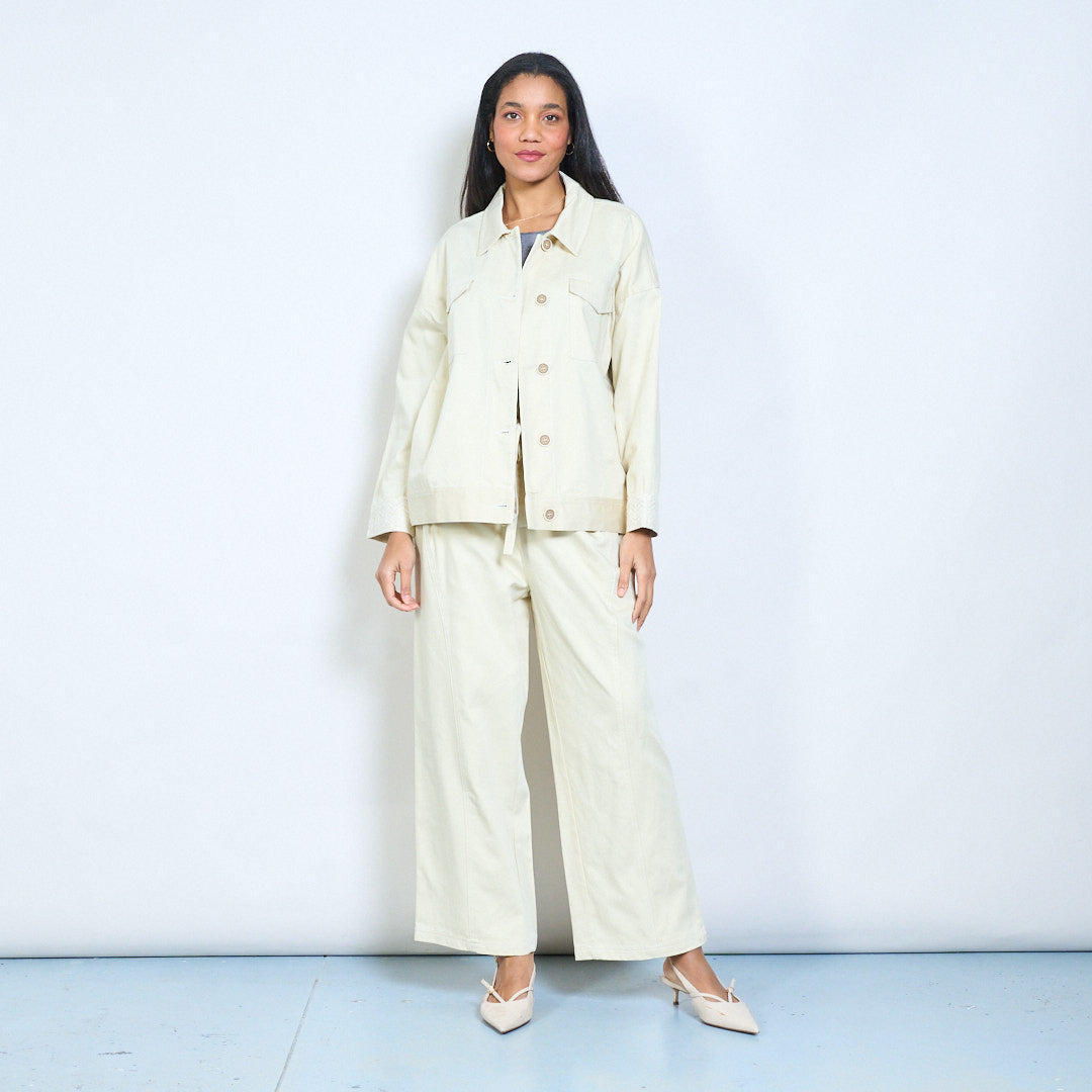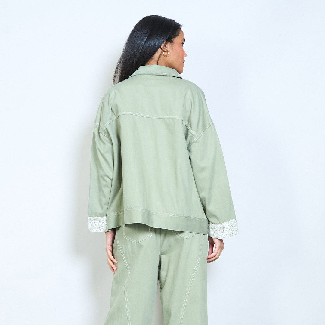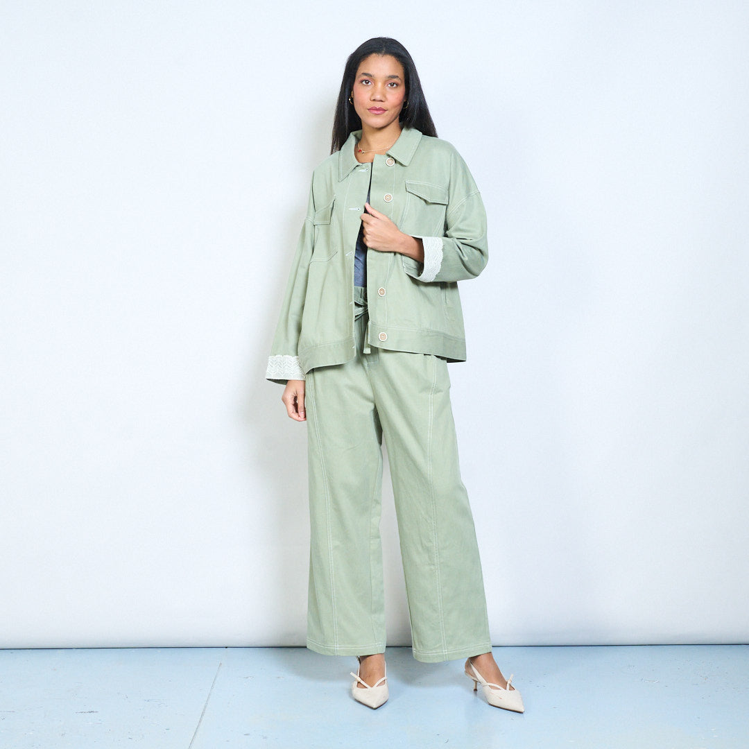 - Bolsos no peito com aba adicionando estrutura e detalhes funcionais