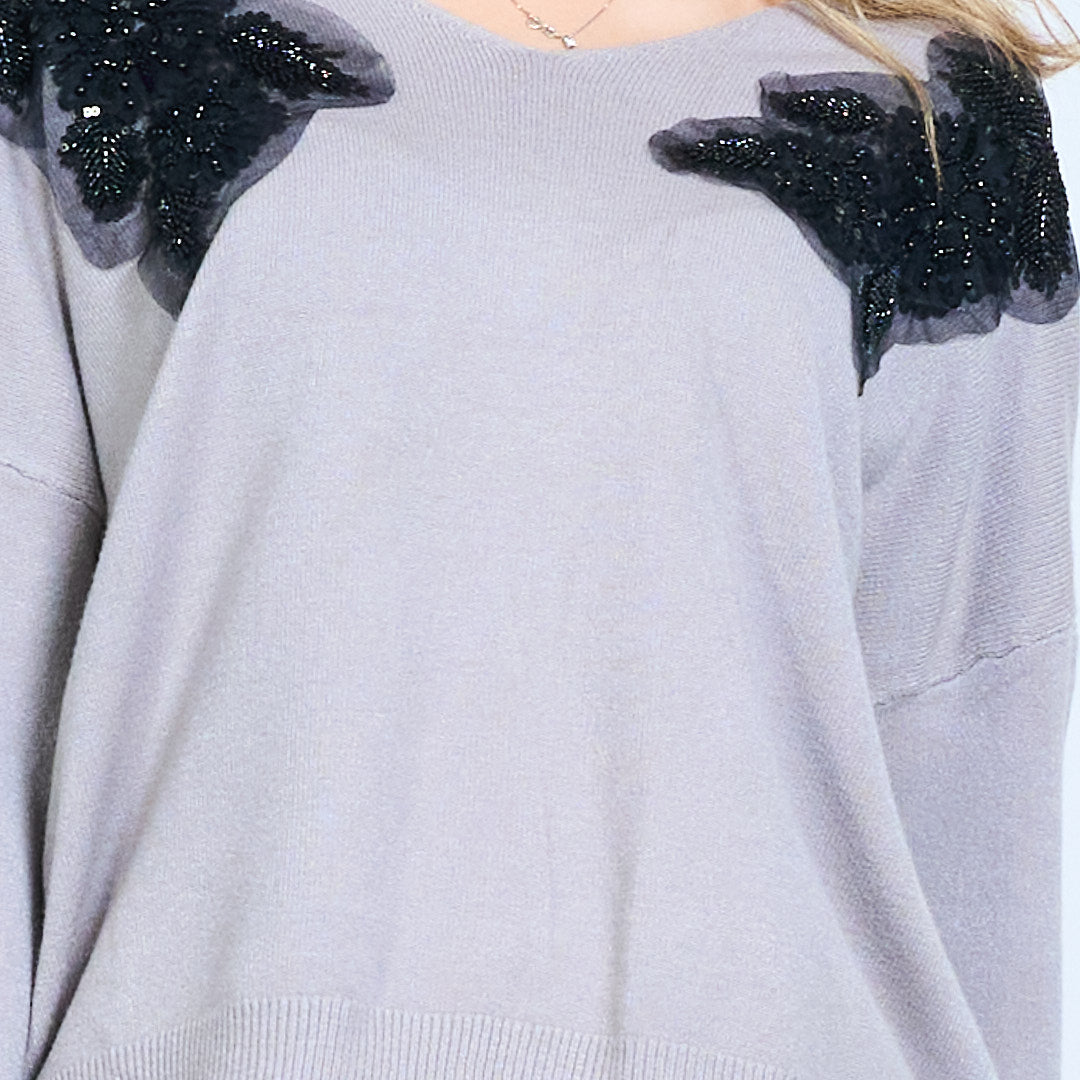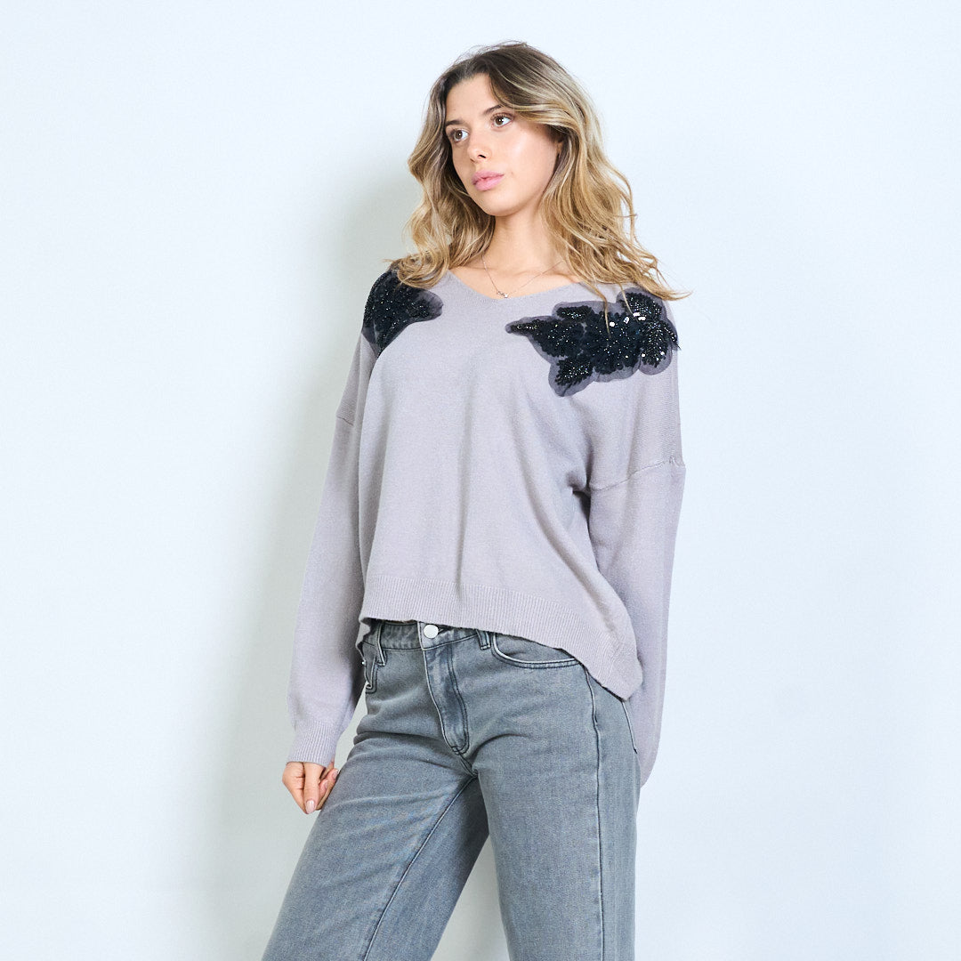 - Suéter com decote em V desenhado com elegantes enfeites florais e lantejoulas