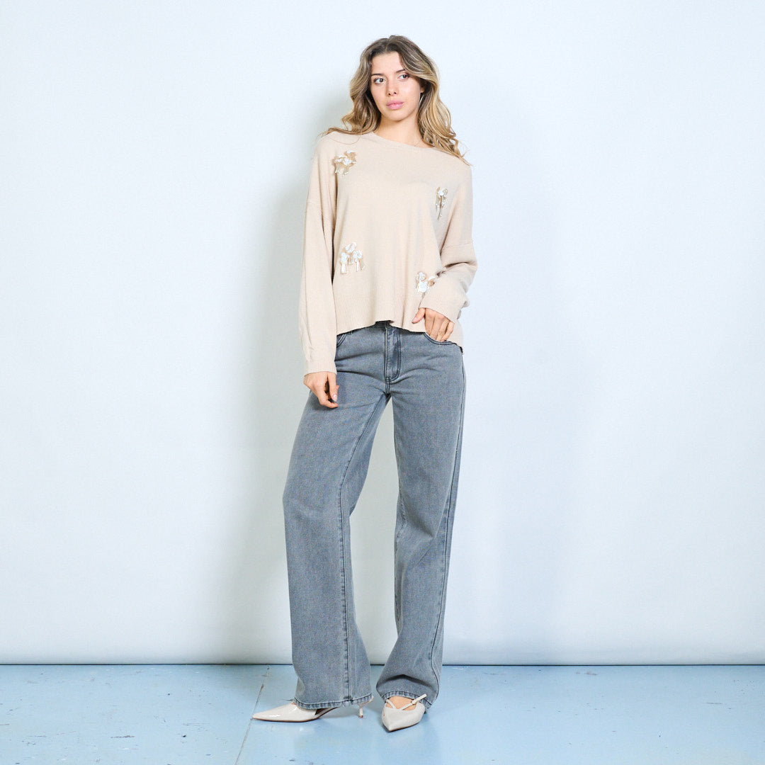 - Suéter de gola redonda detalhado com elegantes enfeites florais de miçangas