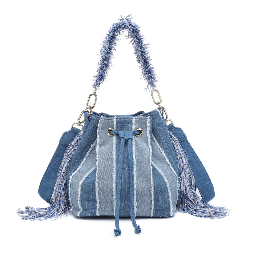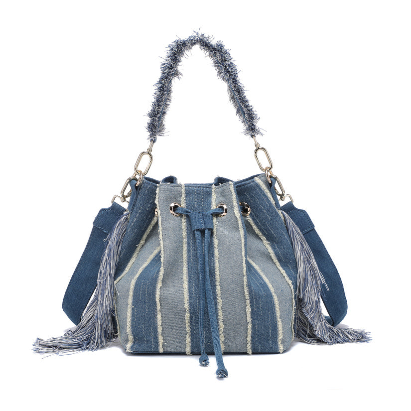 Saco de balde de retalhos de jeans listrado com alça marginal e lados de borla por atacado