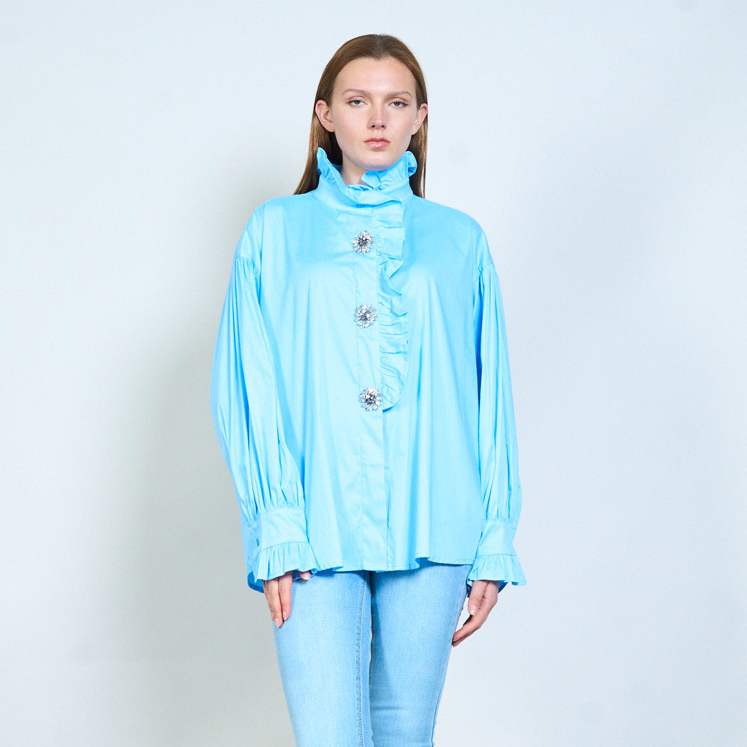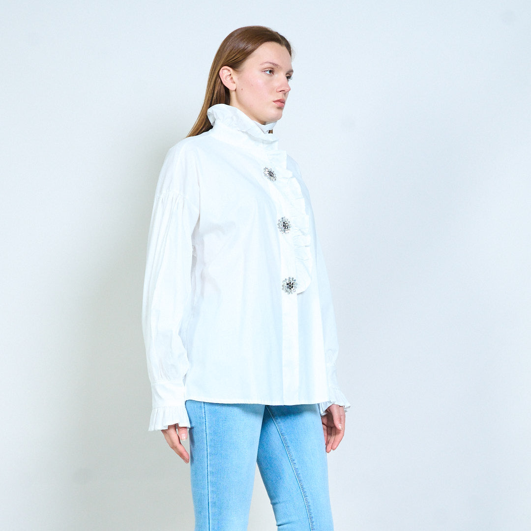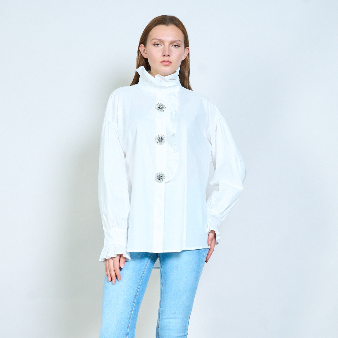 - Blusa elegante com decote alto estruturado e detalhes de babados macios