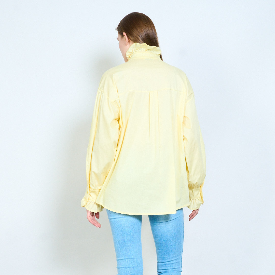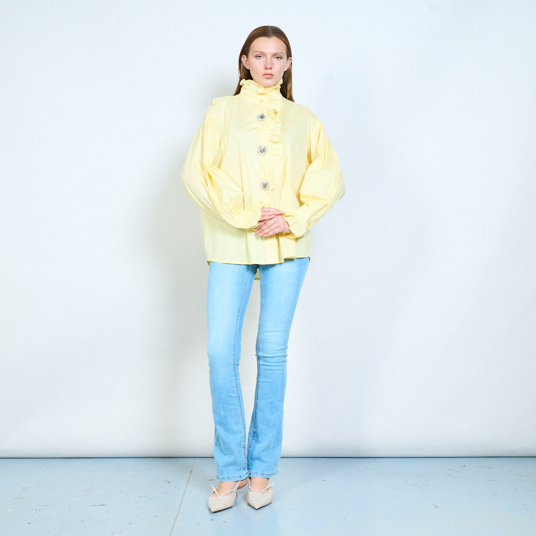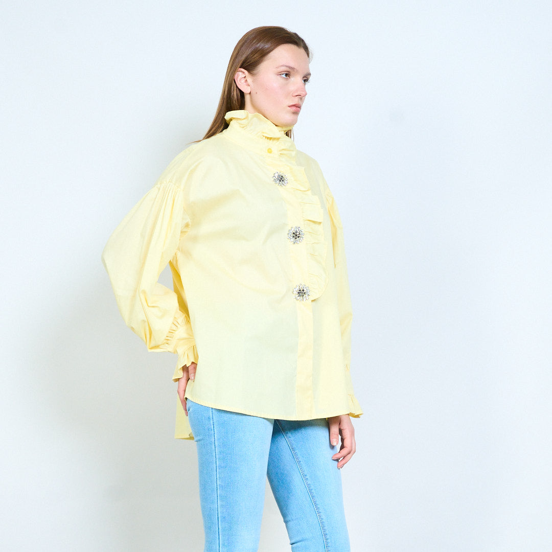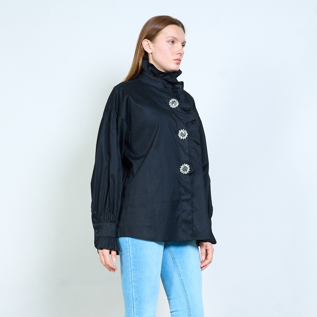 - Blusa elegante com decote alto estruturado e detalhes de babados macios