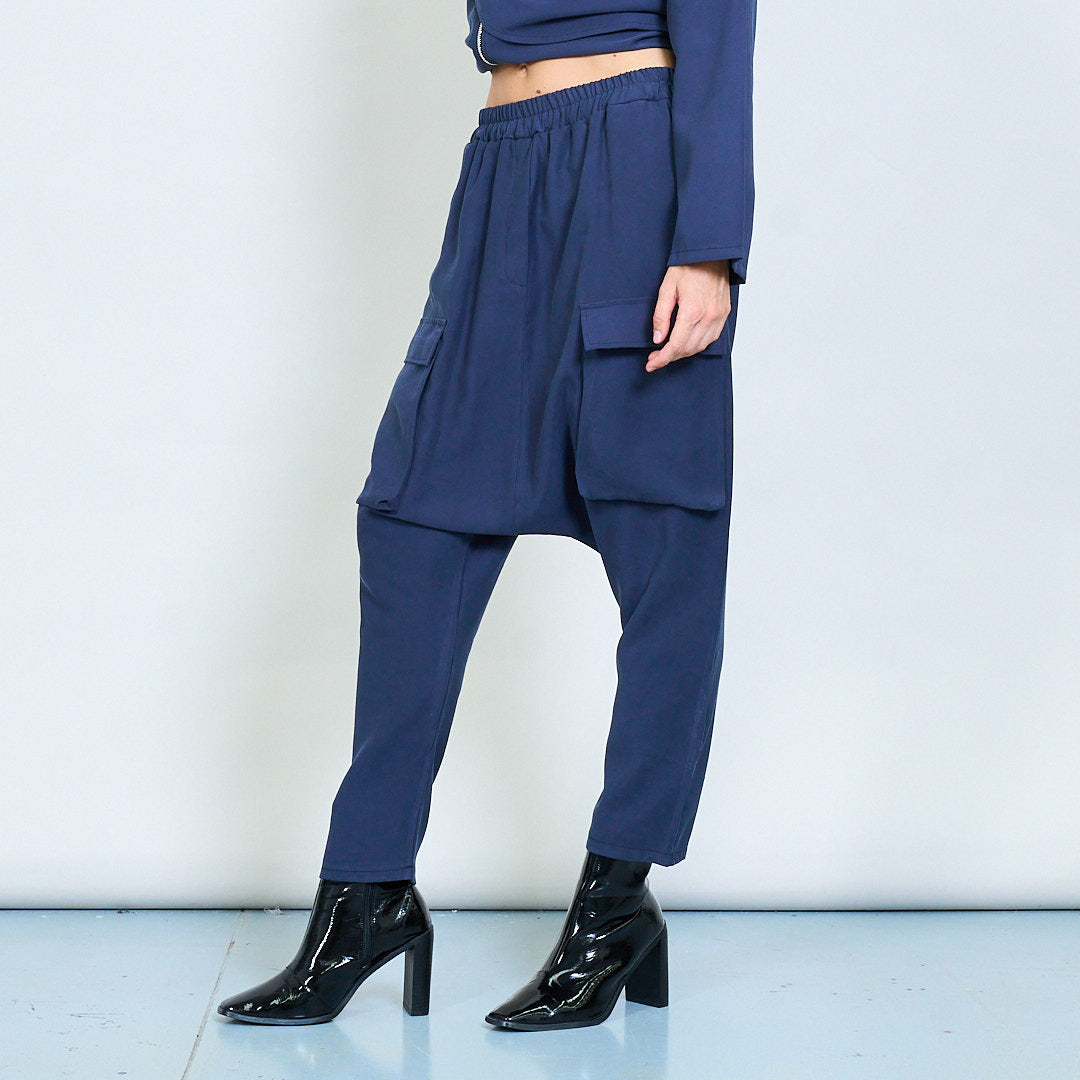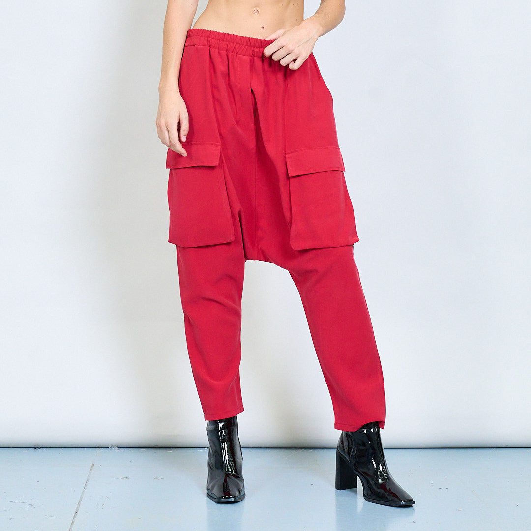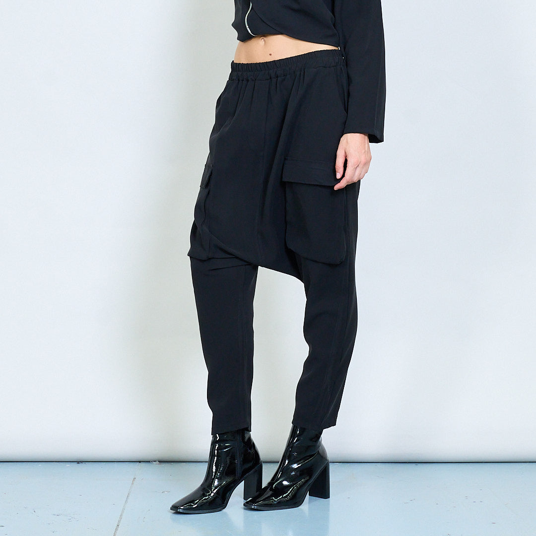 - Grandes bolsos de patch inspirados em utilidade em ambas as pernas