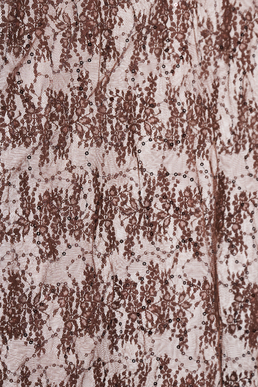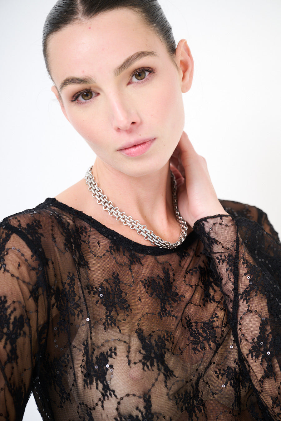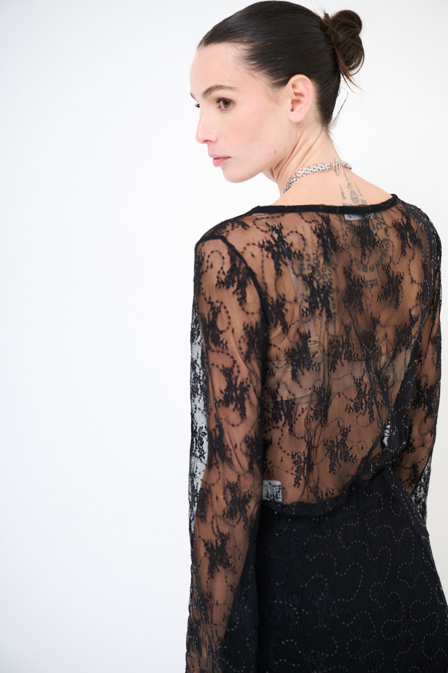 Top de manga flare com lantejoulas embelezadas com renda floral transparente no atacado