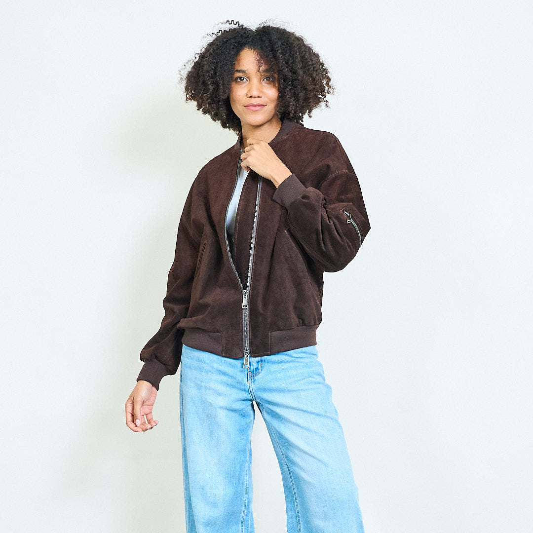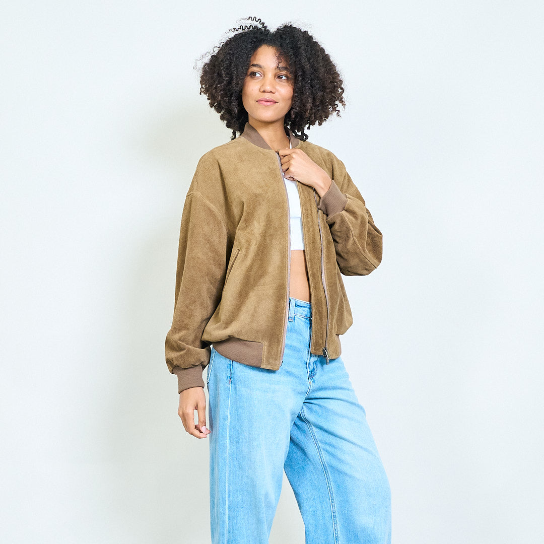 Jaqueta de couro-bombardeiro com efeito de camurça com aparas com nervuras no atacado